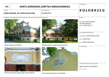 3. Miejscowośd GEZ KARTA ADRESOWA ZABYTKU NIERUCHOMEGO 1. Nazwa 2. Czas powstania ŁAŹNIA MIEJSKA, OB. SZKOŁA MUZYCZNA Początek XX w. 8. Fotografia z opisem wskazującym orientację albo mapa z zaznaczonym stanowiskiem archeologicznym KOŁOBRZEG 4. Adres ul. Jana Frankowskiego 1 78-100 Kołobrzeg dz. nr 159/3 obr. 12 5. Przynależnośd administracyjna województwo Widok budynku od północy zachodniopomorskie powiat kołobrzeski gmina Miasto Kołobrzeg Widok od budynku od północnego-zachodu 6. Formy ochrony 7. Opracowanie karty (autor, data i podpis) Jakub Danielski, 04.08.2015 r. Płycina nad oknem północnego naroża budynku Szczyt elewacji północno-wschodniej 9. Opis Wolnostojący, podpiwniczony budynek w kształcie barbakanu. Korpus dwukondygnacyjny, wzniesiony na rzucie ¾ koła, od frontu zamknięty dwukondygnacyjną fasadą, z trójkątnym szczytem o falistym wykroju - na osi. Ujęty parterowym obejściem, od frontu zakooczonym nieco wyższymi aneksami zamkniętym trójbocznie, wysuniętymi przed lico fasady. Dach korpusu łączy stożek z trójkątną połacią pulpitową - od frontu, zwieoczony kulistą sterczyną. Dach obejścia pulpitowy; aneksy kryte dachami półmansardowymi, wielobocznymi od frontu. Budynek murowany z cegły, strefowo tynkowany; detal ceglany i wypracowany w tynku, dach kryty blachą. Elewacje ujednolicone strefowym zróżnicowaniem materiałów, tynków kolorów i faktur. Cokół tynkowany, kostkowo boniowany, przepruty oknami zamkniętymi odcinkiem łuku. Wyżej ściana ceglana, zwieoczona gzymsem - na wysokości nadproży okien. Okna - prostokątne biforia na tynkowanych parapetach, z nadprożem przeprutym oculusem w ceglanej opasce na łuku w ośli grzbiet (w fasadzie) i prostokątne (obejście); nad oknami w ścianach bocznych aneksów - poziome prostokątne płyciny z motywem muszli i liści akantu. Górna partia ścian obejścia, aneksów i dolnej kondygnacji fasady - tynkowana, żółto malowana, zwieoczona profilowanym gzymsem. Na piętrze korpusu ostrołuczne biforia; dolna częśd piętra tynkowana fakturalnie, zwieoczona ceglanym fryzem konturującym ostrołuki okien; wyżej żółta ściana gładko tynkowana. W zwieoczeniu ścian profilowany fryz i gzyms - detal biało malowany. W fasadzie arkadowe drzwi osadzone w głębokich węgarach, konturowanych gzymsami: ceglanym i profilowanym w tynku, ze zwornikiem z maszkaronem na licu. W partii dachu na osi ściany - trójkątny szczyt o wklęsło - wypukłym wykroju krawędzi, konturowanej szerokim białym gzymsem; na tle żółto malowanej ściany dwie tarcze herbowe w liściastych labrach, z pawim ogonem w hełmie. Otwór kryjący zewnętrzne schody do piwnicy konturowany balustradą tralkową - elewacja płn. 10. Wnioski konserwatorskie Budynek o znacznych walorach zabytkowych. Do zachowania: bryła budynku, kompozycja i podziały elewacji, kształt i dekoracje otworów okiennych, dekoracje architektoniczne i kolorystyka oraz stolarka drzwi, portal oraz podziały okien. Możliwa zmiana wystroju wnętrza z zachowaniem układu wnętrza i klatki schodowej. Budynek po remoncie, stan bardzo dobry. Remonty w uzgodnieniu z Konserwatorem Zabytków. 10. Lokalizacja