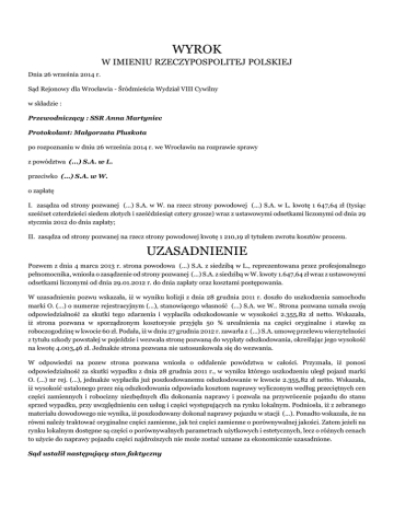 WYROK W IMIENIU RZECZYPOSPOLITEJ POLSKIEJ Dnia 26 września 2014 r. Sąd Rejonowy dla Wrocławia - Śródmieścia Wydział VIII Cywilny w składzie : Przewodniczący : SSR Anna Martyniec Protokolant: Małgorzata Pluskota po rozpoznaniu w dniu 26 września 2014 r. we Wrocławiu na rozprawie sprawy z powództwa (...) S.A. w L. przeciwko (...) S.A. w W. o zapłatę I. zasądza od strony pozwanej (...) S.A. w W. na rzecz strony powodowej (...) S.A. w L. kwotę 1 647,64 zł (tysiąc sześćset czterdzieści siedem złotych i sześćdziesiąt cztery grosze) wraz z ustawowymi odsetkami liczonymi od dnia 29 stycznia 2012 do dnia zapłaty; II. zasądza od strony pozwanej na rzecz strony powodowej kwotę 1 210,19 zł tytułem zwrotu kosztów procesu. UZASADNIENIE Pozwem z dnia 4 marca 2013 r. strona powodowa (...) S.A. z siedzibą w L., reprezentowana przez profesjonalnego pełnomocnika, wniosła o zasądzenie od strony pozwanej (...) S.A. z siedzibą w W. kwoty 1.647,64 zł wraz z ustawowymi odsetkami liczonymi od dnia 29.01.2012 r. do dnia zapłaty oraz kosztami postępowania. W uzasadnieniu pozwu wskazała, iż w wyniku kolizji z dnia 28 grudnia 2011 r. doszło do uszkodzenia samochodu marki O. (...) o numerze rejestracyjnym (...), stanowiącego własność (...) S.A. we W.. Strona pozwana uznała swoją odpowiedzialność za skutki tego zdarzenia i wypłaciła odszkodowanie w wysokości 2.355,82 zł netto. Wskazała, iż strona pozwana w sporządzonym kosztorysie przyjęła 50 % urealnienia na części oryginalne i stawkę za roboczogodzinę w kwocie 60 zł. Podała, iż w dniu 27 grudnia 2012 r. zawarła z (...) S.A. umowę przelewu wierzytelności z tytułu szkody powstałej w pojeździe i wezwała stronę pozwaną do wypłaty odszkodowania, określając jego wysokość na kwotę 4.003,46 zł. Jednakże strona pozwana nie ustosunkowała się do wezwania. W odpowiedzi na pozew strona pozwana wniosła o oddalenie powództwa w całości. Przyznała, iż ponosi odpowiedzialność za skutki wypadku z dnia 28 grudnia 2011 r., w wyniku którego uszkodzeniu uległ pojazd marki O. (...) nr rej. (...), jednakże wypłaciła już poszkodowanemu odszkodowanie w kwocie 2.355,82 zł netto. Wskazała, iż wysokość ustalonego przez nią odszkodowania odpowiada kosztom naprawy wyliczonym według przeciętnych cen części zamiennych i robocizny niezbędnych dla dokonania naprawy i pozwala na przywrócenie pojazdu do stanu sprzed wypadku, przy uwzględnieniu cen usług i części występujących na rynku lokalnym. Podniosła, iż z zebranego materiału dowodowego nie wynika, iż poszkodowany dokonał naprawy pojazdu w stacji (...). Ponadto wskazała, że na równi należy traktować oryginalne części zamienne, jak też części zamienne o porównywalnej jakości. Zatem jeżeli na rynku lokalnym dostępne są części o porównywalnych parametrach użytkowych i estetycznych, lecz o różnych cenach to użycie do naprawy pojazdu części najdroższych nie może zostać uznane za ekonomicznie uzasadnione. Sąd ustalił następujący stan faktyczny W dniu 28 grudnia 2011 r. około godziny 13:45 w R. Rolnej doszło do wypadku komunikacyjnego. Kierujący samochodem marki M. o numerze rejestracyjnym (...) uderzył naczepą w tył pojazdu marki O. (...) o numerze rejestracyjnym (...), należącego do (...) S.A., w wyniku czego samochód marki O. uderzył przodem w murek. Dowód: • Akta szkody, a w nich oświadczenie o zdarzeniu drogowym. (...) S.A. zawiadomił stronę pozwaną o szkodzie w dniu 29 grudnia 2011 r. Pismem z dnia 5 stycznia 2012 r. strona pozwana poinformowała (...) S.A., że przyznane zostało mu odszkodowanie w kwocie 2.355,82 zł. Dowód: • Akta szkody, a nich pismo z dnia 5 stycznia 2012 r. W dniu 27 grudnia 2012 r. strona powodowa zawarła z (...) S.A. z siedzibą we W. umowę przelewu wierzytelności, na podstawie której nabyła od (...) S.A. wierzytelność w stosunku do strony pozwanej wynikającą z dochodzenia należności z tytułu szkody powstałej w pojeździe marki O. (...) o numerze rejestracyjnym (...) powstałej na skutek zdarzenia z dnia 28.12.2011 r. Dowód: • Umowa przelewu wierzytelności k. 19-20. Pismem z dnia 15 stycznia 2013 r. strona powodowa wezwała stronę pozwaną do zapłaty kwoty 1.647,64 zł wraz z ustawowymi odsetkami liczonymi od dnia 29 stycznia 2012 r. do dnia zapłaty. Dowód: • Akta szkody, a w nich pismo z dnia 15 stycznia 2013 r. Pismem z dnia 16 kwietnia 2013 r. strona pozwana poinformowała stronę powodową, iż podtrzymuje dotychczasowe stanowisko w sprawie. Dowód: • Akta szkody, a w nich pismo z dnia 16 kwietnia 2013 r. Dla przeprowadzenia naprawy samochodu marki O. (...) o numerze rej. (...) konieczne jest wykonanie prac polegających na wymontowaniu i zamontowaniu elementów. Do wymiany zakwalifikowane zostały następujące elementy: • krata wlotu powietrza, • lista ozdobna kraty cz, • izolacja komory silnika, • poprzeczka boczna, • zamek burty, • zakończenie burty. Do naprawy zakwalifikowane zostały: • poprzeczka boczna, • zamek burty, • zakończenie burty, • zderzak przedni, • maska silnika, • formowanie mocowań. Do lakierowania zakwalifikowane zostały: • maska silnika, • nakładka górna zderzaka przedniego, • burty 2 sztuki. Koszt naprawy pojazdu według stawek roboczogodzin dla prac mechanicznych, blacharskich i lakierniczych równych 100,00 zł netto i zastosowaniu oryginalnych części zamiennych wynosił 4.003,46 zł netto (4.924,26 zł brutto). Koszt naprawy pojazdu powinien obejmować ceny oryginalnych części zamiennych, bez ich obniżania. Dowód: • Opinia biegłego sądowego z zakresu techniki samochodowej k.79-87. Sąd zważył co następuje Powództwo zasługiwało na uwzględnienie w całości. Fakt powstania szkody w pojeździe marki O. (...) o numerze rejestracyjnym (...), jak również odpowiedzialność strony pozwanej (...) Spółki Akcyjnej z siedzibą w W. co do zasady nie były 