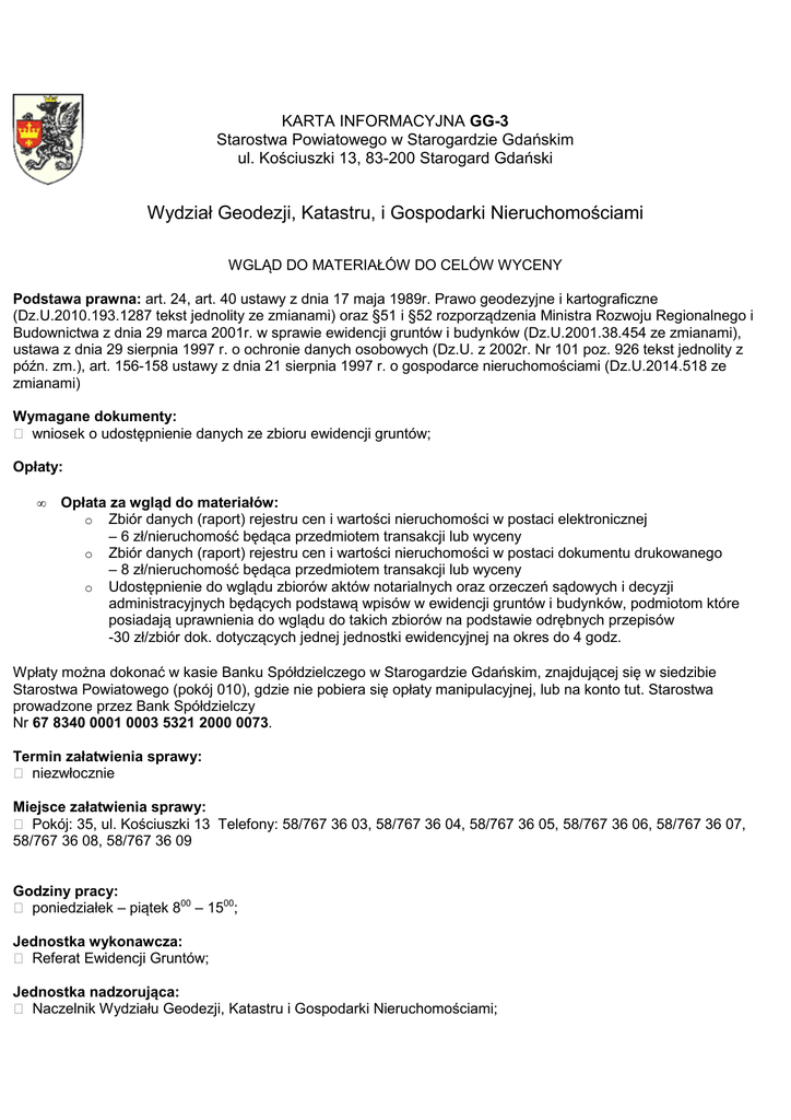 KARTA INFORMACYJNA GG-3 Starostwa Powiatowego w Starogardzie Gdańskim ul. Kościuszki 13, 83-200 Starogard Gdański Wydział Geodezji, Katastru, i Gospodarki Nieruchomościami WGLĄD DO MATERIAŁÓW DO CELÓW WYCENY Podstawa prawna: art. 24, art. 40 ustawy z dnia 17 maja 1989r. Prawo geodezyjne i kartograficzne (Dz.U.2010.193.1287 tekst jednolity ze zmianami) oraz §51 i §52 rozporządzenia Ministra Rozwoju Regionalnego i Budownictwa z dnia 29 marca 2001r. w sprawie ewidencji gruntów i budynków (Dz.U.2001.38.454 ze zmianami), ustawa z dnia 29 sierpnia 1997 r. o ochronie danych osobowych (Dz.U. z 2002r. Nr 101 poz. 926 tekst jednolity z późn. zm.), art. 156-158 ustawy z dnia 21 sierpnia 1997 r. o gospodarce nieruchomościami (Dz.U.2014.518 ze zmianami) Wymagane dokumenty: wniosek o udostępnienie danych ze zbioru ewidencji gruntów; Opłaty: • Opłata za wgląd do materiałów: o Zbiór danych (raport) rejestru cen i wartości nieruchomości w postaci elektronicznej – 6 zł/nieruchomość będąca przedmiotem transakcji lub wyceny o Zbiór danych (raport) rejestru cen i wartości nieruchomości w postaci dokumentu drukowanego – 8 zł/nieruchomość będąca przedmiotem transakcji lub wyceny o Udostępnienie do wglądu zbiorów aktów notarialnych oraz orzeczeń sądowych i decyzji administracyjnych będących podstawą wpisów w ewidencji gruntów i budynków, podmiotom które posiadają uprawnienia do wglądu do takich zbiorów na podstawie odrębnych przepisów -30 zł/zbiór dok. dotyczących jednej jednostki ewidencyjnej na okres do 4 godz. Wpłaty można dokonać w kasie Banku Spółdzielczego w Starogardzie Gdańskim, znajdującej się w siedzibie Starostwa Powiatowego (pokój 010), gdzie nie pobiera się opłaty manipulacyjnej, lub na konto tut. Starostwa prowadzone przez Bank Spółdzielczy Nr 67 8340 0001 0003 5321 2000 0073. Termin załatwienia sprawy: niezwłocznie Miejsce załatwienia sprawy: Pokój: 35, ul. Kościuszki 13 Telefony: 58/767 36 03, 58/767 36 04, 58/767 36 05, 58/767 36 06, 58/767 36 07, 58/767 36 08, 58/767 36 09 Godziny pracy: poniedziałek – piątek 800 – 1500; Jednostka wykonawcza: Referat Ewidencji Gruntów; Jednostka nadzorująca: Naczelnik Wydziału Geodezji, Katastru i Gospodarki Nieruchomościami; Uwagi: Szczegółowych informacji udzielają kierownik i pracownicy Referatu Ewidencji Gruntów.