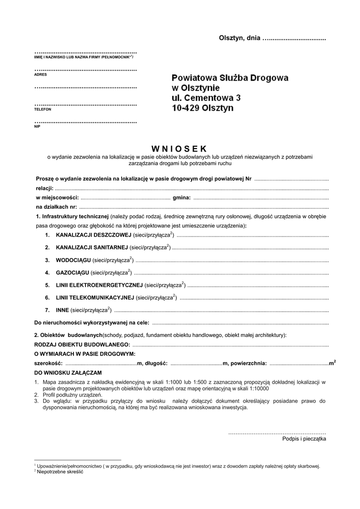 Olsztyn, dnia …............................... ….................................................... IIMIĘ I NAZWISKO LUB NAZWA FIRMY /PEŁNOMOCNIK* 1/ ….................................................... ADRES ….................................................... ….................................................... TELEFON ….................................................... NIP WNIOSEK o wydanie zezwolenia na lokalizację w pasie obiektów budowlanych lub urządzeń niezwiązanych z potrzebami zarządzania drogami lub potrzebami ruchu Proszę o wydanie zezwolenia na lokalizację w pasie drogowym drogi powiatowej Nr ................................................. relacji: .................................................................................................................................................................................... w miejscowości: ........................................................... gmina: ......................................................................................... na działkach nr: .................................................................................................................................................................... 1. Infrastruktury technicznej (należy podać rodzaj, średnicę zewnętrzną rury osłonowej, długość urządzenia w obrębie pasa drogowego oraz głębokość na której projektowane jest umieszczenie urządzenia): 2 1. KANALIZACJI DESZCZOWEJ (sieci/przyłącza ) .................................................................................................... 2. KANALIZACJI SANITARNEJ (sieci/przyłącza ) ....................................................................................................... 3. WODOCIĄGU (sieci/przyłącza ) ............................................................................................................................... 4. GAZOCIĄGU (sieci/przyłącza ) ................................................................................................................................ 5. LINII ELEKTROENERGETYCZNEJ (sieci/przyłącza ) ............................................................................................. 6. LINII TELEKOMUNIKACYJNEJ (sieci/przyłącza ) .................................................................................................. 7. INNE (sieci/przyłącza ) ............................................................................................................................................. 2 2 2 2 2 2 Do nieruchomości wykorzystywanej na cele: .................................................................................................................... 2. Obiektów budowlanych(schody, podjazd, fundament obiektu handlowego, obiekt małej architektury): RODZAJ OBIEKTU BUDOWLANEGO: ................................................................................................................................. O WYMIARACH W PASIE DROGOWYM: szerokość: ...............................................m, długość: .................................. m, powierzchnia: .......................................m DO WNIOSKU ZAŁĄCZAM 1. Mapa zasadnicza z nakładką ewidencyjną w skali 1:1000 lub 1:500 z zaznaczoną propozycją dokładnej lokalizacji w pasie drogowym projektowanych obiektów lub urządzeń oraz mapę orientacyjną w skali 1:10000 2. Profil podłużny urządzeń. 3. Do wglądu: w przypadku przyłączy do wniosku należy dołączyć dokument określający posiadane prawo do dysponowania nieruchomością, na której ma być realizowana wnioskowana inwestycja. ……………………………………………… Podpis i pieczątka 1 2 Upoważnienie/pełnomocnictwo ( w przypadku, gdy wnioskodawcą nie jest inwestor) wraz z dowodem zapłaty należnej opłaty skarbowej. Niepotrzebne skreślić 2