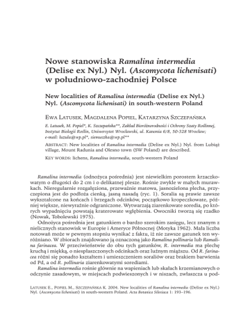 Nowe stanowiska Ramalina intermedia (Delise ex Nyl.) Nyl. (Ascomycota lichenisati) w południowo-zachodniej Polsce New localities of Ramalina intermedia (Delise ex Nyl.) Nyl. (Ascomycota lichenisati) in south-western Poland EWA LATUSEK, MAGDALENA POPIEL, KATARZYNA SZCZEPAŃSKA E. Latusek, M. Popiel*, K. Szczepańska**, Zakład Bioróżnorodności i Ochrony Szaty Roślinnej, Instytut Biologii Roślin, Uniwersytet Wrocławski, ul. Kanonia 6/8, 50-328 Wrocław; e-mail: [email protected]*, [email protected]** ABSTRACT: New localities of Ramalina intermedia (Delise ex Nyl.) Nyl. from Lubiąż village, Mount Radunia and Olesno town (SW Poland) are described. KEY WORDS: lichens, Ramalina intermedia, south-western Poland Ramalina intermedia (odnożyca pośrednia) jest niewielkim porostem krzaczkowatym o długości do 2 cm i o delikatnej plesze. Rośnie zwykle w małych murawkach. Nieregularnie rozgałęziona, przeważnie matowa, jasnozielona plecha, przyczepiona jest do podłoża cienką, jasną nasadą (ryc. 1). Soralia są prawie zawsze wykształcone na końcach i brzegach odcinków, początkowo kropeczkowate, później większe, niewyraźnie odgraniczone. Wytwarzają ziarenkowate soredia, po których wypadnięciu powstają kraterowate wgłębienia. Owocniki tworzą się rzadko (Nowak, Tobolewski 1975). Odnożyca pośrednia jest gatunkiem o bardzo szerokim zasięgu, lecz znanym z nielicznych stanowisk w Europie i Ameryce Północnej (Motyka 1962). Mała liczba notowań może w pewnym stopniu wynikać z faktu, iż nie zawsze gatunek ten wyróżniano. W zbiorach znajdowano ją oznaczoną jako Ramalina pollinaria lub Ramalina farinacea. W przeciwieństwie do obu tych gatunków, R. intermedia ma plechę kruchą i miękką, o niespłaszczonych odcinkach oraz luźnym miąższu. Od R. farinacea różni się ponadto kształtem i umieszczeniem soraliów oraz brakiem barwienia od Pd, a od R. pollinaria ziarenkowatymi sorediami. Ramalina intermedia rośnie głównie na wapieniach lub skałach krzemianowych o odczynie zasadowym, w miejscach podwieszonych i w niszach, zwłaszcza u podLATUSEK E., POPIEL M., SZCZEPAŃSKA K. 2004. New localities of Ramalina intermedia (Delise ex Nyl.) Nyl. (Ascomycota lichenisati) in south-western Poland. Acta Botanica Silesiaca 1: 193–196. 194 Ewa Latusek, Magdalena Popiel, Katarzyna Szczepańska stawy ścian i bloków skalnych, niekiedy też na korze drzew. Dogodnym siedliskiem są dla niej także stare, ceglane mury zabytkowych budowli, o ekspozycji zapewniającej odpowiednie zacienienie. Gatunek ten umieszczony jest na „Czerwonej liście porostów wymarłych i zagrożonych w Polce” (Cieśliński i in. 2003), w kategorii CR (na granicy wymarcia). Ramalina intermedia jest gatunkiem rzadkim w Polsce. Jej stanowiska znane są głównie z Karpat, m.in. z Pienin (Kiszka 1997), Beskidu Wyspowego (Nowak 1998), Gorców (Czarnota Ryc. 1. Pokrój plechy Ramalina intermedia ze 2000) oraz wyżyn: Małopolskiej (Nostanowiska w Lubiążu (rys. Katarzyna wak 1974, Cieśliński, Toborowicz Szczepańska) 1989) i Śląsko-Krakowskiej (Nowak Fig. 1. Thallus of Ramalina intermedia from 1961, Czyżewska 1978). W północnej Lubiąż village (painted by Katarzyna Polsce zanotowano ją dotychczas na Szczepańska) pięciu stanowiskach: na Wybrzeżu Staropruskim (Sągin 1998), Pojezierzu Iławskim (Kukwa 2000) oraz na Równinie Bielskiej (M. Kukwa – informacja ustna). Znalezione stanowiska są pierwszymi w południowo-zachodniej części Polski; w nawiasach podano ich lokalizacje na mapie ATPOL w modyfikacji lichenologicznej (por. Cieśliński, Fałtynowicz 1993). Na stanowisku w Lubiążu (Pradolina Wrocławska) R. intermedia porasta północną ścianę pałacu opata z przełomu XVII i XVIII w., wchodzącego w skład największego i jednego z najstarszych kompleksów klasztornych na Śląsku (ryc. 2; kwadrat ATPOL Eb25; leg. M. Popiel, 14.10.2000). Zdrowe, dobrze wykształcone plechy występują tu bardzo licznie niemal na całej długości ściany północnej (ponad 100 m), do wysokości około 2 m. Rośnie tu zarówno na cegle, spoiwie, jak i tynku. Największe skupienia tworzy pod parapetami okiennymi, w miejscach zacienionych. Kolejne stanowisko zanotowano na Przedgórzu Sudeckim, na górze Radunia (573 m n.p.m.) – drugim co do wielkości szczycie Masywu Ślęży (ryc. 2; kwadrat ATPOL Ec77; leg. K. Szczepańska, 04.04.2004). Gatunek ten znaleziono na odsłoniętych, niewielkich blokach serpentynitu o ekspozycji południowo-zachodniej, na znajdującej się tuż pod szczytem polanie. Zanotowano kilkadziesiąt niewielkich plech rosnących tuż przy ziemi, u podstawy zacienionych przez roślinność skał. Trzecie stanowisko znalezione zostało na obszarze mezoregionu Próg Woźnicki w miejscowości Olesno (ryc. 2; kwadrat ATPOL Ec69; leg. E. Latusek, 21.10.2000). Mało liczne i drobne plechy rosną tu na terenie cmentarza przy kościele św. Anny. Porastają one eksponowane na północ i północny zachód podmurowanie XIX-wiecznej kaplicy do wysokości kilkunastu centymetrów. Nowe stanowiska Ramalina intermedia (Delise ex Nyl.) Nyl. (Ascomycota lichenisati)... 195 Ryc. 2. Lokalizacja stanowisk Ramalina intermedia w południowo-zachodniej Polsce 1 – Lubiąż, 2 – g. Radunia, 3 – Olesno Fig. 2. Position of localities of Ramalina intermedia in the south-western Poland 1 – Lubiąż, 2 – Mount Radunia, 3 – Olesno Okazy zielnikowe znajdują się w herbarium Zakładu Systematyki i Fitosocjologii Uniwersytetu Wrocławskiego. Podziękowania. Dziękujemy prof. Dr. hab. Wiesławowi Fałtynowiczowi za sprawdzenie oznaczeń i uwagi oraz dr Marii Kossowskiej za pomoc w sporządzeniu mapy. Literatura CIEŚLIŃSKI S., CZYŻEWSKA K., FABISZEWSKI J. 2003. Czerwona lista porostów wymarłych i zagrożonych w Polsce. – W: CZYŻEWSKA K. (red.), Zagrożenie porostów w Polsce. – Monogr. Bot. 91: 14–49. CIEŚLIŃSKI S., FAŁTYNOWICZ W. (red.) 1993. Atlas of geographical distribution of 