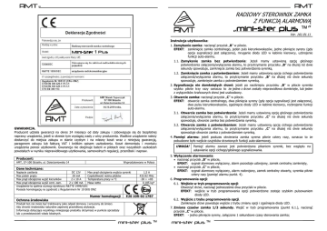 - - RADIOWY STEROWNIK ZAMKA Z FUNKCJĄ ALARMOWĄ „minimini-ster plus ™” Ver. 161.01.11 GWARANCJA. Producent udziela gwarancji na okres 24 miesięcy od daty zakupu i zobowiązuje się do bezpłatnej naprawy urządzenia, jeŜeli w okresie tym wystąpią wady z winy producenta. Wadliwe urządzenie naleŜy dostarczyć do miejsca zakupu w stanie czystym i na własny koszt wraz z niniejszą gwarancją, paragonem zakupu lub fakturą VAT i krótkim opisem uszkodzenia. Koszt demontaŜu i montaŜu urządzenia ponosi uŜytkownik. Gwarancja nie obejmuje baterii w pilotach oraz wszystkich uszkodzeń powstałych w wyniku nieprawidłowego uŜytkowania, samowolnych regulacji, przeróbek i napraw. Producent: AMT, 57-100 Strzelin, ul. DzierŜoniowska 14 Wyprodukowano w Polsce Dane techniczne: Napięcie zasilania DC 12V Max prąd obciąŜenia wyjścia syrenki Max pobór prądu 20 mA Częstotliwość nośna pilotów Max prąd obciąŜenia wyjść kierunków 2 x 10 A Temperatura pracy w oC Max prąd obciąŜenia wyjść cent. zam. 2 x 100 mA Masa netto Urządzenie to spełnia wymogi dyrektywy R&TTE 1999/5/EC Posiada homologację na zgodność z Regulaminem Nr 10 EKG ONZ Numer homologacji 1,5 A 433.92 MHz -30 ÷ +85 0.185 kg* E20 10R-02 1787 Ochrona środowiska Produkt ten nie moŜe być traktowany jako odpad domowy i wrzucony do śmieci. Aby chronić środowiska naturalne zapewnij prawidłową utylizacje. Informacje dotyczące recyklingu niniejszego produktu otrzymasz w punkcie sprzedaŜy lub u przedstawicieli władz lokalnych. mini-ster plus ™ Instrukcja uŜytkownika: 1. Zamykanie zamka: nacisnąć przycisk „B” w pilocie. EFEKT: zamknięcie zamka centralnego, jeden puls kierunkowskazów, jedno piknięcie syreny (gdy opcja sygnalizacji jest załączona), mruganie diody LED w kabinie kierowcy, uzbrojenie funkcji auto-alarmu. 1.1. Zamykanie zamka bez potwierdzenia: JeŜeli mamy ustawioną opcję głośnego potwierdzenia załączenia/wyłączenia alarmu, to przytrzymanie przycisku „B” na dłuŜej niŜ dwie sekundy spowoduje, zamknięcie zamka bez potwierdzenia syrenką. 1.2. Zamknięcie zamka z potwierdzeniem: JeŜeli mamy ustawioną opcję cichego potwierdzenia załączenia/wyłączenia alarmu, to przytrzymanie przycisku „B” na dłuŜej niŜ dwie sekundy spowoduje, zamknięcie zamka z potwierdzeniem syrenką. 2. Sygnalizacja nie domkniętych drzwi: jeŜeli po naciśnięciu przycisku „B” w pilocie syrenka szybko piknie trzy razy oznacza to Ŝe jedne z drzwi zostały nieprawidłowo domknięte, lub jeden z wyłączników krańcowych drzwi jest uszkodzony. 3. Otwarcie zamka: nacisnąć przycisk „C” w pilocie. EFEKT: otwarcie zamka centralnego, dwa piknięcia syreny (gdy opcja sygnalizacji jest załączona), dwa pulsy kierunkowskazów, zgaśnięcie diody LED w kabinie kierowcy, rozbrojenie funkcji auto-alarmu. 3.1. Otwarcie zamka bez potwierdzenia: JeŜeli mamy ustawioną opcję głośnego potwierdzenia załączenia/wyłączenia alarmu, to przytrzymanie przycisku „C” na dłuŜej niŜ dwie sekundy spowoduje, otwarcie zamka bez potwierdzenia syrenką. 3.2. Otwarcie zamka z potwierdzeniem: JeŜeli mamy ustawioną opcję cichego potwierdzenia załączenia/wyłączenia alarmu, to przytrzymanie przycisku „C” na dłuŜej niŜ dwie sekundy spowoduje otwarcie zamka z potwierdzeniem syrenką. 4. Pamięć alarmu: jeŜeli podczas otwierania zamka syrena piknie cztery razy, oznacza to Ŝe pobudzone było wejście czujników drzwiowych funkcji auto-alarmowej. UWAGA! Pamięć alarmu zawsze jest potwierdzana pikaniem syrenki, bez względu na ustawienie opcji cichego/głośnego sygnalizowania. 5. Wyłączenie alarmowania: • nacisnąć przycisk „B” w pilocie, EFEKT: sygnał alarmowy wyłączony, alarm pozostaje uzbrojony, zamek centralny zamknięty, • nacisnąć przycisk „C” w pilocie, EFEKT: sygnał alarmowy wyłączony, alarm rozbrojony, zamek centralny otwarty, syrenka piknie cztery razy (pamięć alarmu punkt. 4). 6. Programowania opcji: 6.1. Wejście w tryb programowania opcji: Otworzyć drzwi, nacisnąć jednocześnie dwa przyciski w pilocie. EFEKT: wejście w tryb programowania opcji potwierdzone zostaje szybkim pulsowaniem diody LED. 6.2. Wyjście z trybu programowania opcji. Zamknięcie drzwi powoduje wyjście z trybu zmiany opcji i zgaśnięcie diody LED. 7. Zmiana czasów zamka 1/3 sekundy. Wejść w tryb programowania (punkt 6.1.), nacisnąć przycisk „C” w pilocie. EFEKT: - jedno piknięcie syreny, załączone 1 sekundowe czasy sterowania zamka; mini-ster plus ™ - kierunkowskazy antena B3 B2 zielony zielony B1 niebieski B4 czerwony +12V Masa czarny - trzy piknięcia syreny, załączone 3 sekundowe czasy sterowania zamka. 8. Wybór cichego lub głośnego potwierdzenia syrenką zamykania i otwierania zamka. Wejść w tryb programowania ( punkt 6.1.), nacisnąć przycisk „B” w pilocie. EFEKT: - jedno piknięcie syreny, załączenie potwierdzania syrenką; - dwa piknięcia syreny, wyłączenie potwierdzania syrenką. Wyjść z trybu programowania (punkt 6.2.). 9. Włączenie/wyłączenie opcji dozbrajania. Wejść w tryb programowania (punkt 6.1.), nacisnąć jednocześnie „B” i „C” w pilocie. EFEKT: - jedno piknięcie syreny, załączenie opcji dozbrajania; - dwa piknięcia syreny, wyłączenie opcji dozbrajania. Wyjść z trybu programowania (punkt 6.2.) Masa Masa szary UWAGA! Wszystkie ustawienia są zapamiętywane po odłączeniu zasilania. biały (otwieranie) brązowy (zamykanie) B C syrena Zespół wyłączników drzwiowych (wyzwalanie masą) +12V A Podłączyć do +12V lub masy, w zaleŜności od tego co trzeba podać na otwieranie. 87 87a Podłączyć do przewodu który steruje otwieraniem P052 86 85 30 P049 Podłączyć do +12V lub masy, w zaleŜności od tego co trzeba podać na zamykanie. 87 87a Podłączyć do przewodu który steruje zamykaniem 86 85 30 Rys. 2. – Podłączenie sterownika do przekaźników. kierunkowskazy antena K245 V055 K185-2 