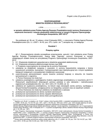 Projekt z dnia 20 grudnia 2012 r. ROZPORZĄDZENIE 1) MINISTRA ROZWOJU REGIONALNEGO z dnia …………………………2012 r. w sprawie udzielania przez Polską Agencję Rozwoju Przedsiębiorczości pomocy finansowej na wspieranie tworzenia i rozwoju gospodarki elektronicznej w ramach Programu Operacyjnego 2) Innowacyjna Gospodarka, 2007-2013 Na podstawie art. 6b ust. 10 ustawy z dnia 9 listopada 2000 r. o utworzeniu Polskiej Agencji Rozwoju 3) Przedsiębiorczości (Dz. U. z 2007 r. Nr 42, poz. 275, z późn. zm. ) zarządza się, co następuje: Rozdział 1 Przepisy ogólne § 1. 1. Rozporządzenie określa szczegółowe przeznaczenie, warunki i tryb udzielania przez Polską Agencję Rozwoju Przedsiębiorczości, zwaną dalej "Agencją", pomocy finansowej w ramach następujących działań ósmej osi priorytetowej Programu Operacyjnego Innowacyjna Gospodarka, 20072013: 1) 8.1. Wspieranie działalności gospodarczej w dziedzinie gospodarki elektronicznej; 2) 8.2. Wspieranie wdrażania elektronicznego biznesu typu B2B. 2. Przepisów rozporządzenia nie stosuje się do pomocy finansowej: 1) udzielanej na działalność związaną z wywozem, tj. pomocy bezpośrednio związanej z ilością wywożonych produktów, tworzeniem i funkcjonowaniem sieci dystrybucyjnej lub z innymi wydatkami bieżącymi związanymi z prowadzeniem działalności wywozowej; 2) uwarunkowanej pierwszeństwem użycia towarów produkcji krajowej w stosunku do towarów sprowadzanych z zagranicy. 3. Pomoc finansowa nie może być: 1) udzielona przedsiębiorcy spełniającemu kryteria zagrożonego przedsiębiorcy w rozumieniu pkt 9-11 Wytycznych wspólnotowych dotyczących pomocy państwa w celu ratowania i restrukturyzacji zagrożonych przedsiębiorstw (Dz. Urz. UE C 244 z 01.10.2004, str. 2); 2) udzielona ani wypłacona przedsiębiorcy, na którym ciąży obowiązek zwrotu pomocy, wynikający z decyzji Komisji Europejskiej, uznającej pomoc za niezgodną z prawem oraz ze wspólnym rynkiem. 4. Pomoc finansowa nie może być udzielona na działalność w zakresie: 1) produkcji lub wprowadzania do obrotu wyrobów tytoniowych; 2) produkcji lub wprowadzania do obrotu napojów alkoholowych; 3) produkcji lub wprowadzania do obrotu treści pornograficznych; 1) Zgodnie z art. 25 pkt 1 w związku z art. 18 pkt 1 ustawy z dnia 6 grudnia 2006 r. o zasadach prowadzenia polityki rozwoju (Dz. U. z 2009 r. Nr 84, poz. 712 i Nr 157, poz. 1241, z 2011 r. Nr 279, poz. 1644 oraz z 2012 r. poz. 1237) minister właściwy do spraw rozwoju regionalnego jest Instytucją Zarządzającą Programem Operacyjnym Innowacyjna Gospodarka, 2007-2013. Minister Rozwoju Regionalnego kieruje działem administracji rządowej - rozwój regionalny, na podstawie § 1 ust. 2 rozporządzenia Prezesa Rady Ministrów z dnia 18 listopada 2011 r. w sprawie szczegółowego zakresu działania Ministra Rozwoju Regionalnego (Dz. U. Nr 248, poz. 1487). 2) Tekst Programu Operacyjnego Innowacyjna Gospodarka, 2007-2013 został zaakceptowany decyzją Komisji Europejskiej nr K(2007)4562 z dnia 1 października 2007 r. w sprawie przyjęcia Programu Operacyjnego Innowacyjna Gospodarka w ramach pomocy wspólnotowej z Europejskiego Funduszu Rozwoju Regionalnego objętego celem "konwergencja" w Polsce oraz zmieniony decyzją Komisji Europejskiej nr K(2011) 9788 z dnia 22 grudnia 2011 r. i przyjęty uchwałą Rady Ministrów z dnia 30 października 2007 r. w sprawie przyjęcia Programu Operacyjnego Innowacyjna Gospodarka, 2007-2013. 3) Zmiany tekstu jednolitego wymienionej ustawy zostały ogłoszone w Dz. U. z 2008 r. Nr 116, poz. 730 i 732 i Nr 227, poz. 1505 oraz z 2010 r. Nr 96, poz. 620, Nr 240, poz. 1603 i Nr 257, poz. 1726. obrotu materiałami wybuchowymi, bronią i amunicją; gier losowych, zakładów wzajemnych, gier na automatach i gier na automatach o niskich wygranych; produkcji lub wprowadzania do obrotu środków odurzających, substancji psychotropowych lub prekursorów. 5. Pomoc finansowa jest udzielana w formie bezzwrotnego wsparcia finansowego, zwanego dalej "wsparciem", przeznaczonego na pokrycie części wydatków kwalifikujących się do objęcia wsparciem. 4) 5) 6) § 2. 1. Wsparcie w ramach działań: 8.1. Wspieranie działalności gospodarczej w dziedzinie gospodarki elektronicznej, 8. 2. Wspieranie wdrażania elektronicznego biznesu typu B2B: a) dla mikroprzedsiębiorcy, małego przedsiębiorcy lub średniego przedsiębiorcy określone w § 12 w zakresie wydatków, o których mowa w § 10 ust. 2 pkt 5 i pkt 9-12, b) dla mikroprzedsiębiorcy, małego przedsiębiorcy lub średniego przedsiębiorcy określone w § 13, c) dla mikroprzedsiębiorców, małych przedsiębiorców lub średnich przedsiębiorców wchodzących w skład sieci kontrahentów określone w § 14 - stanowi pomoc de minimis i jest udzielane zgodnie z warunkami określonymi w rozporządzeniu Komisji (WE) nr 1998/2006 z dnia 15 grudnia 2006 r. w sprawie stosowania art. 87 i 88 Traktatu do pomocy de minimis (Dz. Urz. UE L 379 z 28.12.2006, str. 5, z późn. zm.). 2. Wsparcie w ramach działania 8. 2. Wspieranie wdrażania elektronicznego biznesu typu B2B, w zakresie inwestycji, o których mowa w § 12, stanowi pomoc publiczną i jest udzielane zgodnie z warunkami określonymi w przepisach rozdziału I, art. 13 w rozdziale II oraz rozdziału III rozporządzenia Komisji (WE) nr 800/2008 z dnia 6 sierpnia 2008 r. uznającego niektóre rodzaje pomocy za zgodne ze wspólnym rynkiem w zastosowaniu art. 87 i 88 Traktatu (ogólnego rozporządzenia w sprawie wyłączeń blokowych) (Dz. Urz. UE L 214 z 09.08.2008, str. 3), zwanego dalej "rozporządzeniem Komisji". 3. Wsparcie w ramach działania 8.2. Wspieranie wdrażania elektronicznego biznesu typu B2B, w zakresie szkoleń, o których mowa w § 12, stanowi pomoc publiczną i jest udzielane zgodnie z warunkami określonymi w przepisach rozdziału I, sekcji 8 rozdziału II oraz rozdziału III rozporządzenia Komisji. 4. Wsparcie w ramach działania 8.2. Wspie