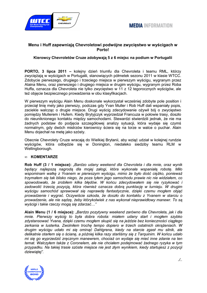 Menu i Huff zapewniają Chevroletowi podwójne zwycięstwo w wyścigach w Porto! Kierowcy Chevroletów Cruze zdobywają 5 z 6 miejsc na podium w Portugalii PORTO, 3 lipca 2011 – kolejny dzień triumfu dla Chevroleta i teamu RML, którzy zwyciężają w wyścigach w Portugalii, stanowiących półmetek sezonu 2011 w klasie WTCC. Zdobycie pierwszego, drugiego i trzeciego miejsca w pierwszym wyścigu, wygranym przez Alaina Menu, oraz pierwszego i drugiego miejsca w drugim wyścigu, wygranym przez Roba Huffa, oznacza dla Chevroleta nie tylko zwycięstwo w 11 z 12 tegorocznych wyścigów, ale też objęcie bezpiecznego prowadzenia w obu klasyfikacjach. W pierwszym wyścigu Alain Menu doskonale wykorzystał wcześniej zdobyte pole position i przeciął linię mety jako pierwszy, podczas gdy Yvan Muller i Rob Huff dali wspaniały popis, zaciekle walcząc o drugie miejsce. Drugi wyścig zdecydowanie ożywił bój o zwycięstwo pomiędzy Mullerem i Hufem. Kiedy Brytyjczyk wyprzedzał Francuza w połowie trasy, doszło do nieuniknionego kontaktu między samochodami. Stewardzi stwierdzili jednak, że nie ma żadnych podstaw do podjęcia szczegółowej analizy sytuacji, która wydaje się czymś normalnym, gdy dwóch mistrzów kierownicy ściera się na torze w walce o puchar. Alain Menu dojechał na metę jako szósty. Obecnie Chevrolety Cruze wracają do Wielkiej Brytanii, aby wziąć udział w kolejnej rundzie wyścigów, która odbędzie się w Donington, niedaleko siedziby teamu RLM w Wellingborough. • KOMENTARZE Rob Huff (3 / 1 miejsce): „Bardzo udany weekend dla Chevroleta i dla mnie, oraz wynik będący najlepszą nagrodą dla mojej załogi, która wykonała wspaniałą robotę. Miło wspominam walkę z Yvanem w pierwszym wyścigu, mimo że było dość ciężko, ponieważ trzymałem się tak blisko niego, że poza tyłem jego samochodu prawie nic nie widziałem, co spowodowało, że zrobiłem kilka błędów. W końcu zdecydowałem się nie ryzykować i zadowolić trzecią pozycją, która również oznacza dobrą punktację w turnieju. W drugim wyścigu samochód sprawował się naprawdę fantastycznie, dzięki czemu mogłem objąć prowadzenie i wygrać. Oczywiście szkoda, że doszło do kontaktu z Yvanem w starciu o prowadzenie, ale nie sądzę, żeby którykolwiek z nas wykonał nieprawidłowy manewr. To są wyścigi i takie rzeczy mogą się zdarzać…” Alain Menu (1 / 6 miejsce): „Bardzo pozytywny weekend zarówno dla Chevroleta, jak i dla mnie. Pierwszy wyścig to była dobra robota: miałem udany start i mogłem szybko zdystansować Yvana, dzięki czemu mogłem skupić się na jeździe bez konieczności ciągłego zerkania w lusterka. Zwolniłem trochę tempo dopiero w trzech ostatnich okrążeniach. W drugim wyścigu udało mi się ominąć Dahlgrena, kiedy na starcie zgasł mu silnik, ale delikatnie otarłem się o ścianę, a później kilka razy starliśmy się z Tarquinim. W końcu udało mi się go wyprzedzić zręcznym manewrem, chociaż on wydaje się mieć inne zdanie na ten temat. Walczyłem także z Coronelem, ale nie chciałem podejmować żadnego ryzyka w tym przypadku. Na takiej trasie szóste miejsce nie jest złym wynikiem, kiedy startujesz z pozycji dziewiątej”. ./.. Yvan Muller (2 / 2 miejsce): „Nie jestem w pełni zadowolony z tego weekendu. Chociaż niecałe dwie sekundy straty do zwycięzcy to nie jest zły wynik, mam wrażenie, że nie wykorzystałem swojej szansy. W pierwszym wyścigu nie było nic, co mógłbym zrobić, żeby dorównać Alainowi – nie rozwinąłem odpowiedniej prędkości, więc skupiłem się na obronie drugiej pozycji, walcząc z Robem, co było trudne, ale udało mi się. W drugim wyścigu doszło do kontaktu z Robem; jedyne, co mogę powiedzieć to, że utrzymywałem swoją pozycję przejeżdżając przez szykanę, a Rob wyprzedził mnie przecinając ją…” Eric Nève: „Po raz kolejny wracamy do domu z podwójnym zwycięstwem i maksymalną ilością punktów w klasyfikacji konstruktorów, więc jest to następny wspaniały weekend. W Porto byliśmy świadkami profesjonalnych wyścigów, ale też zaciętej walki, jednak na tym poziomie współzawodnictwa nie mogło być inaczej. Teraz musimy się skupić na wyścigu w Donington, który odbędzie się niedaleko siedziby naszego teamu i będzie na pewno ważnym wydarzeniem dla zespołu”. PORTO, WYNIKI 1. WYŚCIGU 1. A Menu 2. Y Muller 3. R Huff 4. T Monteiro 5. G Tarquini Chevrolet Cruze Chevrolet Cruze Chevrolet Cruze SEAT SR León 1.6T SEAT SR León 1.6T 11 okrążeń w 22m22s763 + 1s262 + 1s519 + 5s710 + 10s457 PORTO, WYNIKI 2. WYŚCIGU 1. R Huff 2. Y Muller 3. T Monteiro 4. N Michelisz 5. T Coronel 6. A Menu Chevrolet Cruze Chevrolet Cruze SEAT SR León 1.6T BMW 320TC BMW 320 TC Chevrolet Cruze 11 okrążeń w 23m24s533 + 1s797 + 8s728 + 9s752 +10s059 +11s114 PUNKTACJA KIEROWCÓW PO 12 Z 24 WYŚCIGÓW: 1. R Huff (Chevrolet), 227 punktów; 2. Y Muller (Chevrolet), 198; 3. A Menu (Chevrolet), 167; 4. T Monteiro (SEAT), 101; 5. T Coronel (BMW),100; ... 10. D O’Young (Chevrolet),39; 12. C Bueno (Chevrolet), 25; itd. PUNKTACJA KONSTRUKTORÓW PO 12 Z 24 WYŚCIGÓW: 1. Chevrolet, 491 punktów; 2. BMW, 279; 3. SEAT SR, 276; 4. Volvo, 76. NASTĘPNY WYŚCIG: Runda 7, Wyścig Wielkiej Brytanii, Donington, 16-17 lipca 2011.