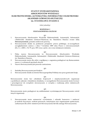 STATUT STOWARZYSZENIA ABSOLWENTÓW WYDZIAŁU ELEKTROTECHNIKI, AUTOMATYKI, INFORMATYKI I ELEKTRONIKI AKADEMII GÓRNICZO-HUTNICZEJ im. STANISŁAWA STASZICA (tekst jednolity) ROZDZIAŁ I POSTANOWIENIA OGÓLNE 1. 2. §1 Stowarzyszenie Absolwentów Wydziału Elektrotechniki, Automatyki, Informatyki i Elektroniki Akademii Górniczo-Hutniczej im. Stanisława Staszica zwane dalej Stowarzyszeniem, posiada osobowość prawną. Stowarzyszenie działa na podstawie przepisów prawa polskiego, ze szczególnym uwzględnieniem ustawy z dnia 7 kwietnia 1989 roku Prawo o stowarzyszeniach (Dz. U. z 2001 r. Nr 79, poz. 855 wraz z późn. zm.) oraz niniejszym statutem. 3. §2 Pełna nazwa Stowarzyszenia to: Stowarzyszenie Absolwentów Wydziału Elektrotechniki, Automatyki, Informatyki i Elektroniki Akademii Górniczo-Hutniczej im. Stanisława Staszica. Stowarzyszenie może dla celów współpracy z zagranicą posługiwać się tłumaczeniem nazwy w wybranych językach obcych. Nazwa Stowarzyszenia jest prawnie zastrzeżona. 1. 2. §3 Siedzibą Stowarzyszenia jest Kraków. Stowarzyszenie działa na terenie Rzeczypospolitej Polskiej oraz poza granicami kraju. 1. 2. §4 Stowarzyszenie może być członkiem krajowych i międzynarodowych organizacji o podobnym zakresie i charakterze działania, w szczególności Stowarzyszenie może tworzyć i przystępować do związków stowarzyszeń, w związku z realizacją celów statutowych Stowarzyszenia. §5 Stowarzyszenie może posługiwać się emblematami wyróżniającymi Stowarzyszenie wśród innych organizacji. 1. §6 Stowarzyszenie może ustanawiać wyróżnienia i odznaki honorowe i nadawać je osobom fizycznym, osobom prawnym, instytucjom oraz organizacjom społecznym, zasłużonym dla celów statutowych Stowarzyszenia lub dla samego Stowarzyszenia. Strona 1 z 10 2. Ustanawianie wyróżnień i odznak, o których mowa w ust. 1, oraz ich nadawanie należy do kompetencji Zarządu Stowarzyszenia. §7 Nadzór nad działalnością Stowarzyszenia sprawuje Prezydent Miasta Krakowa. ROZDZIAŁ II CELE I SPOSOBY DZIAŁANIA STOWARZYSZENIA §8 Celem Stowarzyszenia jest: 1. skupienie w ramach Stowarzyszenia absolwentów Wydziału Elektrotechniki, Automatyki, Informatyki i Elektroniki, zwanego dalej Wydziałem, (niezależnie od nazwy jaką Wydział miał w przeszłości lub będzie miał w przyszłości) dla utrzymywania i stałego pogłębiania więzi koleżeńskiej, dla pielęgnowania tradycji zawodu oraz zasad etyki zawodu; 2. organizowanie pomocy materialnej dla Członków Stowarzyszenia oraz rodzin po zmarłych Członkach Stowarzyszenia; 3. organizowanie pomocy naukowo – technicznej i samokształceniowej dla Członków Stowarzyszenia; 4. rozwój różnych form opieki nad absolwentami Wydziału rozpoczynającymi pracę zawodową; 5. utrzymywanie łączności z Wydziałem i współpraca dla dalszego jego rozwoju, w szczególności poprzez poszerzenie kontaktów absolwentów z Wydziałem; 6. aktywny udział swych członków w życiu gospodarczym kraju; 7. popularyzacja osiągnięć naukowych i naukowo – technicznych absolwentów; 8. pośrednictwo pracy krajowe i zagraniczne; 9. działania na rzecz ochrony środowiska; 10. udzielanie pomocy finansowej dla studentów Wydziału, którzy znajdują się trudnej sytuacji materialnej. §9 Stowarzyszenie realizuje swoje cele poprzez: 1. utrzymywanie stałej współpracy z Władzami Wydziału; 2. wymianę informacji o działalności Wydziału, osiągnięciach technicznych, naukowych i zawodowych absolwentów i pracowników Wydziału; 3. informowanie o kształceniu podyplomowym i doktoranckim oraz o uruchomieniu nowych specjalności; 4. informowanie absolwentów o działalności Stowarzyszenia; 5. organizowanie konferencji, narad, odczytów, wystaw, konkursów, wycieczek, poradnictwa technicznego i działalności klubowej; 6. opracowywanie ekspertyz i doradztwo techniczne; 7. tworzenie zespołów i komisji problemowych; 8. inicjowanie i organizowanie różnych form działalności naukowo – technicznej; 9. prowadzenie działalności wydawniczej; 10. dbałość o przestrzeganie zasad etycznego postępowania; Strona 2 z 10 11. 12. 13. 14. 1. 2. promocję zatrudnienia i udzielanie pomocy koleżeńskiej; współpracę z krajowymi i zagranicznymi organizacjami o podobnym charakterze działania; udzielanie pomocy finansowej dla studentów naszego Wydziału, którzy znajdują się w trudnej sytuacji materialnej; nadawanie godności członka honorowego oraz odznak i wyróżnień. § 10 Stowarzyszenie nie prowadzi działalność gospodarczej. Stowarzyszenie ma prawo zatrudniać pracowników, zleceniobiorców, wykonawców oraz korzystać z pomocy wolontariuszy. ROZDZIAŁ III CZŁONKOWIE, ICH PRAWA I OBOWIĄZKI 1. 2. 3. 4. 5. 6. § 11 Członkowie Stowarzyszenia dzielą się na: 1) Członków Zwyczajnych, 2) Członków Wspierających, 3) Członków Honorowych. Członkiem Zwyczajnym i Członkiem Honorowym może być tylko osoba fizyczna, natomiast Członkiem Wspierającym może być osoba fizyczna lub osoba prawna. Członkiem Zwyczajnym może zostać każdy pełnoletni obywatel dowolnego Państwa, który ukończył z wynikiem pozytywnym studia na Wydziale Elektrotechniki, Automatyki, Informatyki i Elektroniki Akademii Górniczo – Hutniczej w Krakowie oraz pragnie wnieść swój wkład w urzeczywistnienie celów Stowarzyszenia, daje rękojmie ich realizacji, deklarując aktywny udział w działalności Stowarzyszenia oraz wspieranie Stowarzyszenia m.in. wykonywaną na rzecz Stowarzyszenia pracą lub przekazywanymi świadczeniami pieniężnymi, zwanymi dalej Składkami Członkowskimi Członków Zwyczajnych. Członkiem Wspierającym może zostać każdy pełnoletni obywatel dowolnego Państwa lub osoba prawna mająca siedzibę na terytorium Unii Europejskiej, która pragnie regularnie wspierać działalność Stowarzyszenia wykonywaną na rzecz Stowarzyszenia pracą lub przekazywanymi świadczeniami pieniężnymi, zwanymi dalej Składkami Czło