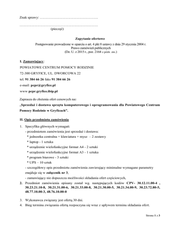 Znak sprawy: …………………………………………. ………………………………………………………… (pieczęć) Zapytanie ofertowe Postępowanie prowadzone w oparciu o art. 4 pkt 8 ustawy z dnia 29 stycznia 2004 r. Prawo zamówień publicznych (Dz. U. z 2015 r., poz. 2164 z późń. zm.) I. Zamawiający: POWIATOWE CENTRUM POMOCY RODZINIE 72-300 GRYFICE, UL. DWORCOWA 22 tel. 91 384 66 26 faks 91 384 66 26 e-mail: [email protected] www pcpr.gryfice.ibip.pl Zaprasza do złożenia ofert cenowych na: „Sprzedaż i dostawa sprzętu komputerowego i oprogramowania dla Powiatowego Centrum Pomocy Rodzinie w Gryficach”. II. Opis przedmiotu zamówienia 1. Specyfika głównych wymagań: - przedmiotem zamówienia jest sprzedaż i dostawa: * jednostka centralna + klawiatura + mysz – 2 zestawy * laptop - 1 sztuka * urządzenie wielofunkcyjne format A4 - 2 sztuki * urządzenie wielofunkcyjne format A3 - 1 sztuka * program biurowe - 3 sztuki * UPS – 10 sztuk - szczegółowy opis przedmiotu zamówienia zawierający minimalne wymagane parametry znajduje się w załącznik nr 3, - zamawiający nie dopuszcza możliwości składania ofert częściowych, 2. Przedmiot zamówienia opisany został wg. następujących kodów CPV- 30.12.11.00-4 , 30.23.21.10-8, 30.21.31.00-6, 30.21.33.00-8, 30.21.30.00-5, 30.21.34.00-9, 30.23.72.80-5, 48.77.10.00-3, 48.76.10.00-0 3. Wykonawca związany jest ofertą 30 dni. 4. Bieg terminu związania ofertą rozpoczyna się wraz z upływem terminu składania ofert. Strona 1 z 3 III. Dokumenty, jakie Wykonawca powinien załączyć do oferty: 1. Zamawiający wymaga, aby każda oferta zawierała minimum następujące dokumenty: - Wypełniony i podpisany przez Wykonawcę formularz cenowo - ofertowy (załącznik nr 1 do zapytania ofertowego) - Aktualny odpis z właściwego rejestru lub centralnej ewidencji i informacji o działalności gospodarczej, jeżeli odrębne przepisy wymagają wpisu do rejestru lub ewidencji, w celu wykazania braku podstaw do wykluczenia w oparciu o art. 24 ust. 1 pkt 2 ustawy, wystawiony nie wcześniej niż 6 miesięcy przed upływem terminu składania ofert. - Oświadczenie o spełnianiu warunków udziału w postępowaniu. 2. Postępowanie prowadzone jest w języku polskim. IV. Informacje o sposobie porozumiewania się Zamawiającego z Wykonawcami oraz przekazywania oświadczeń i dokumentów. Wszelkie oświadczenia, wnioski, zawiadomienia oraz informacje Zamawiający i Wykonawcy mogą przekazywać pisemnie, za pomocą faksu lub drogą elektroniczną. V. Osoby po stronie Zamawiającego uprawnione do porozumiewania się z Wykonawcami 1. Osobą uprawnioną do kontaktowania się z Wykonawcami i udzielania wyjaśnień dotyczących postępowania jest Pani Joanna Malińska - Dyrektor PCPR w Gryficach. 2. Wykonawca może zwrócić się do Zamawiającego o wyjaśnienie istotnych warunków udzielenia zamówienia w godzinach pracy urzędu tj.: od poniedziałku do piątku od godz. 07.30 do 15.30. VI. Termin wykonania zamówienia. Od daty obowiązywania umowy do dnia 28.12.2016 r. VII. Kryteria wyboru najkorzystniejszej oferty i ich wagi procentowe: O wyborze oferty najkorzystniejszej stanowić będą przedstawione niżej kryteria i przypisane im maksymalne ilości punktów: 1) cena /C/ – waga 100 Punkty zostaną obliczone w następujący sposób: 1a) Punkty za kryterium „Cena” zostaną obliczone wg następującego wzoru: Cena brutto oferty najtańszej C= ------------------------------------- x 100 = ilość punktów Cena brutto oferty badanej Za najkorzystniejszą zostanie uznana oferta, która uzyska najwyższą ilość punktów. VIII. Opis sposobu obliczenia ceny oferty. 1. Na załączonym formularzu cenowo - ofertowym należy przedstawić cenę ofertową brutto za wykonanie / udzielenie przedmiotu zamówienia. 2. Wartość cenową należy podać w złotych polskich cyfrą – z dokładnością do dwóch miejsc po przecinku oraz słownie. Strona 2 z 3 3. Cena powinna zawierać wszelkie koszty związane z wykonaniem przedmiotu zamówienia. 4. Wszelkie rozliczenia pomiędzy Zamawiającym a Wykonawcą odbywać się będą w złotych polskich. IX. Miejsce i termin składania ofert: 1. Oferta musi być przygotowana zgodnie z treścią wzoru formularza oferty stanowiącego załącznik nr 1 do niniejszego zapytania ofertowego. 2. Ofertę cenową należy złożyć w siedzibie Zamawiającego: Powiatowe Centrum Pomocy Rodzinie ul. Dworcowa 22 72-300 Gryfice w sekretariacie (parter pokój nr 2) w terminie do dnia 15.12.2016 r. do godz. 15.30 w zamkniętej kopercie z dopiskiem „SPRZĘT KOMPUTEROWY” NIE OTWIERAĆ PRZED 15.12.2016 r. do godz.15.30 X. Informacje o formalnościach 1. Niezwłocznie po wyborze najkorzystniejszej oferty, Zamawiający zamieści na stronie internetowej BIP informację o wyborze najkorzystniejszej oferty i zawiadomi telefonicznie firmę, której oferta została wybrana. 2. Zamawiający zawrze umowę (załącznik nr 2 do zapytania ofertowego) z wybranym Wykonawcą po przekazaniu zawiadomienia o wyborze Wykonawcy, ale nie później niż w terminie związania ofertą. 3. Jeżeli Wykonawca, którego oferta została wybrana uchyli się od zawarcia umowy, Zamawiający wybierze kolejną ofertę najkorzystniejszą spośród złożonych ofert, bez przeprowadzania ich ponownej oceny. 4. Do prowadzonego postępowania nie przysługują Wykonawcom środki ochrony prawnej określone w przepisach Ustawy Prawo zamówień publicznych tj. odwołanie, skarga. 5. Niniejsze postępowania prowadzone jest na zasadach opartych na wewnętrznych uregulowaniach organizacyjnych Zamawiającego. Nie mają w tym przypadku zastosowania przepisy Ustawy Prawo zamówień publicznych. XI. Załączniki: 1. Formularz cenowo – ofertowy. 2. Projekt umowy. 3. Szczegółowy opis przedmiotu zamówienia. Gryfice, dnia 08.12.2016 r. ZATWIERDZIŁ: DYREKTOR Powiatowego Centrum Pomocy Rodzinie w Gryficach Joanna Malińska Strona 3 z 3