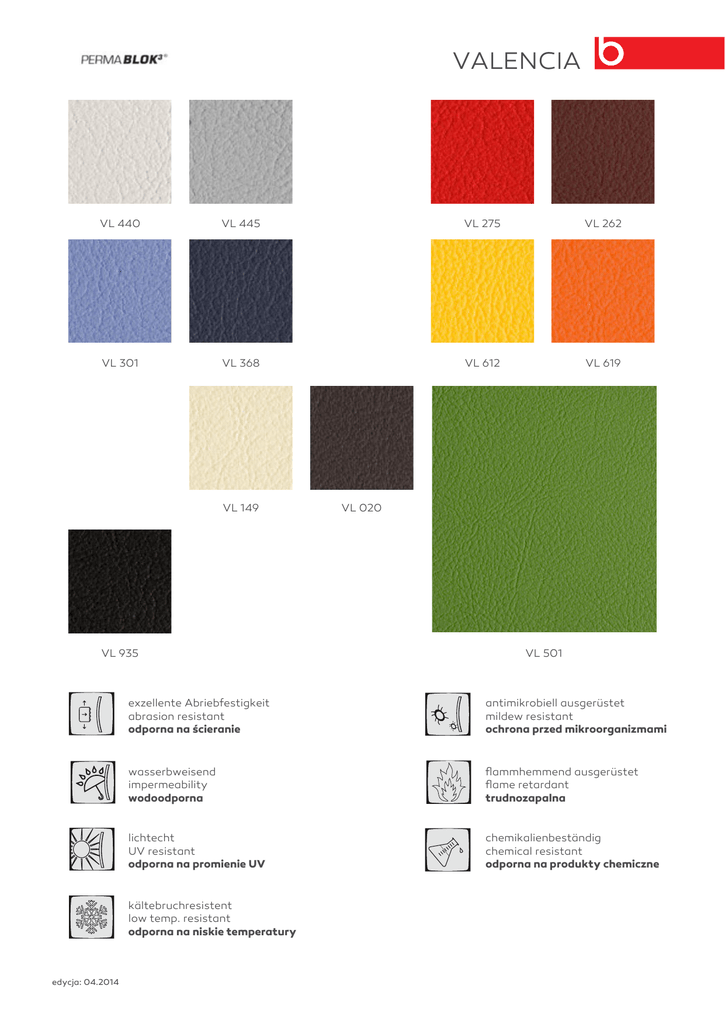 VALENCIA VL 440 VL 445 VL 275 VL 262 VL 301 VL 368 VL 612 VL 619 VL 149 VL 935 VL 501 exzellente Abriebfestigkeit abrasion resistant odporna na ścieranie antimikrobiell ausgerüstet mildew resistant ochrona przed mikroorganizmami wasserbweisend impermeability wodoodporna flammhemmend ausgerüstet flame retardant trudnozapalna lichtecht UV resistant odporna na promienie UV chemikalienbeständig chemical resistant odporna na produkty chemiczne kältebruchresistent low temp. resistant odporna na niskie temperatury edycja: 04.2014 VL 020 D Charakteristik: – – – – – antimikrobielle Ausrüstung antibakterielle Ausrüstung antimykotische Ausrüstung hohe Abriebfestigkeit schmutzabweisend (Urin, Blut) GB Characteristic: – – – – – PL antimicrobial protection antibacterial protection antimycotic protection abrasion resistance resistance to dirt (Urine, Blood) Charakterystyka: – – – – – bariera przed drobnoustrojami bariera przeciwbakteryjna bariera przeciwgrzybiczna odporna na ścieranie odporna na zabrudzenia (krwią, uryną) PERMANENT FLAMMHEMMENDE AUSRÜSUNG / FLAME RETARDANCY / TRUDNOZAPALNOŚĆ • UNE 23.727-90 JR = M2NFP 92503 • UNE EN 1021-1/2 • BS EN 1021-1/2 • ÖNORM B 3825 • ÖNORM B 3800 Teil 1 • NF EN 1021-1/2 • NF P 92-503/M2 • UNI EN 1021-1/2 • UNI 9175 (1987) UNI 9175/FA1 (1994) • IMO A 652 (16) 8.2-8.3 • DIN EN 1021-1/2 • DIN 4102 B2 • EN 1021/2 • EN 71-3 • FAR 25.853 b(4) Ap. F Part. 1 (a)(1) (ii) PERMABLOCK ist geprüfte Schutzschicht, die eine starke und PERMABLOCK is a proven vinyl protective coating, engineered to create a tough, Probleme in der Hotelbranche und Krankenhauswesen ausmacht. problems encountered in contract, healthcare and hospitality environments. PERMABLOCK to sprawdzona powłoka chroniąca winyl, która tworzy mocną i skuteczną barierę przed największymi problemami występującymi w branży hotelarskiej i służbie zdrowia. PERMABLOCK garantiert, dass das bezogene Produkt über einen längeren Zeitraum genutzt werden kann. PERMABLOCK guarantees a long life for the uphlostered article, long term use of the material and a consequent high retained value of your purchase. PERMABLOCK gwarantuje, że tapicerowany produkt i materiał będą mogły być używane przez długi czas, dzięki czemu zakupiony produkt zachowa wysoką wartość. Avoid contact with oils, fats or aggressive substances (e.g. strong household cleaners). These may damage the surface may lead to the extraction of plasticizers and consequently a rigidification of the material. Należy unikać olejów, tłuszczy i substancji agresywnych (np. silne domowe środki czyszczące). Mogą one zniszczyć powierzchnię materiału. Zniszczenie materiału może doprowadzić do usunięcia plastyfikatorów i w rezultacie do stwardnienia materiału. vinyl. Especially textilles can contain strong colorants (e.g. Jeans, Jackets or Belts) which possibly cannot be removed completely. Barwniki i pigmenty mogą odbarwiać winyl. W szczególności materiały tekstylne mogą zawierać silne pigmenty (np. jeansy, kamizelki czy paski), których nie można całkowicie usunąć. Man sollte Öle und starke Reinigungsmittel vermeiden. Sie können die Oberflä ädigen Diese Beschädigung kann Entfernen von Weichmachern verursachen und zu ühren. Verhä önnen Vinyl verfärben, insbesondere Textilien, die starke Pigmente beinhalten (wie Jeanshosen, Westen, Gürtel), welche völlig nicht entfernt werden können. – Oberfläche – 100% Vinyl, Gewebe – 100% Polyester Hi-Loft 2TM – Gewicht 650 g/m – Scheuerfestigkeit > 300 000 Zyklen Martindale UNE EN 14465:2004 – Lichtechtheit > 5 EN ISO 105-B02 – Zigaretten- und Streichholztest (Normen in der Tabelle) – surface – 100% vinyl, basic material – 100% polyester Hi-Loft 2TM – weight 650 g/m – abrasion > 300 000 cycles Martindale UNE EN 14465:2004 – light fastness > 5 EN ISO 105-B02 – non-flammability certificate (Norms in the table) – powłoka – 100% winyl, nośnik – 100% poliester Hi-Loft 2TM – waga 650 g/m – odporność na ścieranie > 300 000 cykli Martindale UNE EN 14465:2004 – odporność na światło > 5 EN ISO 105-B02 – atest trudnozapalności (normy w ramce powyżej) Vorgestellte Farbgebung ist kein Angebot im Sinne der Rechtsvorschriften Przedstawiona kolorystyka nie stanowi oferty w rozumieniu prawa VALENCIA