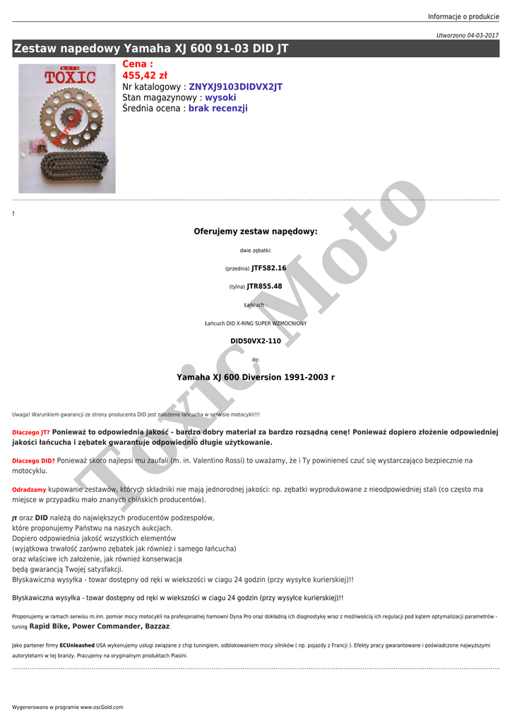Informacje o produkcie Utworzono 04-03-2017 Zestaw napedowy Yamaha XJ 600 91-03 DID JT Cena : 455,42 zł ot o Nr katalogowy : ZNYXJ9103DIDVX2JT Stan magazynowy : wysoki Średnia ocena : brak recenzji ! Oferujemy zestaw napędowy: dwie zębatki: (przednia) JTR855.48 M (tylna) JTF582.16 Łańcuch : Łańcuch DID X-RING SUPER WZMOCNIONY DID50VX2-110 c do: xi Yamaha XJ 600 Diversion 1991-2003 r Uwaga! Warunkiem gwarancji ze strony producenta DID jest założenie łańcucha w serwisie motocykli!!! Dlaczego JT? Ponieważ to odpowiednia jakość - bardzo dobry materiał za bardzo rozsądną cenę! Ponieważ dopiero złożenie odpowiedniej To jakości łańcucha i zębatek gwarantuje odpowiednio długie użytkowanie. Dlaczego DID? Ponieważ skoro najlepsi mu zaufali (m. in. Valentino Rossi) to uważamy, że i Ty powinieneś czuć się wystarczająco bezpiecznie na motocyklu. Odradzamy kupowanie zestawów, których składniki nie mają jednorodnej jakości: np. zębatki wyprodukowane z nieodpowiedniej stali (co często ma miejsce w przypadku mało znanych chińskich producentów). oraz DID należą do największych producentów podzespołów, które proponujemy Państwu na naszych aukcjach. Dopiero odpowiednia jakość wszystkich elementów (wyjątkowa trwałość zarówno zębatek jak również i samego łańcucha) oraz właściwe ich założenie, jak również konserwacja będą gwarancją Twojej satysfakcji. Błyskawiczna wysyłka - towar dostępny od ręki w wiekszości w ciagu 24 godzin (przy wysyłce kurierskiej)!! JT Błyskawiczna wysyłka - towar dostępny od ręki w wiekszości w ciagu 24 godzin (przy wysyłce kurierskiej)!! Proponujemy w ramach serwisu m.inn. pomiar mocy motocykli na profesjonalnej hamowni Dyna Pro oraz dokładną ich diagnostykę wraz z możliwością ich regulacji pod kątem optymalizacji parametrów tuning Rapid Bike, Power Commander, Bazzaz. Jako partener firmy ECUnleashed USA wykonujemy usługi związane z chip tuningiem, odblokowaniem mocy silników ( np. pojazdy z Francji ). Efekty pracy gwarantowane i poświadczone najwyższymi autorytetami w tej branży. Pracujemy na oryginalnym produktach Piasini. Wygenerowano w programie www.oscGold.com