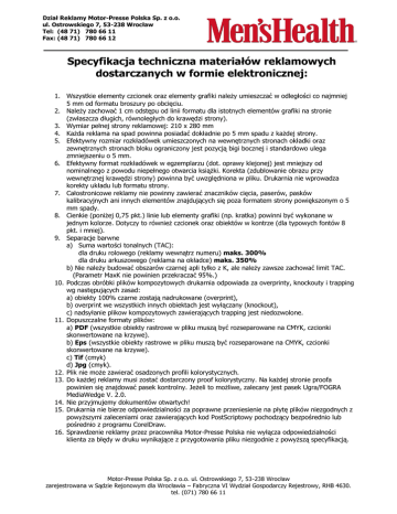 Dział Reklamy Motor-Presse Polska Sp. z o.o. ul. Ostrowskiego 7, 53-238 Wrocław Tel: (48 71) 780 66 11 Fax: (48 71) 780 66 12 Specyfikacja techniczna materiałów reklamowych dostarczanych w formie elektronicznej: 1. Wszystkie elementy czcionek oraz elementy grafiki należy umieszczać w odległości co najmniej 5 mm od formatu broszury po obcięciu. 2. Należy zachować 1 cm odstępu od linii formatu dla istotnych elementów grafiki na stronie (zwłaszcza długich, równoległych do krawędzi strony). 3. Wymiar pełnej strony reklamowej: 210 x 280 mm 4. Każda reklama na spad powinna posiadać dokładnie po 5 mm spadu z każdej strony. 5. Efektywny rozmiar rozkładówek umieszczonych na wewnętrznych stronach okładki oraz zewnętrznych stronach bloku ograniczony jest pozycją bigi bocznej i standardowo ulega zmniejszeniu o 5 mm. 6. Efektywny format rozkładówek w egzemplarzu (dot. oprawy klejonej) jest mniejszy od nominalnego z powodu niepełnego otwarcia książki. Korekta (zdublowanie obrazu przy wewnętrznej krawędzi strony) powinna być uwzględniona w pliku. Drukarnia nie wprowadza korekty układu lub formatu strony. 7. Całostronicowe reklamy nie powinny zawierać znaczników cięcia, paserów, pasków kalibracyjnych ani innych elementów znajdujących się poza formatem strony powiększonym o 5 mm spady. 8. Cienkie (poniżej 0,75 pkt.) linie lub elementy grafiki (np. kratka) powinni być wykonane w jednym kolorze. Dotyczy to również czcionek oraz obiektów w kontrze (dla typowych fontów 8 pkt. i mniej). 9. Separacje barwne a) Suma wartości tonalnych (TAC): dla druku rolowego (reklamy wewnątrz numeru) maks. 300% dla druku arkuszowego (reklama na okładce) maks. 350% b) Nie należy budować obszarów czarnej apli tylko z K, ale należy zawsze zachować limit TAC. (Parametr MaxK nie powinien przekraczać 95%.) 10. Podczas obróbki plików kompozytowych drukarnia odpowiada za overprinty, knockouty i trapping wg następujących zasad: a) obiekty 100% czarne zostają nadrukowane (overprint), b) overprint we wszystkich innych obiektach jest wyłączany (knockout), c) nadsyłanie plikow kompozytowych zawierających trapping jest niedozwolone. 11. Dopuszczalne formaty plików: a) PDF (wszystkie obiekty rastrowe w pliku muszą być rozseparowane na CMYK, czcionki skonwertowane na krzywe). b) Eps (wszystkie obiekty rastrowe w pliku muszą być rozseparowane na CMYK, czcionki skonwertowane na krzywe). c) Tif (cmyk) d) Jpg (cmyk). 12. Plik nie może zawierać osadzonych profili kolorystycznych. 13. Do każdej reklamy musi zostać dostarczony proof kolorystyczny. Na każdej stronie proofa powinien się znajdować pasek kontrolny. Jeżeli to możliwe, zalecany jest pasek Ugra/FOGRA MediaWedge V. 2.0. 14. Nie przyjmujemy dokumentów otwartych! 15. Drukarnia nie bierze odpowiedzialności za poprawne przeniesienie na płytę plików niezgodnych z powyższymi zaleceniami oraz zawierających kod PostScriptowy pochodzący bezpośrednio lub pośrednio z programu CorelDraw. 16. Sprawdzenie reklamy przez pracownika Motor-Presse Polska nie wyłącza odpowiedzialności klienta za błędy w druku wynikające z przygotowania pliku niezgodnie z powyższą specyfikacją. Motor-Presse Polska Sp. z o.o. ul. Ostrowskiego 7, 53-238 Wrocław zarejestrowana w Sądzie Rejonowym dla Wrocławia – Fabryczna VI Wydział Gospodarczy Rejestrowy, RHB 4630. tel. (071) 780 66 11 Materiały w postaci elektronicznej prosimy nadsyłać: Na adres ftp: Adres: ftp.mpp.pl Login: reklama Password: mpprek77# Katalog odpowiadający nazwie reklamodawcy prosimy zakładać w podkatalogu MPP/Men’s Health Do tego samego katalogu proszę wprowadzić plik tekstowy, w którym prosimy wpisać informacje na temat nazwy klienta, zleceniodawcy i numeru pisma, w którym ma ukazać się reklama. lub na nośniku CD, na adres. Men’s Health Motor-Presse Polska sp. z o.o. ul. Ostrowskiego 7 53-238 Wrocław UWAGA: Materiały reklamowe będą odsyłane tylko na wyraźne życzenie klientów Pytania dotyczące kwesti technicznych prosimy kierować do Pana Zbigniewa Skrzypka. tel. 0-71 780 66 11 wew. 342 lub drogą mailową mailto:[email protected] Motor-Presse Polska Sp. z o.o. ul. Ostrowskiego 7, 53-238 Wrocław zarejestrowana w Sądzie Rejonowym dla Wrocławia – Fabryczna VI Wydział Gospodarczy Rejestrowy, RHB 4630. tel. (071) 780 66 11