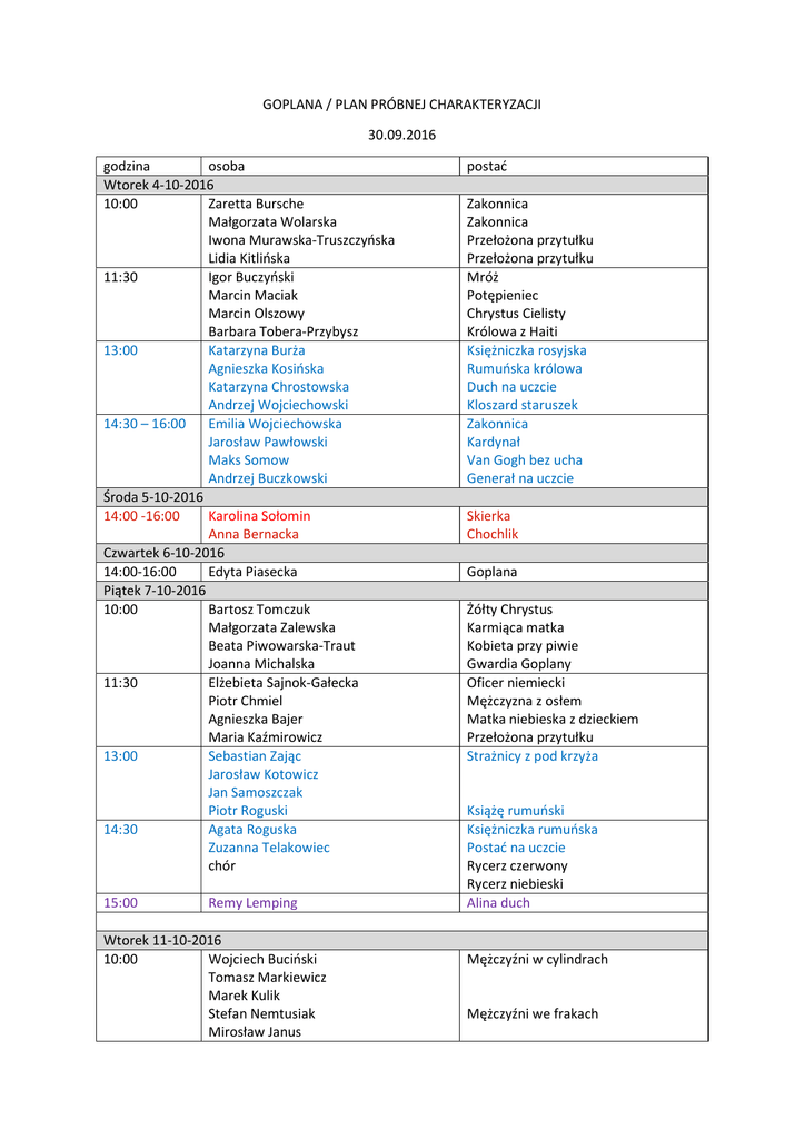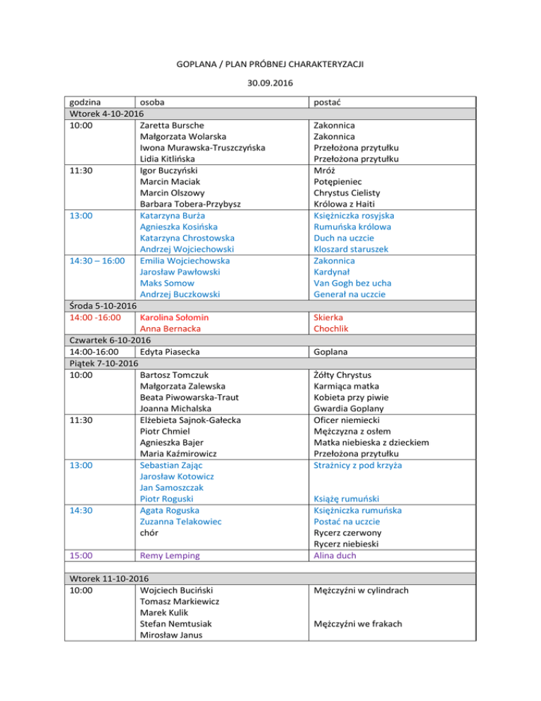 GOPLANA / PLAN PRÓBNEJ CHARAKTERYZACJI 30.09.2016 godzina osoba Wtorek 4-10-2016 10:00 Zaretta Bursche Małgorzata Wolarska Iwona Murawska-Truszczyńska Lidia Kitlińska 11:30 Igor Buczyński Marcin Maciak Marcin Olszowy Barbara Tobera-Przybysz 13:00 Katarzyna Burża Agnieszka Kosińska Katarzyna Chrostowska Andrzej Wojciechowski 14:30 – 16:00 Emilia Wojciechowska Jarosław Pawłowski Maks Somow Andrzej Buczkowski Środa 5-10-2016 14:00 -16:00 Karolina Sołomin Anna Bernacka Czwartek 6-10-2016 14:00-16:00 Edyta Piasecka Piątek 7-10-2016 10:00 Bartosz Tomczuk Małgorzata Zalewska Beata Piwowarska-Traut Joanna Michalska 11:30 Elżebieta Sajnok-Gałecka Piotr Chmiel Agnieszka Bajer Maria Kaźmirowicz 13:00 Sebastian Zając Jarosław Kotowicz Jan Samoszczak Piotr Roguski 14:30 Agata Roguska Zuzanna Telakowiec chór 15:00 Remy Lemping Wtorek 11-10-2016 10:00 Wojciech Buciński Tomasz Markiewicz Marek Kulik Stefan Nemtusiak Mirosław Janus postać Zakonnica Zakonnica Przełożona przytułku Przełożona przytułku Mróż Potępieniec Chrystus Cielisty Królowa z Haiti Księżniczka rosyjska Rumuńska królowa Duch na uczcie Kloszard staruszek Zakonnica Kardynał Van Gogh bez ucha Generał na uczcie Skierka Chochlik Goplana Żółty Chrystus Karmiąca matka Kobieta przy piwie Gwardia Goplany Oficer niemiecki Mężczyzna z osłem Matka niebieska z dzieckiem Przełożona przytułku Strażnicy z pod krzyża Książę rumuński Księżniczka rumuńska Postać na uczcie Rycerz czerwony Rycerz niebieski Alina duch Mężczyźni w cylindrach Mężczyźni we frakach 11:10-11:40 Wojciech Dylewski Magdalena Majlert-Strzalka Ewa Nowak Jakub Jarmuła Tadeusz Kozłowski Andrzej Paulanis Środa 12-10-2016 16:00 Wioletta Chodowicz Małgorzata Walewska Arnold Rutkowski Mariusz Godlewski Czwartek 13-10-2016 16:00 Lista postaci zostanie podana bliżej terminu Piątek 14-10-2016 16:00 Lista postaci zostanie podana bliżej terminu --- soliści --- chór --- statyści Waligóra Maria z pod krzyża Maria Magdalena Kominiarz Amerykański gotyk Amerykański gotyk Balladyna Wdowa Kirkor Kostryn