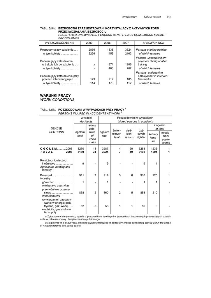Rynek pracy Labour market 145 TABL. 5/54/. BEZROBOTNI ZAREJESTROWANI KORZYSTAJĄCY Z AKTYWNYCH FORM PRZECIWDZIAŁANIA BEZROBOCIU REGISTERED UNEMPLOYED PERSONS BENEFITTING FROM LABOUR MARKET PROGRAMMES WYSZCZEGÓLNIENIE 2000 Rozpoczynający szkolenie...... w tym kobiety ...................... 2006 2866 2226 Podejmujący zatrudnienie w trakcie lub po szkoleniu .... w tym kobiety ...................... 1338 455 x x Podejmujący zatrudnienie przy pracach interwencyjnych...... w tym kobiety ...................... 2007 874 466 179 114 SPECIFICATION 3324 2162 Persons starting training of which females 1206 707 Persons undertaking employment during or after training of which females 185 112 Persons undertaking employment in intervention works of which females 212 173 WARUNKI PRACY WORK CONDITIONS TABL. 6/55/. POSZKODOWANI W WYPADKACH PRZY PRACY a PERSONS INJURED IN ACCIDENTS AT WORK SEKCJE SECTIONS O G Ó Ł E M ........... 2006 TOTAL 2007 Rolnictwo, łowiectwo i leśnictwo...................... Agriculture, hunting and forestry Przemysł .......................... Industry górnictwo ....................... mining and quarrying przetwórstwo przemysłowe........................... manufacturing wytwarzanie i zaopatrywanie w energię elektryczną, gaz, wodę...... electricity, gas and water supply Wypadki Accidents w tym zbioogółem rowe total of which mass a Poszkodowani w wypadkach Injured persons in accidents ogółem total śmiertelnych fatal ciężkich serious lżejszych lighter z ogółem of total młodokobiety ciani femaadoleles scents 3270 3189 13 31 3287 3224 4 7 20 19 3263 3198 1236 1204 1 1 9 - 9 - - 9 1 - 911 7 919 3 6 910 220 1 1 - 1 - - 1 1 - 858 2 860 2 5 853 210 1 52 5 58 1 1 56 9 - a Zgłoszone w danym roku; łącznie z pracownikami cywilnymi w jednostkach budżetowych prowadzących działalność w zakresie obrony i bezpieczeństwa publicznego. a Registered in a given year; including civilian employees in budgetary entities conducting activity within the scope of national defence and public safety. 146 Rynek pracy Labour market a TABL. 6/55/. POSZKODOWANI W WYPADKACH PRZY PRACY (dok.) a PERSONS INJURED IN ACCIDENTS AT WORK (cont.) SEKCJE SECTIONS Budownictwo.................... Construction Wypadki Accidents w tym zbioogółem rowe total of which mass Poszkodowani w wypadkach Injured persons in accidents ogółem total śmiertelnych fatal ciężkich serious lżejszych lighter z ogółem of total młodokobiety ciani feadolesmales cents 246 2 248 1 2 245 12 - Handel i naprawy ........... Trade and repair∆ 434 1 435 2 1 432 166 - Hotele i restauracje.......... Hotels and restaurants 88 - 88 - 1 87 48 - 280 1 281 - - 281 47 - 68 3 72 - - 72 53 - 306 11 317 1 3 313 120 - 151 1 152 - - 152 89 - 216 1 217 - - 217 137 - Ochrona zdrowia i pomoc społeczna ..................... Health and social work 390 3 395 - - 395 278 - Działalność usługowa komunalna, społeczna i indywidualna, pozostała................................... Other community, social and personal service activities 90 1 91 - 6 85 33 - ∆ Transport, gospodarka magazynowa i łączność Transport, storage and communication Pośrednictwo finansowe Financial intermediation Obsługa nieruchomości i firm∆ ............................. Real estate, renting and business activities Administracja publiczna i obrona narodowa; obowiązkowe ubezpieczenia społeczne ∆ i zdrowotne .................. Public administration and defence; compulsory social security Edukacja ......................... Education a Zgłoszone w danym roku; łącznie z pracownikami cywilnymi w jednostkach budżetowych prowadzących działalność w zakresie obrony i bezpieczeństwa publicznego. a Registered in a given year; including civilian employees in budgetary entities conducting activity within the scope of national defence and public safety.