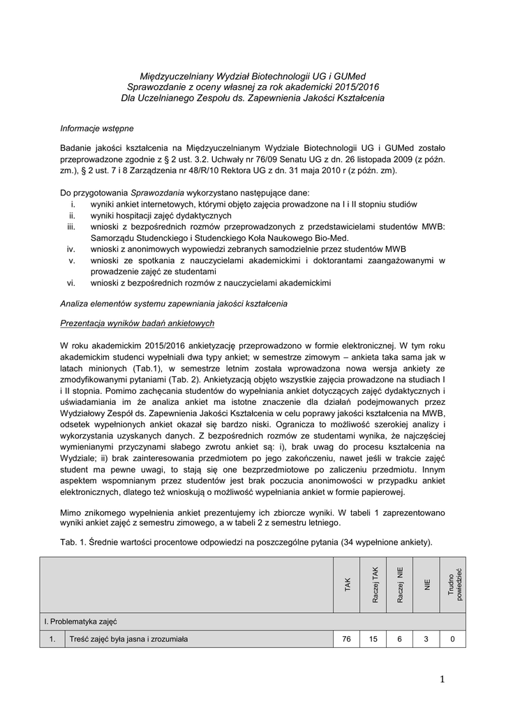 Międzyuczelniany Wydział Biotechnologii UG i GUMed Sprawozdanie z oceny własnej za rok akademicki 2015/2016 Dla Uczelnianego Zespołu ds. Zapewnienia Jakości Kształcenia Informacje wstępne Badanie jakości kształcenia na Międzyuczelnianym Wydziale Biotechnologii UG i GUMed zostało przeprowadzone zgodnie z § 2 ust. 3.2. Uchwały nr 76/09 Senatu UG z dn. 26 listopada 2009 (z późn. zm.), § 2 ust. 7 i 8 Zarządzenia nr 48/R/10 Rektora UG z dn. 31 maja 2010 r (z późn. zm). Do przygotowania Sprawozdania wykorzystano następujące dane: i. wyniki ankiet internetowych, którymi objęto zajęcia prowadzone na I i II stopniu studiów ii. wyniki hospitacji zajęć dydaktycznych iii. wnioski z bezpośrednich rozmów przeprowadzonych z przedstawicielami studentów MWB: Samorządu Studenckiego i Studenckiego Koła Naukowego Bio-Med. iv. wnioski z anonimowych wypowiedzi zebranych samodzielnie przez studentów MWB v. wnioski ze spotkania z nauczycielami akademickimi i doktorantami zaangażowanymi w prowadzenie zajęć ze studentami vi. wnioski z bezpośrednich rozmów z nauczycielami akademickimi Analiza elementów systemu zapewniania jakości kształcenia Prezentacja wyników badań ankietowych W roku akademickim 2015/2016 ankietyzację przeprowadzono w formie elektronicznej. W tym roku akademickim studenci wypełniali dwa typy ankiet; w semestrze zimowym – ankieta taka sama jak w latach minionych (Tab.1), w semestrze letnim została wprowadzona nowa wersja ankiety ze zmodyfikowanymi pytaniami (Tab. 2). Ankietyzacją objęto wszystkie zajęcia prowadzone na studiach I i II stopnia. Pomimo zachęcania studentów do wypełniania ankiet dotyczących zajęć dydaktycznych i uświadamiania im że analiza ankiet ma istotne znaczenie dla działań podejmowanych przez Wydziałowy Zespół ds. Zapewnienia Jakości Kształcenia w celu poprawy jakości kształcenia na MWB, odsetek wypełnionych ankiet okazał się bardzo niski. Ogranicza to możliwość szerokiej analizy i wykorzystania uzyskanych danych. Z bezpośrednich rozmów ze studentami wynika, że najczęściej wymienianymi przyczynami słabego zwrotu ankiet są: i), brak uwag do procesu kształcenia na Wydziale; ii) brak zainteresowania przedmiotem po jego zakończeniu, nawet jeśli w trakcie zajęć student ma pewne uwagi, to stają się one bezprzedmiotowe po zaliczeniu przedmiotu. Innym aspektem wspomnianym przez studentów jest brak poczucia anonimowości w przypadku ankiet elektronicznych, dlatego też wnioskują o możliwość wypełniania ankiet w formie papierowej. Mimo znikomego wypełnienia ankiet prezentujemy ich zbiorcze wyniki. W tabeli 1 zaprezentowano wyniki ankiet zajęć z semestru zimowego, a w tabeli 2 z semestru letniego. 6 3 Trudno powiedzieć 15 NIE Raczej TAK 76 Raczej NIE TAK Tab. 1. Średnie wartości procentowe odpowiedzi na poszczególne pytania (34 wypełnione ankiety). I. Problematyka zajęć 1. Treść zajęć była jasna i zrozumiała 0 1 Raczej NIE NIE 56 35 6 3 0 Trudno powiedzieć Raczej TAK Poruszane zagadnienia znacząco poszerzyły moją wiedzę i umiejętności TAK 2. II. Sposób prowadzenia zajęć 1. Czas zajęć był dobrze wykorzystany 73,5 17,5 3 3 3 2. Prowadzenie zajęć umożliwiało łączenie własnej wiedzy i doświadczeń z nową wiedzą i umiejętnościami 73,5 20,5 0 3 3 III. Wymagania i ocenianie 1. Warunki uzyskania zaliczenia zostały jasno określone na jednych z pierwszych zajęć 82 15 0 0 3 2. Zakres i forma stawianych wymagań były związane z realizowaną treścią i założonymi celami zajęć 88 6 3 0 3 IV. Postawa prowadzącego 1. Prowadzący zachęcał do stawiania pytań bądź do dzielenia się wątpliwościami 74 15 0 0 12 2. Prowadzący odnosił się do studentów z szacunkiem i życzliwością 88 9 0 0 3 V. Organizacja zajęć 1. Zajęcia prowadzone były sumiennie 91 6 0 0 2. Słuchacze mogli bez większych przeszkód konsultować się z prowadzącym w czasie jego dyżurów bądź w innych ustalonych terminach czy formach kontaktu 85 12 0 0 3 33.5 18 3 3 3 VI. Zajęcia postrzegane jako całość 1. Zajęcia uważam za ważną dla mnie część moich studiów 42,5 TAK Raczej TAK Trudno ocenić Raczej NIE NIE Tab. 2. Średnie wartości procentowe odpowiedzi na poszczególne pytania (na podstawie 124 ankiet). 1. Czy zajęcia w ramach przedmiotu zostały zrealizowane zgodnie z założeniami przedstawionymi przez prowadzącego w sylabusie lub podczas zajęć? 69 19 7 5 0 2. Czy zajęcia w ramach przedmiotu poszerzyły Pana/Pani wiedzę z danej dziedziny? 59 21,5 9,5 5 5 3. Czy zajęcia wzbudziły Pana/Pani refleksje naukową i przyczyniły się do rozwoju intelektualnego? 53 19 13 7 8 4. Czy zajęcia pozwoliły Panu/Pani nabyć lub rozwinąć umiejętności związane z przekazywaną wiedzą? 51,5 21 12 10 5,5 I. Ocena zajęć 2 Trudno ocenić Raczej NIE 16 20 6,5 9 6. Czy sposób zaliczenia przedmiotu (min. Kolokwia, prace zaliczeniowe) pozwalały przedstawić wiedzę, umiejętności i kompetencje nabyte podczas zajęć? 58 19 15 2 6 7. Czy treści realizowane w czasie zajęć powtarzały treści zrealizowane na wcześniejszych zajęciach? 13 16 15,5 24 31,5 NIE Raczej TAK 48,5 TAK 5. Czy uczestnictwo w zajęciach pozwoliło Panu/Pani nabyć lub rozwinąć kompetencje społeczne (np. Praca w grupie, zrozumienie potrzeby uczenia się przez całe życie, świadomość umiejętności rozstrzygania dylematów zawodowych)? II. Ocena działań prowadzącego zajęcia 1. Czy prowadzący przedstawił treści związane z przedmiotem w sposób zrozumiały? 60 21 10 6 3 2. Czy prowadzący reagował na prośby studentów i dostosowywał sposób omawiania treści programowych do potrzeb studentów? [proszę odpowiedzieć na to pytanie, jeśli takie prośby były składane] 57 21,5 11,5 6 4 3. Czy prowadzący rozpoczynał i kończył zajęcia punktualnie? 64 23 2 4 7 4. Czy prowadzący dobrze wykorzystywał czas przeznaczony na zajęcia? 61 17 14 6 2 5. Czy prowadzący był dostępny po