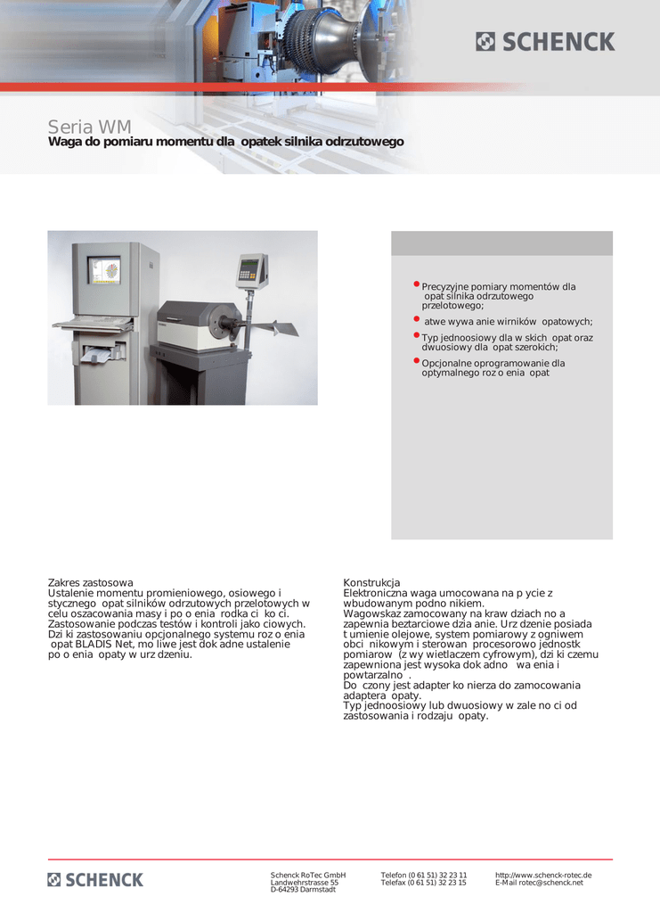 Seria WM Waga do pomiaru momentu dla opatek silnika odrzutowego • Precyzyjne pomiary momentów dla opat silnika odrzutowego przelotowego; • atwe wywa anie wirników opatowych; • Typ jednoosiowy dla w skich opat oraz dwuosiowy dla opat szerokich; • Opcjonalne oprogramowanie dla optymalnego roz o enia opat Zakres zastosowa Ustalenie momentu promieniowego, osiowego i stycznego opat silników odrzutowych przelotowych w celu oszacowania masy i po o enia rodka ci ko ci. Zastosowanie podczas testów i kontroli jako ciowych. Dzi ki zastosowaniu opcjonalnego systemu roz o enia opat BLADIS Net, mo liwe jest dok adne ustalenie po o enia opaty w urz dzeniu. Konstrukcja Elektroniczna waga umocowana na p ycie z wbudowanym podno nikiem. Wagowskaz zamocowany na kraw dziach no a zapewnia beztarciowe dzia anie. Urz dzenie posiada t umienie olejowe, system pomiarowy z ogniwem obci nikowym i sterowan procesorowo jednostk pomiarow (z wy wietlaczem cyfrowym), dzi ki czemu zapewniona jest wysoka dok adno wa enia i powtarzalno . Do czony jest adapter ko nierza do zamocowania adaptera opaty. Typ jednoosiowy lub dwuosiowy w zale no ci od zastosowania i rodzaju opaty. Schenck RoTec GmbH Landwehrstrasse 55 D-64293 Darmstadt Telefon (0 61 51) 32 23 11 Telefax (0 61 51) 32 23 15 http://www.schenck-rotec.de E-Mail [email protected] Seria WM Waga do pomiaru momentu dla opatek silnika odrzutowego With multi-axis equipment, the axial and tangential moments can also be measured. This is especially necessary for wide chord, heavy blades. With the single-axis scale only the radial moment is determined. If the mass distribution of the blades is known, the blades can be installed on the turbine disc in a sequence that will result in the lowest possible residual unbalance. This may become a difficult task, even in standard applications, and in particular when the unbalance of the disc is to be compensated for by the blade positions.Complex tasks of mass and radial moment processing are completed quickly, efficiently and cost-effectively by the blade optimization program BLADIS Net. This runs on an IBM-compatible PC directly connected to the moment weighing scale.For multi-axis evaluations BLADIS 3D is available. The central element of the Schenck RoTec moment weighing scale is a solid, horizontal beam mounted friction-free on knife-edges. With a blade mounted on the adapter flange, the moment is determined by a precision loadcell and the lever-arm. In the case of singleaxial scales, the important radial moment is determined.A digital measurement and display instrument ensures a broad measurement range along with high display sensitivity. 1 Moment weighing scale 2 Adapter and blade wheel 3 Measuring device Schenck RoTec GmbH Landwehrstrasse 55 D-64293 Darmstadt Plan view (non-binding example) Telefon (0 61 51) 32 23 11 Telefax (0 61 51) 32 23 15 http://www.schenck-rotec.de E-Mail [email protected] Seria WM Waga do pomiaru momentu dla opatek silnika odrzutowego Technical data at a glance WM 02 WM 01 WM 00 WM 0 WM 1 WM 2 Measuring unit Digital Digital Digital Digital Digital Digital • • • • • • Single-axis measurement Triple-axis measurement WM 0 BA WM 1 BA WM 2 BA Digital Digital • • • Digital Jet-engine blade Weight [kg] 0,1 0,3 1 3 10 30 3 10 20 Radial moment [kgm] 0,02 0,1 0,5 2 10 40 2 10 30 Tangential moment [kgm] - - - - - - 0,25 1,25 2,5 Axial moment [kgm] - - - - - - 0,25 1,25 2,5 Root radius, min. [mm] 30 30 80 80 125 275 100 165 200 Width A [mm] 1000 1000 1200 1200 1500 2000 800 1500 1500 Depth B [mm] 800 800 1000 1000 1200 1500 800 1000 1000 Height C [mm] 300 300 500 500 600 800 600 1000 1000 Flange radius (mm) 30 30 80 80 125 275 100 165 200 Sensitivity (gmm) 0,1 1 10 20 100 1000 20 100 500 [V] 230 230 230 230 230 230 230 230 230 Order No. R0710100.01 R0710200.01 R0710300.01 R0710400.01 R0710500.01 R0710600.01 R0710700.01 R0710800.01 R0710900.01 Order No. R0710101.01 R0710101.01 R0710101.01 R0710101.01 R0710101.01 R0710101.01 - - - BLADIS 3D 2) Order No. - - - - - - R0710201.01 R0710201.01 R0710201.01 Revolving flange Order No. - - - - - - - R0710802.01 R0710902.01 Calibration Master Order No. R0710103.01 R0710203.01 R0710303.01 R0710403.01 R0710503.01 R0710603.01 R0710703.01 R0710803.01 R0710903.01 Machine Power requirement 2) Blade distribution system (software and hardware) 3) Data non-binding, dependent on the respective equipment Schenck RoTec GmbH Landwehrstrasse 55 D-64293 Darmstadt Telefon (0 61 51) 32 23 11 Telefax (0 61 51) 32 23 15 http://www.schenck-rotec.de E-Mail [email protected]