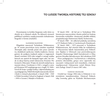 TO LUDZIE TWORZĄ HISTORIĘ TEJ SZKOŁY Prezentujemy tu krótkie biogramy osób, które zaW latach 1950 – 60 był już w Technikum Włósłużyły się w dziejach szkoły. Na dalszych stronach kienniczym nauczycielem chemii; pełnił też funkcję publikacji czytelnicy znajdą pozostałe rozbudowane kierownika wydziałów: chemicznej obróbki włókna, biografie w formie artykułów. przędzalniczego Państwowej Szkoły Technicznej. W latach 1960 – 64 odbywał praktykę zawodową kazimierz badowski w P. P. Rafinerii Nafty w Czechowicach-Dziedzicach. Długoletni nauczyciel Technikum WłókienniczeW latach 1969 – 1972 pracował w Technikum go. W swoim pracowitym życiu rzetelnie wypełniał Włókienniczym. Był również kilka lat wykładowcą obowiązki jakie stawiała przed nim praca zawodo- w Wieczorowej Szkole Inżynierskiej przy Politechwa, działalność społeczna i służba wojskowa. Zawsze nice Śląskiej w Gliwicach oraz przewodniczącym gotowy do podjęcia trudnych zadań; w tragicznych Zespołu Chemicznego Szkół Zawodowych w Okrędniach września 1939 roku wstąpił w szeregi wojska, gowym Ośrodku Metodycznym. Był członkiem ZNP. których nie opuścił do listopada tegoż roku. Już wtePraca pedagogiczna i wychowawcza z młodzieżą, dy za akcję bojową został odznaczony Krzyżem Wa- postawa obywatelska, gorące serce zapewniły mu lecznych z Mieczami. Wzięty do niewoli znalazł się za szacunek i wdzięczność tych wszystkich, z którymi murami obozu. Uwolniony w 1945 r. wstąpił w szere- współpracował. Odznaczony został Złotym Krzygi II Korpusu WP znajdującego się w Anglii. W 1948 r. żem Zasługi. Zmarł 25 marca 1987 roku. wrócił do kraju i podjął trudną i odpowiedzialną pracę pedagogiczną. Pełnił obowiązki nauczyciela chemii tadeusz chlipalski i fizyki w różnych placówkach: w latach 1948 – 1949 Urodził się 1 lutego 1904 roku w Delatynie w wow Polish Secondary School in England, w latach 1948 jewództwie stanisławowskim. Ukończył Politech– 1950 w Liceum J. Matejki w Krakowie. nikę Lwowską, gdzie na Wydziale Mechanicznym 33 zdobył dyplom inżyniera mechanika w 1928 roku. W czasie studiów poznał konstruktora szybowców Wacława Czerwińskiego, któremu pomagał budować pierwsze konstrukcje. W 1932 roku ukończył kurs szybowcowy kategorii A i B, a w 1934 roku kategorii C. Łączył swoją pracę zawodową (specjalizował się w instalacjach grzewczych i wentylacyjnych) z pasją lotniczą. Do 1931 roku pracował we Lwowie, potem przeprowadził się do Bielska. Rozpoczął pracę jako nauczyciel w Państwowej Szkole Przemysłowej. Tam też założył jesienią 1933 roku koło szybowcowe i rozpoczął budowę na warsztatach szkolnych szybowca „Skaut”. Był to pierwszy szybowiec wybudowany w Bielsku. Ponadto wykorzystując swoje zawodowe umiejętności zmodernizował w szkole system ogrzewania. W 1935 roku Tadeusz Chlipalski został założycielem i kierownikiem Śląskich Warsztatów Szybowcowych w Bielsku, gdzie pracował do 1938 roku. Wtedy to otrzymał propozycję pracy w Lwowskich Warsztatach Lotniczych, którymi kierował aż do wybuchu wojny. Produkowano tam szybowce: Delfin, PWS 101, PWS 102, Salamandra, Żaba. W czasie wojny przebywał w Wielkiej Brytanii, gdzie zorganizował warsztaty lotnicze, będące polską spółką i specjalizujące się w produkcji podwozia ogonowego do słynnego samolotu myśliwskiego Spitfire. W 1947 roku powrócił do Polski. Od 1953 roku aż do 1972 roku pracował na Politechnice Śląskiej, gdzie uzyskał w 1964 roku tytuł profesora nadzwy34 czajnego, a w 1972 roku profesora zwyczajnego. W latach 1969-1971 był Dziekanem Wydziału Inżynierii Sanitarnej Politechniki Śląskiej. Od 1972 r. pracował na Politechnice Krakowskiej. Był autorem projektu ogrzewania Zamku Królewskiego na Wawelu. Zmarł w 1997 roku. jan chwierut Urodził się w Żywcu-Sporyszu 4 grudnia 1901 roku. Był synem kierownika szkoły w Sporyszu. Ukończył szkołę realną w Żywcu. W latach 1920 – 1926 studiował na Akademii Sztuk Pięknych w Krakowie, u profesorów Pieńkowskiego i Weissa. W roku 1927 ukończył Szkołę podchorążych we Włodzimierzu Wołyńskim. W tym też roku podjął pracę nauczyciela rysunku w Gimnazjum w Piekarach-Szarlej. W latach 1932 -1939 uczył w Gimnazjum Państwowym w Bielsku. W tym okresie odbył podróż artystyczną do Wiednia, Paryża i Mediolanu. Brał udział w kampanii wrześniowej 1939 roku w stopniu porucznika. W latach 1940 – 45 przebywał w Krakowie, gdzie wykładał w szkole konspiracyjnej. Pracował również jako robotnik budowlany. W 1945 roku powrócił do Bielska. Był głównym organizatorem Oddziału Polskiego Związku Plastyków w Bielsku, a potem przez kilka kadencji jego Prezesem. Pracował w Państwowej Szkole Przemysłowej. Był współorganizatorem I Ogólnopolskiej Wystawy Sztuki województwa śląsko-dąbrowskiego w Bielsku w roku 1946. W 1951 roku wyjechał do Krakowa. Pracował tam jako pedagog w Liceum Budowlanym. Zmarł 6 lipca 1973 roku w Krakowie. Pochowany jest na Cmentarzu Rakowickim. Żona artysty, Joanna zmarła 18.12.1989 roku w Krakowie. Córka Hanna, historyk sztuki, zmarła w wieku 60 lat w listopadzie 1993 r. w Żywcu. Jan Chwierut brał udział w licznych wystawach w Bielsku-Białej, Katowicach, Krakowie, Sopocie, Radomiu, Wrocławiu i w Warszawie. Miał indywidualne wystawy w Szarleju w 1933 r., w Żywcu w 1960 r., w Nowej Hucie w 1963 r. i w Krakowie w 1968 i 1969 roku. Jego prace znajdują się w muzeach Bielska-Białej, Żywca i Krakowa, a także w zbiorach prywatnych. Dużą kolekcję, bo aż 132 prace Jana Chwieruta posiada bielski kolekcjoner pan Władysław Banach. Tematyka prac artysty jest bogata i obejmuje pejzaże, architekturę zabytkową, kwiaty, martwą naturę oraz portret. Techniki stosowane to akwarela, pastel, olej, rysunek piórkiem i flamastrem. adolf elsner Urodził się 3 lipca 1903 roku w Marklowicach koło Cies