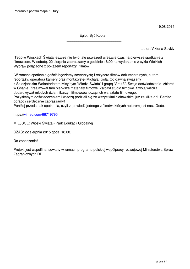 Pobrano z portalu Mapa Kultury 19.08.2015 Egipt: Być Koptem ____________________________ autor: Viktoria Savkiv Tego w Wioskach Świata jeszcze nie było, ale przyszedł wreszcie czas na pierwsze spotkanie z filmowcem. W sobotę, 22 sierpnia zapraszamy o godzinie 18:00 na wydarzenie z cyklu Wielkich Wypraw połączone z pokazem reportaży i filmów. W ramach spotkania gościć będziemy scenarzystę i reżysera filmów dokumentalnych, autora reportaży, operatora kamery oraz montażystę- Michała Króla. Od dawna związany z Salezjańskim Wolontariatem Misyjnym "Młodzi Światu" i grupą "Art.43". Swoje doświadczenie zbierał w Ghanie. Zrealizował tam pierwsze materiały filmowe. Założył studio filmowe. Swoją wiedzą obdarowywał młodych dziennikarzy i filmowców ucząc ich warsztatu filmowego. Pozyskanym doświadczeniem i wiedzą podzieli się ze wszystkimi ciekawskimi już za kilka dni. Bardzo gorąco i serdecznie zapraszamy! Poniżej przedsmak spotkania, czyli zapowiedź jednego z filmów, których autorem jest nasz Gość. https://vimeo.com/66719790 MIEJSCE: Wioski Świata - Park Edukacji Globalnej CZAS: 22 sierpnia 2015 godz. 18.00. Do zobaczenia! Projekt jest współfinansowany w ramach programu polskiej współpracy rozwojowej Ministerstwa Spraw Zagranicznych RP. strona 1 / 1