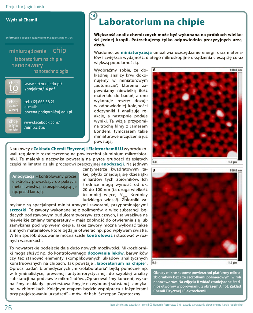 Projektor Jagielloński Wydział Chemii Informacja o zespole badawczym znajduje się na str. 94 Laboratorium na chipie Większość analiz chemicznych może być wykonana na próbkach wielkości jednej kropli. Potrzebujemy tylko odpowiednio precyzyjnych urządzeń. Wiadomo, że miniaturyzacja umożliwia oszczędzanie energii oraz materiałów i zwiększa wydajność, dlatego mikroskopijne urządzenia cieszą się coraz większą popularnością. www.cittru.uj.edu.pl/ /projektor/14.pdf tel. (12) 663 38 21 e-mail: [email protected] www.facebook.com/ /nimb.cittru Wyobraźmy sobie, że dokładnej analizy krwi dokonujemy w miniaturowym „automacie”, któremu zapewniamy niewielką ilość materiału do badań, a ono wykonuje resztę: dozuje w odpowiedniej kolejności odczynniki i analizuje reakcje, a następnie podaje wyniki. Ta wizja przypomina trochę filmy z Jamesem Bondem, tymczasem takie miniaturowe urządzenia już powstają. Naukowcy z Zakładu Chemii Fizycznej i Elektrochemii UJ wyprodukowali regularnie rozmieszczone na powierzchni aluminium mikrozbiorniki. Te maleńkie naczynka powstają na płytce grubości dziesiątych części milimetra dzięki procesowi precyzyjnej anodyzacji. Na jednym centymetrze kwadratowym taAnodyzacja – kontrolowany proces kiej płytki znajdują się dziesiątki elektrolizy prowadzący do pokrycia miliardów tych zbiorników. Ich metali warstwą zabezpieczającą je średnice mogą wynosić od ok. 20 do 100 nm (ta druga wielkość np. przed korozją. to mniej więcej 1/1000 średnicy ludzkiego włosa!). Zbiorniki zamykane są specjalnymi miniaturowymi zaworami, przypominającymi szczotki. Te zawory wykonane są z polimerów, a więc substancji będących podstawowym budulcem tworzyw sztucznych, i są wrażliwe na niewielkie zmiany temperatury – mają zdolność do otwierania się lub zamykania pod wpływem ciepła. Takie zawory można wykonać także z innych materiałów, które będą je otwierać np. pod wpływem światła. W ten sposób dozowanie można ściśle kontrolować i stosować w różnych warunkach. To nowatorskie podejście daje dużo nowych możliwości. Mikrozbiorniki mogą służyć np. do kontrolowanego dozowania leków, barwników czy też stanowić elementy skomplikowanych układów analitycznych konstruowanych na chipach. Tak powstaje „laboratorium na chipie”. Oprócz badań biomedycznych „mikrolaboratoria” będą pomocne np. w kryminalistyce, prewencji antyterrorystycznej, do szybkiej analizy substancji na podstawie mikrośladów. „Opracowaliśmy koncept, wykonaliśmy te układy i przetestowaliśmy je na wybranej substancji zamykanej w zbiornikach. Kolejnym etapem będzie współpraca z inżynierami przy projektowaniu urządzeń” – mówi dr hab. Szczepan Zapotoczny. 26 A B Obrazy mikroskopowe powierzchni platformy mikrozbiorników bez i ze szczotkami polimerowymi w roli nanozaworów. Na zdjęciu B widać zmniejszone średnice otworów w porównaniu z obrazem A, fot. Zakład Chemii Fizycznej i Elektrochemii kopiuj tekst na zasadach licencji CC Uznanie Autorstwa 3.0 | zasady oznaczania określono na karcie redakcyjnej