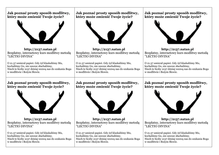 Jak poznać prosty sposób modlitwy, który może zmienić Twoje życie? Jak poznać prosty sposób modlitwy, który może zmienić Twoje życie? Jak poznać prosty sposób modlitwy, który może zmienić Twoje życie? http://2137.natan.pl Bezpłatny, internetowy kurs modlitwy metodą "LECTIO DIVINA" http://2137.natan.pl Bezpłatny, internetowy kurs modlitwy metodą "LECTIO DIVINA" http://2137.natan.pl Bezpłatny, internetowy kurs modlitwy metodą "LECTIO DIVINA" O 21.37 umierał papież. Gdy żył klaskaliśmy Mu, kochaliśmy Go, nie zawsze słuchaliśmy. Niech te liczby 2137 dzisiaj wezwą nas do szukania Boga w modlitwie i Bożym Słowie. O 21.37 umierał papież. Gdy żył klaskaliśmy Mu, kochaliśmy Go, nie zawsze słuchaliśmy. Niech te liczby 2137 dzisiaj wezwą nas do szukania Boga w modlitwie i Bożym Słowie. O 21.37 umierał papież. Gdy żył klaskaliśmy Mu, kochaliśmy Go, nie zawsze słuchaliśmy. Niech te liczby 2137 dzisiaj wezwą nas do szukania Boga w modlitwie i Bożym Słowie. Jak poznać prosty sposób modlitwy, który może zmienić Twoje życie? Jak poznać prosty sposób modlitwy, który może zmienić Twoje życie? Jak poznać prosty sposób modlitwy, który może zmienić Twoje życie? http://2137.natan.pl Bezpłatny, internetowy kurs modlitwy metodą "LECTIO DIVINA" http://2137.natan.pl Bezpłatny, internetowy kurs modlitwy metodą "LECTIO DIVINA" http://2137.natan.pl Bezpłatny, internetowy kurs modlitwy metodą "LECTIO DIVINA" O 21.37 umierał papież. Gdy żył klaskaliśmy Mu, kochaliśmy Go, nie zawsze słuchaliśmy. Niech te liczby 2137 dzisiaj wezwą nas do szukania Boga w modlitwie i Bożym Słowie. O 21.37 umierał papież. Gdy żył klaskaliśmy Mu, kochaliśmy Go, nie zawsze słuchaliśmy. Niech te liczby 2137 dzisiaj wezwą nas do szukania Boga w modlitwie i Bożym Słowie. O 21.37 umierał papież. Gdy żył klaskaliśmy Mu, kochaliśmy Go, nie zawsze słuchaliśmy. Niech te liczby 2137 dzisiaj wezwą nas do szukania Boga w modlitwie i Bożym Słowie.