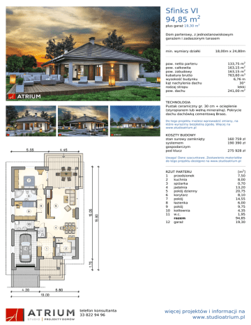 Sfinks VI 94,85 m2 plus garaż 19,30 m2 Dom parterowy, z jednostanowiskowym garażem i zadaszonym tarasem min. wymiary działki pow. netto parteru pow. całkowita pow. zabudowy kubatura brutto wysokość budynku kąt nachylenia dachu rodzaj stropu pow. dachu 18,00m x 24,80m 133,75 m2 163,15 m2 163,15 m2 763,60 m3 6,76 m 30° lekki 241,00 m2 TECHNOLOGIA Pustak ceramiczny gr. 30 cm + ocieplenie (styropianem lub wełną mineralną). Pokrycie dachu dachówką cementową Braas. Do tego projektu możesz wprowadzić zmiany, na które wyrazimy bezpłatną zgodę. Więcej na www.studioatrium.pl KOSZTY BUDOWY stan surowy zamknięty systemem gospodarczym pod klucz 160 759 zł 190 390 zł 275 928 zł Uwaga! Dane szacunkowe. Zestawienie materiałów do tego projektu dostępne na www.studioatrium.pl RZUT PARTERU 1 przedsionek 2 kuchnia 3 spiżarka 4 jadalnia 5 pokój dzienny 6 korytarz 7 pokój 8 łazienka 9 pokój 10 kotłownia 11 w.c. razem 12 garaż telefon konsultanta 33 822 94 96 Powered by TCPDF (www.tcpdf.org) [m2] 7,50 8,00 0,70 13,20 20,75 8,10 14,55 6,00 9,75 4,35 1,95 94,85 19,30 więcej projektów i informacji na www.studioatrium.pl