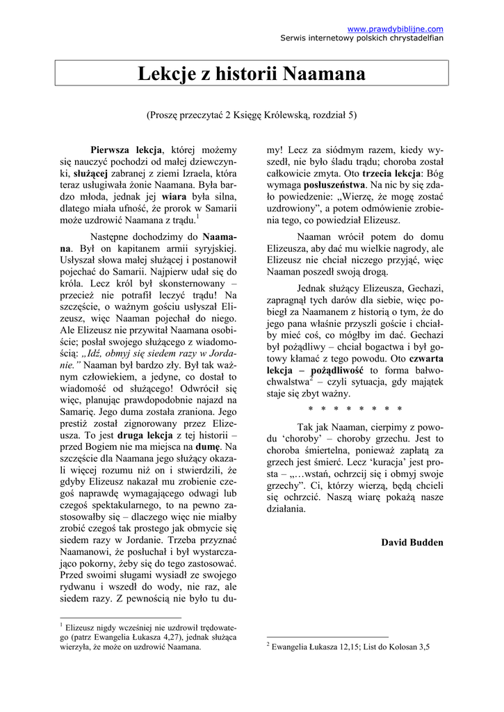 www.prawdybiblijne.com Serwis internetowy polskich chrystadelfian Lekcje z historii Naamana (Proszę przeczytać 2 Księgę Królewską, rozdział 5) Pierwsza lekcja, której możemy się nauczyć pochodzi od małej dziewczynki, służącej zabranej z ziemi Izraela, która teraz usługiwała żonie Naamana. Była bardzo młoda, jednak jej wiara była silna, dlatego miała ufność, że prorok w Samarii może uzdrowić Naamana z trądu.1 my! Lecz za siódmym razem, kiedy wyszedł, nie było śladu trądu; choroba został całkowicie zmyta. Oto trzecia lekcja: Bóg wymaga posłuszeństwa. Na nic by się zdało powiedzenie: „Wierzę, że mogę zostać uzdrowiony”, a potem odmówienie zrobienia tego, co powiedział Elizeusz. Następne dochodzimy do Naamana. Był on kapitanem armii syryjskiej. Usłyszał słowa małej służącej i postanowił pojechać do Samarii. Najpierw udał się do króla. Lecz król był skonsternowany – przecież nie potrafił leczyć trądu! Na szczęście, o ważnym gościu usłyszał Elizeusz, więc Naaman pojechał do niego. Ale Elizeusz nie przywitał Naamana osobiście; posłał swojego służącego z wiadomością: „Idź, obmyj się siedem razy w Jordanie.” Naaman był bardzo zły. Był tak ważnym człowiekiem, a jedyne, co dostał to wiadomość od służącego! Odwrócił się więc, planując prawdopodobnie najazd na Samarię. Jego duma została zraniona. Jego prestiż został zignorowany przez Elizeusza. To jest druga lekcja z tej historii – przed Bogiem nie ma miejsca na dumę. Na szczęście dla Naamana jego służący okazali więcej rozumu niż on i stwierdzili, że gdyby Elizeusz nakazał mu zrobienie czegoś naprawdę wymagającego odwagi lub czegoś spektakularnego, to na pewno zastosowałby się – dlaczego więc nie miałby zrobić czegoś tak prostego jak obmycie się siedem razy w Jordanie. Trzeba przyznać Naamanowi, że posłuchał i był wystarczająco pokorny, żeby się do tego zastosować. Przed swoimi sługami wysiadł ze swojego rydwanu i wszedł do wody, nie raz, ale siedem razy. Z pewnością nie było tu du- Naaman wrócił potem do domu Elizeusza, aby dać mu wielkie nagrody, ale Elizeusz nie chciał niczego przyjąć, więc Naaman poszedł swoją drogą. Jednak służący Elizeusza, Gechazi, zapragnął tych darów dla siebie, więc pobiegł za Naamanem z historią o tym, że do jego pana właśnie przyszli goście i chciałby mieć coś, co mógłby im dać. Gechazi był pożądliwy – chciał bogactwa i był gotowy kłamać z tego powodu. Oto czwarta lekcja – pożądliwość to forma bałwochwalstwa2 – czyli sytuacja, gdy majątek staje się zbyt ważny. * * * * * * * * Tak jak Naaman, cierpimy z powodu ‘choroby’ – choroby grzechu. Jest to choroba śmiertelna, ponieważ zapłatą za grzech jest śmierć. Lecz ‘kuracja’ jest prosta – „…wstań, ochrzcij się i obmyj swoje grzechy”. Ci, którzy wierzą, będą chcieli się ochrzcić. Naszą wiarę pokażą nasze działania. David Budden 1 Elizeusz nigdy wcześniej nie uzdrowił trędowatego (patrz Ewangelia Łukasza 4,27), jednak służąca wierzyła, że może on uzdrowić Naamana. 2 Ewangelia Łukasza 12,15; List do Kolosan 3,5