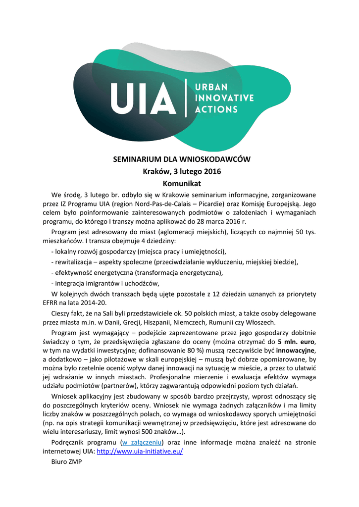 SEMINARIUM DLA WNIOSKODAWCÓW Kraków, 3 lutego 2016 Komunikat We środę, 3 lutego br. odbyło się w Krakowie seminarium informacyjne, zorganizowane przez IZ Programu UIA (region Nord-Pas-de-Calais – Picardie) oraz Komisję Europejską. Jego celem było poinformowanie zainteresowanych podmiotów o założeniach i wymaganiach programu, do którego I transzy można aplikować do 28 marca 2016 r. Program jest adresowany do miast (aglomeracji miejskich), liczących co najmniej 50 tys. mieszkańców. I transza obejmuje 4 dziedziny: - lokalny rozwój gospodarczy (miejsca pracy i umiejętności), - rewitalizacja – aspekty społeczne (przeciwdziałanie wykluczeniu, miejskiej biedzie), - efektywność energetyczna (transformacja energetyczna), - integracja imigrantów i uchodźców, W kolejnych dwóch transzach będą ujęte pozostałe z 12 dziedzin uznanych za priorytety EFRR na lata 2014-20. Cieszy fakt, że na Sali byli przedstawiciele ok. 50 polskich miast, a także osoby delegowane przez miasta m.in. w Danii, Grecji, Hiszpanii, Niemczech, Rumunii czy Włoszech. Program jest wymagający – podejście zaprezentowane przez jego gospodarzy dobitnie świadczy o tym, że przedsięwzięcia zgłaszane do oceny (można otrzymać do 5 mln. euro, w tym na wydatki inwestycyjne; dofinansowanie 80 %) muszą rzeczywiście być innowacyjne, a dodatkowo – jako pilotażowe w skali europejskiej – muszą być dobrze opomiarowane, by można było rzetelnie ocenić wpływ danej innowacji na sytuację w mieście, a przez to ułatwić jej wdrażanie w innych miastach. Profesjonalne mierzenie i ewaluacja efektów wymaga udziału podmiotów (partnerów), którzy zagwarantują odpowiedni poziom tych działań. Wniosek aplikacyjny jest zbudowany w sposób bardzo przejrzysty, wprost odnoszący się do poszczególnych kryteriów oceny. Wniosek nie wymaga żadnych załączników i ma limity liczby znaków w poszczególnych polach, co wymaga od wnioskodawcy sporych umiejętności (np. na opis strategii komunikacji wewnętrznej w przedsięwzięciu, które jest adresowane do wielu interesariuszy, limit wynosi 500 znaków…). Podręcznik programu (w załączeniu) oraz inne informacje można znaleźć na stronie internetowej UIA: http://www.uia-initiative.eu/ Biuro ZMP