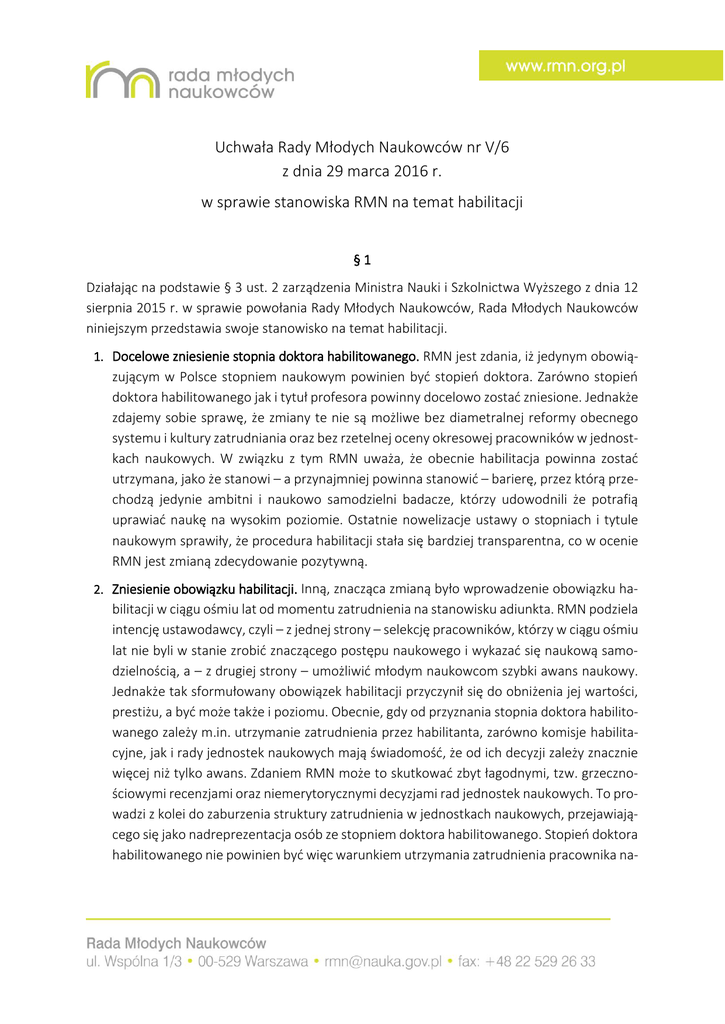 Uchwała Rady Młodych Naukowców nr V/6 z dnia 29 marca 2016 r. w sprawie stanowiska RMN na temat habilitacji §1 Działając na podstawie § 3 ust. 2 zarządzenia Ministra Nauki i Szkolnictwa Wyższego z dnia 12 sierpnia 2015 r. w sprawie powołania Rady Młodych Naukowców, Rada Młodych Naukowców niniejszym przedstawia swoje stanowisko na temat habilitacji. 1. Docelowe zniesienie stopnia doktora habilitowanego. RMN jest zdania, iż jedynym obowią- zującym w Polsce stopniem naukowym powinien być stopień doktora. Zarówno stopień doktora habilitowanego jak i tytuł profesora powinny docelowo zostać zniesione. Jednakże zdajemy sobie sprawę, że zmiany te nie są możliwe bez diametralnej reformy obecnego systemu i kultury zatrudniania oraz bez rzetelnej oceny okresowej pracowników w jednostkach naukowych. W związku z tym RMN uważa, że obecnie habilitacja powinna zostać utrzymana, jako że stanowi – a przynajmniej powinna stanowić – barierę, przez którą przechodzą jedynie ambitni i naukowo samodzielni badacze, którzy udowodnili że potrafią uprawiać naukę na wysokim poziomie. Ostatnie nowelizacje ustawy o stopniach i tytule naukowym sprawiły, że procedura habilitacji stała się bardziej transparentna, co w ocenie RMN jest zmianą zdecydowanie pozytywną. 2. Zniesienie obowiązku habilitacji. Inną, znacząca zmianą było wprowadzenie obowiązku ha- bilitacji w ciągu ośmiu lat od momentu zatrudnienia na stanowisku adiunkta. RMN podziela intencję ustawodawcy, czyli – z jednej strony – selekcję pracowników, którzy w ciągu ośmiu lat nie byli w stanie zrobić znaczącego postępu naukowego i wykazać się naukową samodzielnością, a – z drugiej strony – umożliwić młodym naukowcom szybki awans naukowy. Jednakże tak sformułowany obowiązek habilitacji przyczynił się do obniżenia jej wartości, prestiżu, a być może także i poziomu. Obecnie, gdy od przyznania stopnia doktora habilitowanego zależy m.in. utrzymanie zatrudnienia przez habilitanta, zarówno komisje habilitacyjne, jak i rady jednostek naukowych mają świadomość, że od ich decyzji zależy znacznie więcej niż tylko awans. Zdaniem RMN może to skutkować zbyt łagodnymi, tzw. grzecznościowymi recenzjami oraz niemerytorycznymi decyzjami rad jednostek naukowych. To prowadzi z kolei do zaburzenia struktury zatrudnienia w jednostkach naukowych, przejawiającego się jako nadreprezentacja osób ze stopniem doktora habilitowanego. Stopień doktora habilitowanego nie powinien być więc warunkiem utrzymania zatrudnienia pracownika na- ukowego. Decyzja o tym, kto powinien być zatrudniony, winna leżeć wyłącznie w gestii kierownictwa jednostki naukowej, przy czym kierownicy powinni być regularnie rozliczani z efektów pracy zarządzanych przez nich jednostek naukowych. Stopień doktora habilitowanego daje znaczące uprawnienia – przede wszystkim możliwość promowania doktorantów, zatrudnienie na czas nieokreślony oraz współdecydowanie o jednostce naukowej poprzez czynne członkostwo w jej radzie. Otrzymanie stopnia doktora habilitowanego powinno wiązać się także ze znaczącym wzrostem minimalnej stawki wynagrodzenia podstawowego (np. o 25% względem stawki dla adiunkta ze stopniem doktora i starszego wykładowcy), co powinno być dodatkową zachętą do rozwoju pracownika. Dlatego też postulujemy zniesienie obowiązku habilitacji i pozostawienie wyboru pracownikom jednostek, czy chcą oni rozwijać swoją karierę w kierunku profesury i kształcenia kolejnych pokoleń naukowców. 3. Centralne finansowanie postępowania habilitacyjnego. Obecnie nie w pełni jest uregulo- wana kwestia, na kim spoczywa odpowiedzialność za opłacenie kosztów postępowania habilitacyjnego. Zazwyczaj postępowania opłacane są z budżetu jednostki naukowej, z której pochodzi habilitant. Sprawia to jednak, iż niewielki odsetek habilitantów decyduje się na wskazanie innej niż swoja jednostki naukowej jako tej, która ma przeprowadzić postępowanie. Problematyczne jest również obarczenie finansowe jednostki, która jako druga została wskazana przez Centralną Komisję ds. Stopni i Tytułów Naukowych do przeprowadzenia postępowania, odrzuconego przez jednostkę wskazaną przez habilitanta. Rozwiązaniem tych problemów byłaby zmiana sposobu finansowania przewodów habilitacyjnych. RMN proponuje, aby postępowania habilitacyjne opłacane były przez MNiSW za pośrednictwem CK, która zarządzałaby tymi środkami. Każda osoba posiadającą stopień doktora mogłaby złożyć wniosek o wszczęcie postępowania habilitacyjnego, jednak w przypadku odmowy przyznania stopnia doktora habilitowanego, obowiązywałaby habilitanta trzyletnia karencja połączona z obowiązkiem znacznego powiększenia dorobku naukowego habilitanta. 4. Ponowne wnioskowanie o wszczęcie postępowania. W przypadku ponownego wnioskowa- nia o wszczęcie postępowania, habilitant uiszczałby 10% kosztów postępowania, a koszty każdego kolejnego postępowania musiałyby być pokryte w całości przez habilitanta. Jednostka naukowa, która przeprowadza postępowanie otrzymywałaby od CK środki w ramach kosztów pośrednich w wysokości 10%. 5. Ograniczenie jednostek uprawnionych do nadawania stopnia doktora habilitowanego w ra- mach danej dziedziny do posiadających kategorię A i A+. Ponieważ jednostki skategoryzowane jako A i A+ reprezentują wyższy poziom naukowy od jednostek z kategorii B i C, RMN uważa, iż ograniczenie jednostek, które mogą nadawać stopień doktora habilitowanego, wpłynie pozytywnie na poziom habilitacji w naszym kraju. Rozwiązanie to pociąga za sobą konieczność wyłączenia parametrów oceny w Kompleksowej kategoryzacji jednostek naukowych uprawnień do nadawania stopni oraz liczby nadanych stopni i tytułów naukowych, co RMN również popiera. 6. Nadawanie stopnia doktora habilitowanego w dziedzinie naukowej. Obecnie stopień dok- tora habilitowanego nadawany jest w