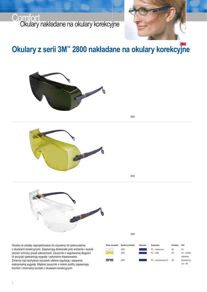 Comfort Okulary nakładane na okulary korekcyjne Okulary z serii 3M™ 2800 nakładane na okulary korekcyjne 2805 2802 2800 Okulary te zostały zaprojektowane do używania ich jednocześnie z okularami korekcyjnymi. Zapewniają doskonałe pole widzenia i wysoki poziom ochrony przed uderzeniami. Zauszniki o regulowanej długości (4 pozycje) gwarantują wygodę i optymalne dopasowanie. Zmienny kąt nachylenia soczewki ułatwia regulację i zapewnia maksymalną wygodę. Miękkie zauszniki o niskim profilu zapewniają komfort i minimalny kontakt z okularami korekcyjnymi. 6 Kolor soczewki Symbol produktu Soczewka Powłoka Filtr 2800 Oprawka PC – bezbarwna AS UV 2802 PC – żółta AS UV – światło 2805 PC – przyciemnienie 5 AS niebieskie Spawalniczy (UV - IR) Classic Okulary nakładane na okulary korekcyjne Okulary 3M™ Visitor nakładane na okulary korekcyjne 71448-00001M Lekkie, wykonane z poliwęglanu okulary Visitor są wyposażone w osłonki boczne oraz osłony brwi. Można je nosić samodzielnie lub z okularami korekcyjnymi. Kolor soczewki Symbol produktu Oprawka 71448-00001M Soczewka Powłoka Filtr PC – bezbarwna - UV Okulary 3M™ OX1000 nakładane na okulary korekcyjne Naprawdę wygodne w użyciu okulary ochronne, pasujące do każdego rodzaju okularów korekcyjnych. Mała waga dodatkowo zwiększa komfort użytkowania. OX1000 to wersja podstawowa ze standardowymi zausznikami i soczewkami z poliwęglanu, bez powłoki DX. Nie zawierają części metalowych (idealne dla elektryków). Kolor soczewki Symbol produktu 17-5118-0000M Oprawka Soczewka Powłoka Filtr PC – bezbarwna - UV 7 Classic Okulary nakładane na okulary korekcyjne Okulary 3M™ OX2000 nakładane na okulary korekcyjne 17-5118-2040M Okulary OX2000 mają zauszniki o regulowanej długości (5 położeń) z ruchomymi końcówkami (zapewniają doskonałe umocowanie w każdej pozycji). Bardziej płaska soczewka z poliwęglanu z powłoką DX zapewnia idealną ochronę przed parowaniem i szkodliwym działaniem związków chemicznych. Kolor soczewki Symbol produktu Oprawka 17-5118-2040M Soczewka Powłoka Filtr PC – bezbarwna DX UV Okulary 3M™ OX3000 nakładane na okulary korekcyjne Zaprojektowane specjalnie do ochronników słuchu marki Peltor™. 17-5118-3040M Idealny wybór dla osób używających ochronników słuchu i noszących okulary korekcyjne. Proste zauszniki o regulowanej długości są doskonale dopasowane do ochronników marki Peltor™. Gumowe, antypoślizgowe końcówki zapewniają dodatkową wygodę. 8 Kolor soczewki Symbol produktu 17-5118-3040M Oprawka Soczewka Powłoka Filtr PC – bezbarwna DX UV Premium Okulary Okulary 3M™ Marcus Grönholm 71462-00001M 71462-00002M 71462-00003M Wyposażone w oprawki z antyalergicznego metalu z regulowanym noskiem. Plastyczne, gumowe końcówki zauszników zwiększają wygodę i możliwości regulacji. Płaskie zauszniki ze sprężynowymi zawiasami umożliwiają noszenie ich pod hełmem. 2 poliwęglanowe soczewki o dużym wygięciu zapewniają doskonałą ochronę oczu i optymalne pole widzenia. Kolor soczewki Symbol produktu Oprawka Soczewka Powłoka Filtr 71462-00001M PC – bezbarwna AS-AF UV 71462-00002M PC – brązowa AS-AF Przeciwsłoneczny – światło niebieskie 71462-00003M PC – niebieskie lustro Lustro Przeciwsłoneczny Okulary 3M™ Marcus Grönholm Duży rozmiar 71462-00004M Okulary Marcus Grönholm w dużym rozmiarze posiadają te same zalety co okulary opisane powyżej, ale zostały dostosowane do nieco większej głowy. Dostępne z przezroczystymi soczewkami, są wyposażone w elastyczne zauszniki z gumowymi końcówkami i sprężynowymi zawiasami. Lekko wygięte w celu zapewnienia maksymalnego pola widzenia oraz ochrony oczu. Kolor soczewki Symbol produktu 71462-00004M Oprawka Soczewka Powłoka Filtr PC – bezbarwna AS-AF UV 9 Premium Okulary Okulary 3M™ Metaliks 71460-00001M 71460-00002M Oprawki z polerowanego metalu z eleganckimi soczewkami o szerokim profilu zapewniają dobrą ochronę oczu i optymalne pole widzenia. Wygodne, płaskie zauszniki z miękkimi końcówkami gwarantują doskonałe dopasowanie. Miękkie, regulowane noski umożliwiają dopasowanie do wszystkich kształtów i rozmiarów nosa. 10 Kolor soczewki Soczewka Powłoka Filtr 71460-00001M Symbol produktu Oprawka PC – bezbarwna AS-AF UV 71460-00002M PC – szara AS-AF Przeciwsłoneczny Premium Okulary Okulary sportowe 3M™ Metaliks Sport 71461-00001M 71461-00002M 71461-00003M 71461-00004M Antyalergiczna, metalowa oprawa z noskiem. Plastyczne, gumowe końcówki zauszników zwiększają wygodę i możliwości regulacji. Poliwęglanowe soczewki o dużym wygięciu zapewniają doskonałą ochronę oczu i optymalne pole widzenia. Kolor soczewki Symbol produktu Soczewka Powłoka Filtr 71461-00001M Oprawka PC – bezbarwna AS-AF UV 71461-00002M PC – żółta AS-AF UV – światło niebieskie 71461-00003M PC – niebieskie lustro Lustro Przeciwsłoneczny 71461-00004M PC – szara AS-AF Przeciwsłoneczny 11 Premium Okulary Okulary 3M™ Fuel 71502-00002M 71502-00003M 71502-00004M 71502-00001M Zaprojektowane do noszenia w pracy, w domu albo podczas aktywności fizycznej w wolnym czasie. Bardzo wytrzymałe okulary ochronne z nylonu o dużej gęstości zapewniającej odporność na uderzenia odprysków ciał stałych, skręcanie i wysokie temperatury. Zatopienie soczewek w ramce zapobiega wypadnięciu soczewki w wyniku mocnego uderzenia od przodu. System wentylujący na nosku i zausznikach zapobiega parowaniu. POTRÓJNA POWŁOKA ODBIJAJĄCA · Większa odporność na zarysowania. · Wysokiej jakości powłoka lustrzana. · Skuteczna ochrona przed UV. 12 Kolor soczewki Soczewka Powłoka Filtr 71502-00001M Symbol produktu Oprawka PC – I/O lustro Lustro Przeciwsłoneczny 71502-00002M PC – niebieskie lustro Lustro Przeciwsłoneczny 71502-00003M PC – czerwone lustro Lustro Przeciwsłoneczny 71502-00004M PC – brązowa AS-AF Przeciwsłoneczny – światło niebieskie Okulary 