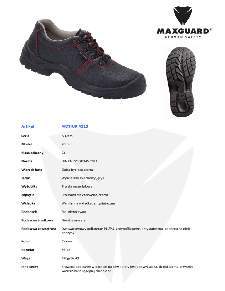 Artikel ARTHUR A310 Seria A-Class Model Półbut Klasa ochrony S3 Norma DIN EN ISO 20345:2011 Wierzch buta Skóra bydlęca czarna Język Wyściełany miechowy język Wyściółka Trwała materiałowa Zapięcie Sznurowadła czerwono/czarne Wkładka Wymienna wkładka, antystatyczna Podnosek Stal nierdzewna Podeszwa środkowa Nierdzewna stal Podeszwa zewnętrzna Dwuwarstwowy poliuretan PU/PU, antypoślizgowe, antystatyczna, odporna na oleje i benzyny Kolor Czarny Rozmiar 36-48 Waga 590g/Gr.42 Inne cechy Krawędź podeszwy w obrębie palców i pięty jest podwyższona, dzięki czemu przyszwa i wierzch buta są lepiej chronione