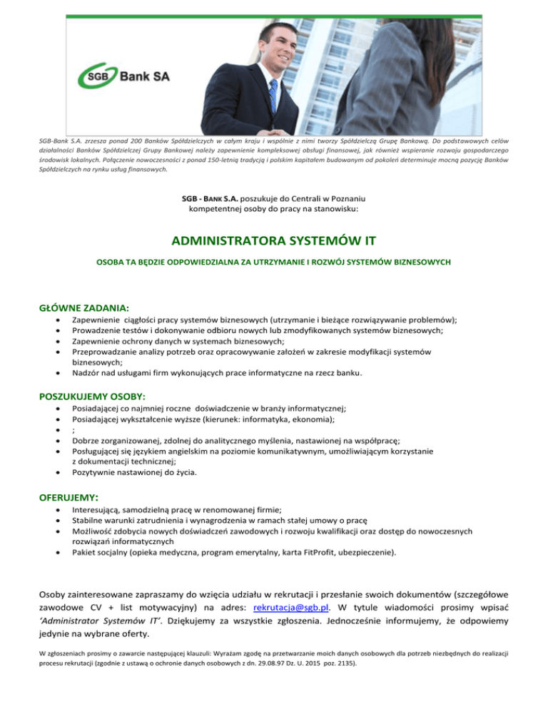 SGB-Bank S.A. zrzesza ponad 200 Banków Spółdzielczych w całym kraju i wspólnie z nimi tworzy Spółdzielczą Grupę Bankową. Do podstawowych celów działalności Banków Spółdzielczej Grupy Bankowej należy zapewnienie kompleksowej obsługi finansowej, jak również wspieranie rozwoju gospodarczego środowisk lokalnych. Połączenie nowoczesności z ponad 150-letnią tradycją i polskim kapitałem budowanym od pokoleń determinuje mocną pozycję Banków Spółdzielczych na rynku usług finansowych. SGB - BANK S.A. poszukuje do Centrali w Poznaniu kompetentnej osoby do pracy na stanowisku: ADMINISTRATORA SYSTEMÓW IT OSOBA TA BĘDZIE ODPOWIEDZIALNA ZA UTRZYMANIE I ROZWÓJ SYSTEMÓW BIZNESOWYCH GŁÓWNE ZADANIA: Zapewnienie ciągłości pracy systemów biznesowych (utrzymanie i bieżące rozwiązywanie problemów); Prowadzenie testów i dokonywanie odbioru nowych lub zmodyfikowanych systemów biznesowych; Zapewnienie ochrony danych w systemach biznesowych; Przeprowadzanie analizy potrzeb oraz opracowywanie założeń w zakresie modyfikacji systemów biznesowych; Nadzór nad usługami firm wykonujących prace informatyczne na rzecz banku. POSZUKUJEMY OSOBY: Posiadającej co najmniej roczne doświadczenie w branży informatycznej; Posiadającej wykształcenie wyższe (kierunek: informatyka, ekonomia); ; Dobrze zorganizowanej, zdolnej do analitycznego myślenia, nastawionej na współpracę; Posługującej się językiem angielskim na poziomie komunikatywnym, umożliwiającym korzystanie z dokumentacji technicznej; Pozytywnie nastawionej do życia. OFERUJEMY: Interesującą, samodzielną pracę w renomowanej firmie; Stabilne warunki zatrudnienia i wynagrodzenia w ramach stałej umowy o pracę Możliwość zdobycia nowych doświadczeń zawodowych i rozwoju kwalifikacji oraz dostęp do nowoczesnych rozwiązań informatycznych Pakiet socjalny (opieka medyczna, program emerytalny, karta FitProfit, ubezpieczenie). Osoby zainteresowane zapraszamy do wzięcia udziału w rekrutacji i przesłanie swoich dokumentów (szczegółowe zawodowe CV + list motywacyjny) na adres: [email protected]. W tytule wiadomości prosimy wpisać ‘Administrator Systemów IT’. Dziękujemy za wszystkie zgłoszenia. Jednocześnie informujemy, że odpowiemy jedynie na wybrane oferty. W zgłoszeniach prosimy o zawarcie następującej klauzuli: Wyrażam zgodę na przetwarzanie moich danych osobowych dla potrzeb niezbędnych do realizacji procesu rekrutacji (zgodnie z ustawą o ochronie danych osobowych z dn. 29.08.97 Dz. U. 2015 poz. 2135).