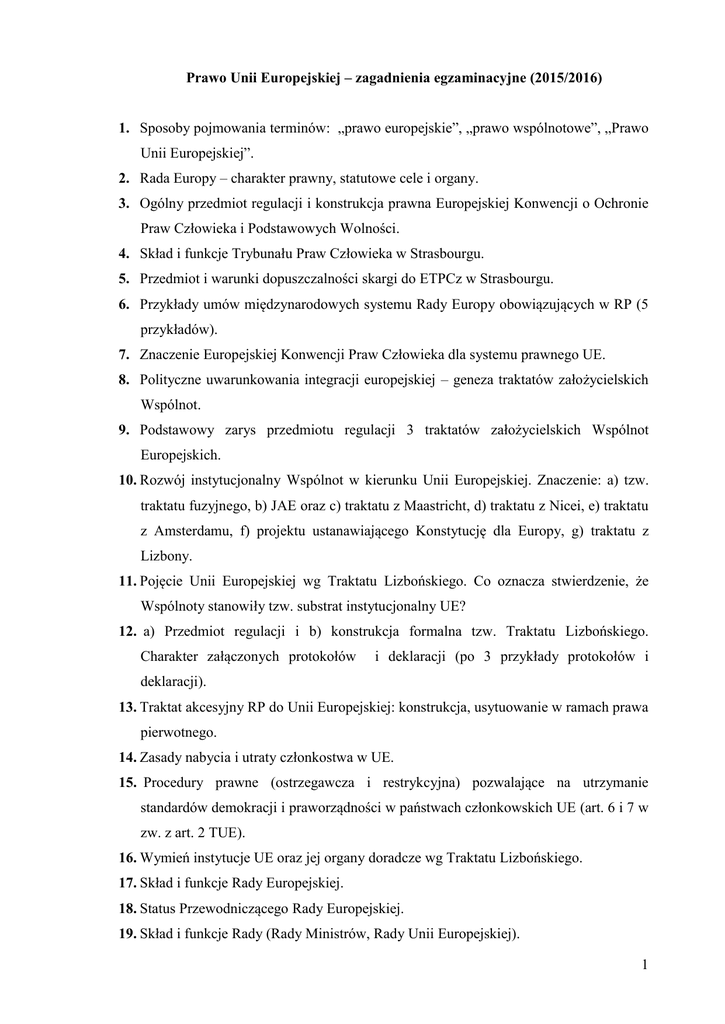Zagadnienia egzaminacyjne z prawa Unii Europejskiej