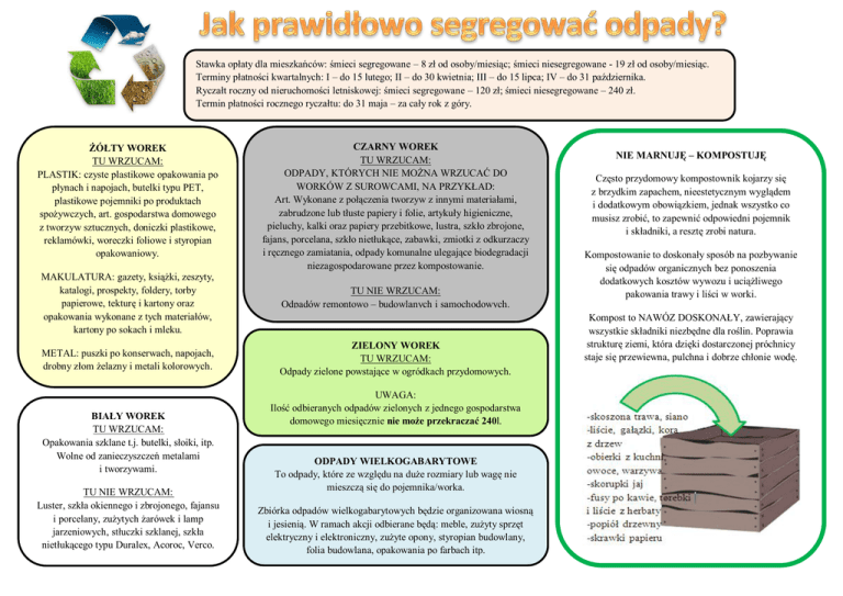 Stawka opłaty dla mieszkańców: śmieci segregowane – 8 zł od osoby/miesiąc; śmieci niesegregowane - 19 zł od osoby/miesiąc. Terminy płatności kwartalnych: I – do 15 lutego; II – do 30 kwietnia; III – do 15 lipca; IV – do 31 października. Ryczałt roczny od nieruchomości letniskowej: śmieci segregowane – 120 zł; śmieci niesegregowane – 240 zł. Termin płatności rocznego ryczałtu: do 31 maja – za cały rok z góry. ŻÓŁTY WOREK TU WRZUCAM: PLASTIK: czyste plastikowe opakowania po płynach i napojach, butelki typu PET, plastikowe pojemniki po produktach spożywczych, art. gospodarstwa domowego z tworzyw sztucznych, doniczki plastikowe, reklamówki, woreczki foliowe i styropian opakowaniowy. CZARNY WOREK TU WRZUCAM: ODPADY, KTÓRYCH NIE MOŻNA WRZUCAĆ DO WORKÓW Z SUROWCAMI, NA PRZYKŁAD: Art. Wykonane z połączenia tworzyw z innymi materiałami, zabrudzone lub tłuste papiery i folie, artykuły higieniczne, pieluchy, kalki oraz papiery przebitkowe, lustra, szkło zbrojone, fajans, porcelana, szkło nietłukące, zabawki, zmiotki z odkurzaczy i ręcznego zamiatania, odpady komunalne ulegające biodegradacji niezagospodarowane przez kompostowanie. MAKULATURA: gazety, książki, zeszyty, katalogi, prospekty, foldery, torby papierowe, tekturę i kartony oraz opakowania wykonane z tych materiałów, kartony po sokach i mleku. TU NIE WRZUCAM: Odpadów remontowo – budowlanych i samochodowych. METAL: puszki po konserwach, napojach, drobny złom żelazny i metali kolorowych. ZIELONY WOREK TU WRZUCAM: Odpady zielone powstające w ogródkach przydomowych. BIAŁY WOREK TU WRZUCAM: Opakowania szklane t.j. butelki, słoiki, itp. Wolne od zanieczyszczeń metalami i tworzywami. TU NIE WRZUCAM: Luster, szkła okiennego i zbrojonego, fajansu i porcelany, zużytych żarówek i lamp jarzeniowych, stłuczki szklanej, szkła nietłukącego typu Duralex, Acoroc, Verco. UWAGA: Ilość odbieranych odpadów zielonych z jednego gospodarstwa domowego miesięcznie nie może przekraczać 240l. ODPADY WIELKOGABARYTOWE To odpady, które ze względu na duże rozmiary lub wagę nie mieszczą się do pojemnika/worka. Zbiórka odpadów wielkogabarytowych będzie organizowana wiosną i jesienią. W ramach akcji odbierane będą: meble, zużyty sprzęt elektryczny i elektroniczny, zużyte opony, styropian budowlany, folia budowlana, opakowania po farbach itp. NIE MARNUJĘ – KOMPOSTUJĘ Często przydomowy kompostownik kojarzy się z brzydkim zapachem, nieestetycznym wyglądem i dodatkowym obowiązkiem, jednak wszystko co musisz zrobić, to zapewnić odpowiedni pojemnik i składniki, a resztę zrobi natura. Kompostowanie to doskonały sposób na pozbywanie się odpadów organicznych bez ponoszenia dodatkowych kosztów wywozu i uciążliwego pakowania trawy i liści w worki. Kompost to NAWÓZ DOSKONAŁY, zawierający wszystkie składniki niezbędne dla roślin. Poprawia strukturę ziemi, która dzięki dostarczonej próchnicy staje się przewiewna, pulchna i dobrze chłonie wodę.