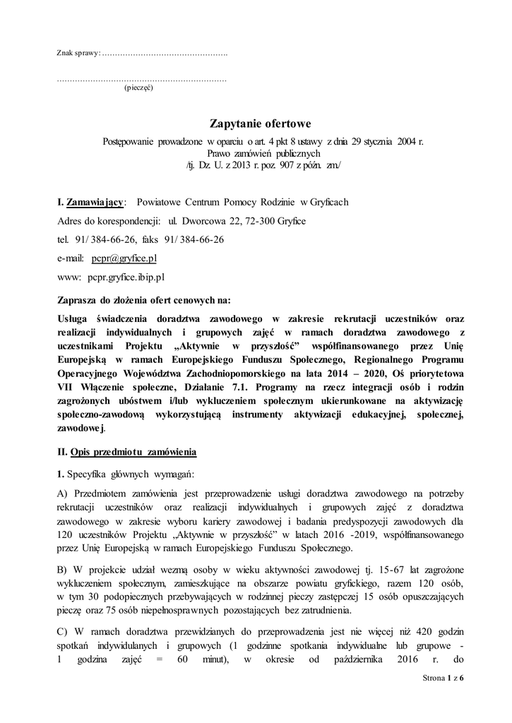 Znak sprawy: …………………………………………. ………………………………………………………… (pieczęć) Zapytanie ofertowe Postępowanie prowadzone w oparciu o art. 4 pkt 8 ustawy z dnia 29 stycznia 2004 r. Prawo zamówień publicznych /tj. Dz. U. z 2013 r. poz. 907 z późn. zm./ I. Zamawiający: Powiatowe Centrum Pomocy Rodzinie w Gryficach Adres do korespondencji: ul. Dworcowa 22, 72-300 Gryfice tel. 91/ 384-66-26, faks 91/ 384-66-26 e-mail: [email protected] www: pcpr.gryfice.ibip.pl Zaprasza do złożenia ofert cenowych na: Usługa świadczenia doradztwa zawodowego w zakresie rekrutacji uczestników oraz realizacji indywidualnych i grupowych zajęć w ramach doradztwa zawodowego z uczestnikami Projektu „Aktywnie w przyszłość” współfinansowanego przez Unię Europejską w ramach Europejskiego Funduszu Społecznego, Regionalnego Programu Operacyjnego Województwa Zachodniopomorskiego na lata 2014 – 2020, Oś priorytetowa VII Włączenie społeczne, Działanie 7.1. Programy na rzecz integracji osób i rodzin zagrożonych ubóstwem i/lub wykluczeniem społecznym ukierunkowane na aktywizację społeczno-zawodową wykorzystującą instrumenty aktywizacji edukacyjnej, społecznej, zawodowe j. II. Opis przedmiotu zamówienia 1. Specyfika głównych wymagań: A) Przedmiotem zamówienia jest przeprowadzenie usługi doradztwa zawodowego na potrzeby rekrutacji uczestników oraz realizacji indywidualnych i grupowych zajęć z doradztwa zawodowego w zakresie wyboru kariery zawodowej i badania predyspozycji zawodowych dla 120 uczestników Projektu „Aktywnie w przyszłość” w latach 2016 -2019, współfinansowanego przez Unię Europejską w ramach Europejskiego Funduszu Społecznego. B) W projekcie udział wezmą osoby w wieku aktywności zawodowej tj. 15-67 lat zagrożone wykluczeniem społecznym, zamieszkujące na obszarze powiatu gryfickiego, razem 120 osób, w tym 30 podopiecznych przebywających w rodzinnej pieczy zastępczej 15 osób opuszczających pieczę oraz 75 osób niepełnosprawnych pozostających bez zatrudnienia. C) W ramach doradztwa przewidzianych do przeprowadzenia jest nie więcej niż 420 godzin spotkań indywidulanych i grupowych (1 godzinne spotkania indywidualne lub grupowe 1 godzina zajęć = 60 minut), w okresie od października 2016 r. do Strona 1 z 6 31 sierpnia 2019 r. Realizacja projektu podzielona jest na 3 lata, w każdym roku udział w projekcie weźmie inna grupa 40 uczestników, łącznie w okresie trzech lat 120 osób. Spotkania powinny odbywać się od poniedziałku do piątku w godzinach pomiędzy 8.00 a 18.00, w siedzibie PCPR w Gryficach lub w miejscu wskazanym przez Zamawiającego na terenie powiatu gryfickiego. Zamawiający zastrzega możliwość zmiany systemu spotkań. D) Celem usługi jest: 1. Udział w Zespole Rekrutacyjnym i przeprowadzenie spotkań indywidualnych z potencjalnymi uczestnikami celem wyłonienia łącznie grupy 120 osób (40 osób w każdym roku) do uczestnictwa w projekcie oraz osób na listę rezerwową projektu w latach 2016 -2019. Przewidzianych do przeprowadzenia jest ok. 1 godz. na uczestnika, łącznie 120 godzin spotkań w latach 2016 -2019. Dla każdego roku realizacji projektu przewiduje się oddzielny proces rekrutacji uczestników. Przeprowadzenie procesu rekrutacji powinno nastąpić: a) w roku 2016 do 15 listopada 2016 r. b) w roku 2017 do 15 września 2017 r. c) w roku 2018 do 15 września 2018 r. 2. Prowadzenie indywidualnych i grupowych spotkań w zakresie doradztwa zawodowego z uczestnikami projektu celem wyboru kariery zawodowej i badania predyspozycji zawodowych. E) Wymagania związane z wykonaniem przedmiotu zamówienia: I. W ramach udziału w Zespole Rekrutacyjnym i spotkań z potencjalnymi uczestnikami doradca zawodowy zobowiązany jest w szczególności do: 1) Sporządzenia opinii o uczestniku, w której ocenie poddane zostaną zasoby osobiste, kompetencje, problem zawodowy oraz postawa w zakresie motywacji do zmiany swojej sytuacji zawodowej wraz z opracowaną indywidualną ścieżką reintegracji zawodowej, które zostaną włączone do tzw. kwestionariusza kwalifikacyjnomotywacyjnego uczestnika projektu; 2) współpracy z Zespołem projektowym, w szczególności z pracownikiem socjalnym przy określaniu indywidualnych ścieżek reintegracji społecznej i zawodowej dla uczestników projektu. II. W zakresie realizacji indywidualnych i grupowych zajęć z doradztwa zawodowego: 1. Prowadzenie zajęć indywidualnych i grupowych z uczestnikami projektu w zakresie wyboru kariery zawodowej i badania predyspozycji zawodowych. Przewidzianych do przeprowadzenia jest nie więcej niż 300 godzin spotkań w latach 2016 -2019. Przeprowadzenie zajęć nastąpi w terminie: a) w roku 2016 /2017 - do 31 sierpnia 2017 r. – 92 godz. b) w roku 2017 /2018 - do 31 sierpnia 2018 r. – 104 godz. c) w roku 2018 /2019 - do 31 sierpnia 2019 r. – 104 godz. Szczegółowy termin realizacji zajęć zostanie ustalony w uzgodnieniu z Zamawiającym. Strona 2 z 6 2. Celem wsparcia będzie w szczególności przeprowadzenie oceny i zdiagnozowanie potrzeb uczestników projektu i opracowanie Indywidualnych Planów Działania (IPD) oraz działania ukierunkowane na podjęcie zatrudnienia przez Uczestnika projektu. 3. Doradztwo indywidualne i grupowe obejmować będzie: 1) indywidualne konsultacje uczestnika projektu, obejmujące: a) analizę potrzeb: identyfikacja oczekiwań, bilans kompetencji, poziomu wykształcenia i doświadczenia zawodowego, b) test predyspozycji i określenie z uczestnikiem problemu do rozwiązania, c) omówienie sytuacji na lokalnym rynku pracy, d) omówienie sytuacji Uczestnika na rynku pracy i jego doświadczeń wpływających na pozostawanie bez zatrudnienia, d) ustalenie ścieżki rozwoju zawodowego i udziału w projekcie, e) kompleksowe wsparcie w trakcie projektu w zakresie planowania kariery, przygotowania do podjęcia zatrudnienia i rozwoju kompetencji zawodowych or