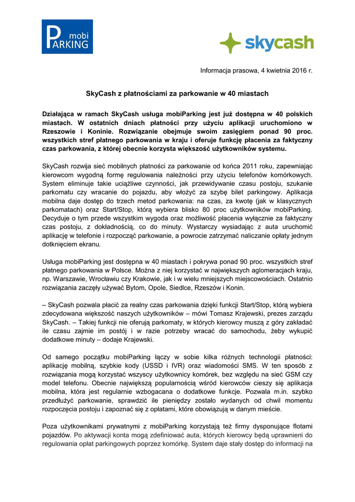 Informacja prasowa, 4 kwietnia 2016 r. SkyCash z płatnościami za parkowanie w 40 miastach Działająca w ramach SkyCash usługa mobiParking jest już dostępna w 40 polskich miastach. W ostatnich dniach płatności przy użyciu aplikacji uruchomiono w Rzeszowie i Koninie. Rozwiązanie obejmuje swoim zasięgiem ponad 90 proc. wszystkich stref płatnego parkowania w kraju i oferuje funkcję płacenia za faktyczny czas parkowania, z której obecnie korzysta większość użytkowników systemu. SkyCash rozwija sieć mobilnych płatności za parkowanie od końca 2011 roku, zapewniając kierowcom wygodną formę regulowania należności przy użyciu telefonów komórkowych. System eliminuje takie uciążliwe czynności, jak przewidywanie czasu postoju, szukanie parkomatu czy wracanie do pojazdu, aby włożyć za szybę bilet parkingowy. Aplikacja mobilna daje dostęp do trzech metod parkowania: na czas, za kwotę (jak w klasycznych parkomatach) oraz Start/Stop, którą wybiera blisko 80 proc użytkowników mobiParking. Decyduje o tym przede wszystkim wygoda oraz możliwość płacenia wyłącznie za faktyczny czas postoju, z dokładnością, co do minuty. Wystarczy wysiadając z auta uruchomić aplikację w telefonie i rozpocząć parkowanie, a powrocie zatrzymać naliczanie opłaty jednym dotknięciem ekranu. Usługa mobiParking jest dostępna w 40 miastach i pokrywa ponad 90 proc. wszystkich stref płatnego parkowania w Polsce. Można z niej korzystać w największych aglomeracjach kraju, np. Warszawie, Wrocławiu czy Krakowie, jak i w wielu mniejszych miejscowościach. Ostatnio rozwiązania zaczęły używać Bytom, Opole, Siedlce, Rzeszów i Konin. – SkyCash pozwala płacić za realny czas parkowania dzięki funkcji Start/Stop, którą wybiera zdecydowana większość naszych użytkowników – mówi Tomasz Krajewski, prezes zarządu SkyCash. – Takiej funkcji nie oferują parkomaty, w których kierowcy muszą z góry zakładać ile czasu zajmie im postój i w razie potrzeby wracać do samochodu, żeby wykupić dodatkowe minuty – dodaje Krajewski. Od samego początku mobiParking łączy w sobie kilka różnych technologii płatności: aplikację mobilną, szybkie kody (USSD i IVR) oraz wiadomości SMS. W ten sposób z rozwiązania mogą korzystać wszyscy użytkownicy komórek, bez względu na sieć GSM czy model telefonu. Obecnie największą popularnością wśród kierowców cieszy się aplikacja mobilna, która jest regularnie wzbogacana o dodatkowe funkcje. Pozwala m.in. szybko przedłużyć parkowanie, sprawdzić ile pieniędzy zostało wydanych od chwil momentu rozpoczęcia postoju i zapoznać się z opłatami, które obowiązują w danym mieście. Poza użytkownikami prywatnymi z mobiParking korzystają też firmy dysponujące flotami pojazdów. Po aktywacji konta mogą zdefiniować auta, których kierowcy będą uprawnieni do regulowania opłat parkingowych poprzez komórkę. System daje stały dostęp do informacji na temat kosztów postoju i pozwala działom księgowości zbiorczo rozliczać parkowanie wszystkich służbowych samochodów. *** SkyCash SkyCash to największy w Polsce system płatności i usług mobilnych dla telefonów komórkowych, pozwalający m.in. w szybki i wygodny sposób kupować bilety komunikacji miejskiej i opłacać parkowanie w blisko 40 polskich miastach. Aplikacja umożliwia także kupowanie biletów kolejowych większości polskich przewoźników, w tym PKP Intercity i Przewozów Regionalnych, jak również zakup biletów do kina, wypłacanie gotówki z bankomatów bez użycia karty oraz natychmiastowe przelewy pomiędzy użytkownikami i płatności za domowe rachunki. Wszystkie transakcje są zabezpieczone na poziomie bankowości mobilnej i kart płatniczych. W 2014 roku, SkyCash otrzymał nagrodę Złoty Bell w konsumenckiej kategorii „Aplikacja roku 2013”. Usługa mobiParking została natomiast uhonorowana nagrodą Lokalizator Roku 2014, przyznaną w kategorii aplikacji dla kierowców, w ramach konferencji Navigation Trends for Drivers. W październiku 2015 r. firma zajęła pierwsze miejsce w Polsce oraz drugie w Europie w Deloitte Technology Fast 50 - rankingu najszybciej rozwijających się firm technologicznie innowacyjnych w Europie Środkowej. Sukces został powtórzony w rankingu Deloitte Technology Fast 500 EMEA, gdzie SkyCash uplasował się na 46 miejscu, zajmując jednocześnie najwyższą pozycję spośród wszystkich polskich spółek, które znalazły się w zestawieniu. W marcu 2016 r. Tomasz Krajewski, prezes spółki, znalazł się na drugim miejscu w przygotowanym przez magazyn Brief rankingu 50 najbardziej kreatywnych w biznesie. SkyCash został też nominowany do tegorocznej edycji programu Najwyższa Jakość Quality International. Więcej informacji: www.skycash.com www.facebook.com/skycash Kontakt dla mediów: Łukasz Bardyszewski tel.: 605-530-455 e-mail: [email protected]