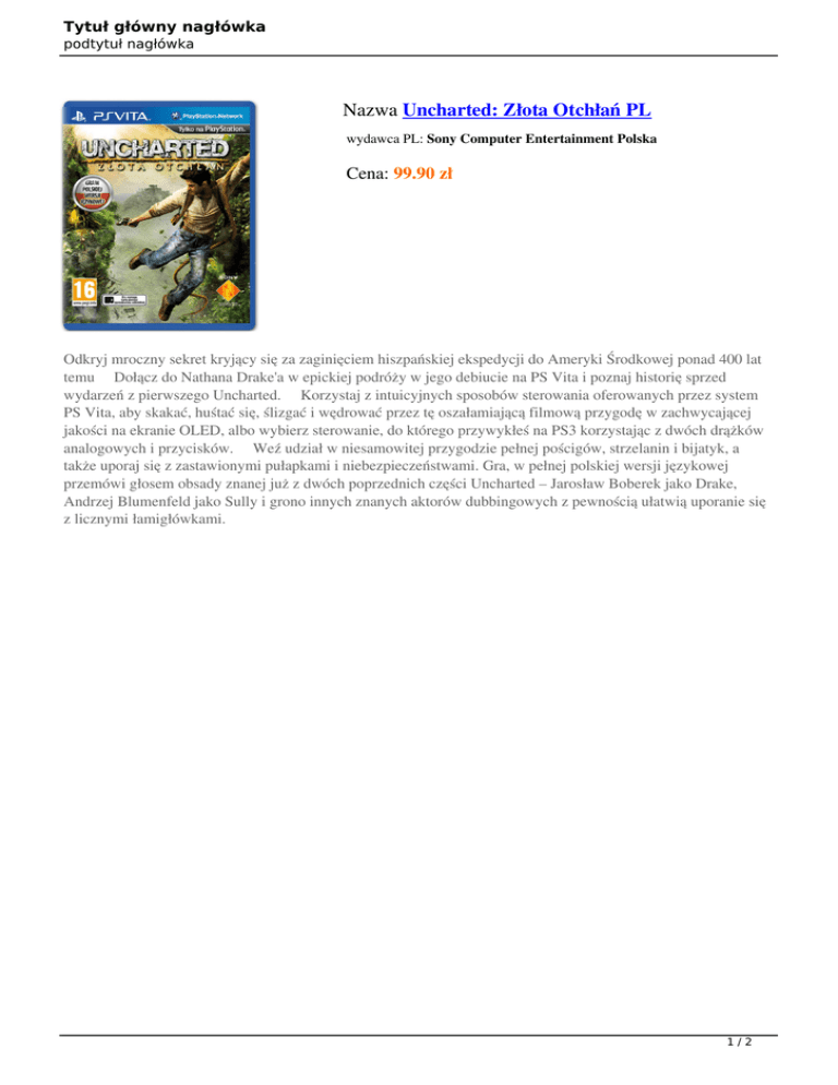 Tytuł główny nagłówka podtytuł nagłówka Nazwa Uncharted: Złota Otchłań PL wydawca PL: Sony Computer Entertainment Polska Cena: 99.90 zł Odkryj mroczny sekret kryjący się za zaginięciem hiszpańskiej ekspedycji do Ameryki Środkowej ponad 400 lat temu Dołącz do Nathana Drake'a w epickiej podróży w jego debiucie na PS Vita i poznaj historię sprzed wydarzeń z pierwszego Uncharted. Korzystaj z intuicyjnych sposobów sterowania oferowanych przez system PS Vita, aby skakać, huśtać się, ślizgać i wędrować przez tę oszałamiającą filmową przygodę w zachwycającej jakości na ekranie OLED, albo wybierz sterowanie, do którego przywykłeś na PS3 korzystając z dwóch drążków analogowych i przycisków. Weź udział w niesamowitej przygodzie pełnej pościgów, strzelanin i bijatyk, a także uporaj się z zastawionymi pułapkami i niebezpieczeństwami. Gra, w pełnej polskiej wersji językowej przemówi głosem obsady znanej już z dwóch poprzednich części Uncharted – Jarosław Boberek jako Drake, Andrzej Blumenfeld jako Sully i grono innych znanych aktorów dubbingowych z pewnością ułatwią uporanie się z licznymi łamigłówkami. 1/2 Tytuł główny nagłówka podtytuł nagłówka Nazwa Wartość Wydawca PL Sony Computer Entertainment Polska Data premiery 22-go lutego 2012 Producent Tryb gry Kategoria wiekowa Wersja językowa Wymagania sprzętowe Naughty Dog Single Player 16+ PL PS Vita 2/2
