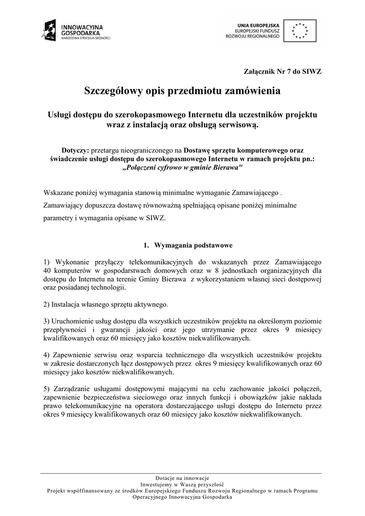 Załącznik Nr 7 do SIWZ Szczegółowy opis przedmiotu zamówienia Usługi dostępu do szerokopasmowego Internetu dla uczestników projektu wraz z instalacją oraz obsługą serwisową. Dotyczy: przetargu nieograniczonego na Dostawę sprzętu komputerowego oraz świadczenie usługi dostępu do szerokopasmowego Internetu w ramach projektu pn.: ,,Połączeni cyfrowo w gminie Bierawa" Wskazane poniżej wymagania stanowią minimalne wymaganie Zamawiającego . Zamawiający dopuszcza dostawę równoważną spełniającą opisane poniżej minimalne parametry i wymagania opisane w SIWZ. 1. Wymagania podstawowe 1) Wykonanie przyłączy telekomunikacyjnych do wskazanych przez Zamawiającego 40 komputerów w gospodarstwach domowych oraz w 8 jednostkach organizacyjnych dla dostępu do Internetu na terenie Gminy Bierawa z wykorzystaniem własnej sieci dostępowej oraz posiadanej technologii. 2) Instalacja własnego sprzętu aktywnego. 3) Uruchomienie usług dostępu dla wszystkich uczestników projektu na określonym poziomie przepływności i gwarancji jakości oraz jego utrzymanie przez okres 9 miesięcy kwalifikowanych oraz 60 miesięcy jako kosztów niekwalifikowanych. 4) Zapewnienie serwisu oraz wsparcia technicznego dla wszystkich uczestników projektu w zakresie dostarczonych łącz dostępowych przez okres 9 miesięcy kwalifikowanych oraz 60 miesięcy jako kosztów niekwalifikowanych. 5) Zarządzanie usługami dostępowymi mającymi na celu zachowanie jakości połączeń, zapewnienie bezpieczeństwa sieciowego oraz innych funkcji i obowiązków jakie nakłada prawo telekomunikacyjne na operatora dostarczającego usługi dostępu do Internetu przez okres 9 miesięcy kwalifikowanych oraz 60 miesięcy jako kosztów niekwalifikowanych. Dotacje na innowacje Inwestujemy w Waszą przyszłość Projekt współfinansowany ze środków Europejskiego Funduszu Rozwoju Regionalnego w ramach Programu Operacyjnego Innowacyjna Gospodarka 6) W sytuacjach losowych (np. zmiana miejsca zamieszkania Beneficjenta Ostatecznego) Wykonawca zapewni przeniesienie i aktywację łącza internetowego na nowy adres, wskazany przez Zamawiającego na terenie Gminy Bierawa. 7) W sytuacji wskazania przez Zamawiającego lokalizacji, w której nie istnieje możliwość technicznej dla instalacji przedmiotu umowy Wykonawca ma prawo odmówić aktywacji łącza internetowego pod nowym adresem jeżeli uzasadni odmowę na piśmie podając konkretne powody technicznej niemożności aktywacji łącza internetowego. 2. Zestawienie ogólnych zasad dla infrastruktury sieciowej oraz parametrów technicznych 1) Wykonawca zapewni dostęp do sieci Internet poprzez zastosowanie dostępnych i osiągalnych rozwiązań technologicznych (systemy przewodowe, systemy bezprzewodowe). 2) Wykonawca zrealizuje dostęp do sieci Internet przy wykorzystaniu własnej sieci dostępowej, własnych urządzeń klienckich (przewodowych/bezprzewodowych) oraz wszelkich innych własnych niezbędnych urządzeń sieciowych aby realizować usługi o dobrej jakości oraz odpowiednim poziomie bezpieczeństwa. 3) Zamawiający dysponuje obiektami wysokościowymi oraz nieruchomościami budynkowymi i gruntowymi, które Wykonawca może wykorzystać do budowy połączeń dostępowych. W przypadku ich wykorzystania Wykonawca będzie ponosił koszty dzierżawy, które Wykonawca powinien ustalić przed złożeniem oferty wraz z warunkami wykorzystania tych nieruchomości oraz uwzględnić w złożonej ofercie. 4) Wykonawca jako operator telekomunikacyjny będzie w całości odpowiedzialny za jakość świadczonych usług oraz bezpieczeństwo połączeń jak również będzie stroną w przypadku naruszenia prawa (np. przestępstwa internetowe, naruszenia praw autorskich itp.) i udostępni bezpośrednio dane klienta odpowiednim służbom państwowym. Minimalne wymagania dla systemu monitorującego Użytkownika. Dostarczone rozwiązanie musi być objęte bezterminową licencją dla 98 stacji roboczych oraz 24 miesięczna asystą upgrade systemu i wsparcia technicznego. Wykonawca przeprowadzi szkolenie techniczne dla administratorów systemu w zakresie instalacji, konfiguracji oraz sporządzania wymaganych raportów. Oprogramowanie monitorujące jest elementem wyposażenia każdej stacji roboczych. Agent monitorujący musi się komunikować z serwerem zestawiając połączenie VPN oraz: a) agent tworzy bezpiecznych połączeń sieciowe w oparciu o algorytm AES128,AES192,AES256 Dotacje na innowacje Inwestujemy w Waszą przyszłość Projekt współfinansowany ze środków Europejskiego Funduszu Rozwoju Regionalnego w ramach Programu Operacyjnego Innowacyjna Gospodarka b) system tworzy kanał bezpieczeństwa obsługujący wszystkie protokoły sieciowe w tym TCP,UDP,ICMP c) agent instaluje wirtualną kartę sieciową w celu ustawienia komunikacji z serwerem d) agent musi pracować za firewallem oraz Nat dzięki połączeniu pasywnemu(komunikacja musi być w obie strony. Wysyłać komunikaty oraz przyjmować) e) komunikacja poprzez protokół UDP f) agent musi zestawiać połączenie przed zalogowaniem użytkownika do systemu operacyjnego. g) obsługa połączeń LAN,WAN,WIRELESS, GSM, GPRS Minimalne funkcje agenta monitorującego: 1) Agent zapisuje szyfrowane informacje: - o czasie pracy komputera - o dokonaniu zmian w sprzęcie komputerowym Jako szyfrowany, ukryty plik Zapis informacji musi się odbywać on-line podczas pracy agenta w systemie operacyjnym. Użytkownik na prawach "użytkownika" nie może mieć możliwości zmodyfikowania, usunięcia lub uszkodzenia danych w zapisanych w pliku. W przypadku pracy na prawach administracyjnych użytkownika dokonanie zmiany w pliku wymagane jest aby system automatycznie wykrył zmianę i poinformował o takiej próbie. 2) Agent powinien wykonywać backup całego dysku komputera poprzez wykonanie tzw. IMAGE (obrazu dysku). Przywrócenie danych odbywa się wyłączenie na odtworzeniu całego systemu operacyjnego i zawartych w nim dokumentów