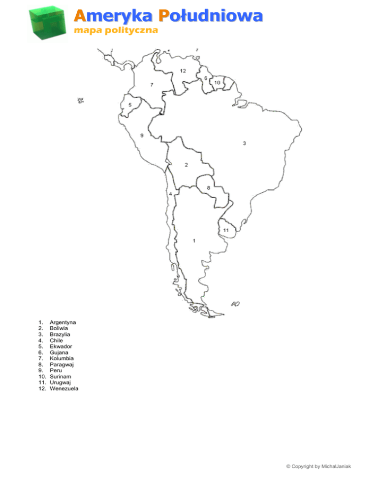 Ameryka Południowa mapa polityczna 1. 2. 3. 4. 5. 6. 7. 8. 9. 10. 11. 12. Argentyna Boliwia Brazylia Chile Ekwador Gujana Kolumbia Paragwaj Peru Surinam Urugwaj Wenezuela © Copyright by MichalJaniak