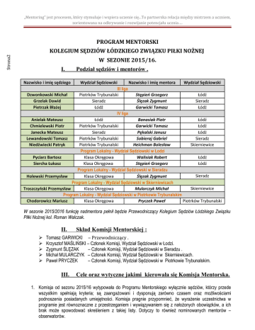 „Mentoring” jest procesem, który stymuluje i wspiera uczenie się...To partnerska relacja między mistrzem a uczniem, zorientowana na odkrywanie i rozwijanie potencjału ucznia…. PROGRAM MENTORSKI Strona2 KOLEGIUM SĘDZIÓW ŁÓDZKIEGO ZWIĄZKU PIŁKI NOŻNEJ W SEZONIE 2015/16. I. Podział sędziów i mentorów . Nazwisko i imię sędziego Wydział Sędziowski Nazwisko i imię mentora Wydział Sędziowski III liga Dzwonkowski Michał Piotrków Trybunalski Stępień Grzegorz Łódź Grzelak Dawid Sieradz Ślęzak Zygmunt Sieradz Pietrzak Błażej Łódź Garwicki Tomasz Łódź IV liga Anielak Mateusz Łódź Banasiak Piotr Łódź Chmielewski Piotr Piotrków Trybunalski Garwicki Tomasz Łódź Janecka Mateusz Sieradz Pękalski Janusz Łódź Lewandowski Tomasz Piotrków Trybunalski Sobieraj Gabriel Sieradz Niedźwiecki Patryk Piotrków Trybunalski Heichman Bolesław Skierniewice Program Lokalny - Wydział Sędziowski w Łodzi Pyciarz Bartosz Klasa Okręgowa Walisiak Robert Łódź Siercha Łukasz Klasa Okręgowa Stępień Grzegorz Łódź Program Lokalny - Wydział Sędziowski w Sieradzu Sieradz Holewski Przemysław Klasa Okręgowa Ślęzak Zygmunt Program Lokalny - Wydział Sędziowski w Skierniewicach Skierniewice Troszczyński Przemysław Klasa Okręgowa Mularczyk Michał Program Lokalny - Wydział Sędziowski w Piotrkowie Trybunalskim Chodorowicz Mariusz Klasa Okręgowa Pryczek Paweł Piotrków Trybunalski W sezonie 2015/2016 funkcję nadmentora pełnił będzie Przewodniczący Kolegium Sędziów Łódzkiego Związku Piłki Nożnej kol. Roman Walczak. II. Skład Komisji Mentorskiej : Tomasz GARWICKI – Przewodniczący . Krzysztof MAŚLIŃSKI – Członek Komisji, Wydział Sędziowski w Łodzi. Zygmunt ŚLĘZAK – Członek Komisji, Wydział Sędziowski w Sieradzu . Michał MULARCZYK – Członek Komisji, Wydział Sędziowski w Skierniewicach. Paweł PRYCZEK – Członek Komisji, Wydział Sędziowski w Piotrkowie Trybunalskim. III. Cele oraz wytyczne jakimi kierowała się Komisja Mentorska. 1. Komisja od sezonu 2015/16 wytypowała do Programu Mentorskiego wyłącznie sędziów, którzy przede wszystkim spełniają kryteria; są zaangażowani i dysponują zarówno czasem oraz możliwościami podnoszenia posiadanych umiejętności. Komisja pragnie przypomnieć, że wyrażenie uczestnictwa w programie jest równoznaczne z przestrzeganiem i wywiązywaniem się z nałożonych obowiązków, a ich brak może spowodować skreśleniem z takiej listy. Dotyczy to również nominowanych mentorów – obserwatorów. Strona2 „Mentoring” jest procesem, który stymuluje i wspiera uczenie się...To partnerska relacja między mistrzem a uczniem, zorientowana na odkrywanie i rozwijanie potencjału ucznia…. 2. Podstawowymi kryteriami, które były brane pod uwagę przy wyborze kandydata sędziego w programie, to między innymi osiągane wyniki, zaangażowanie w swój rozwój oraz organizację sędziowską oraz prognoza dająca prawdopodobieństwo awansu do wyższej klasy rozgrywkowej. 3. Komisja zobowiązuje się do przeprowadzenia szkoleń, warsztatów dla uczestników programu. Ilość szkoleń, tematyka zostanie dostosowana do potrzeb uczestników. Komisja przypomina, że obecność na szkoleniach jest obowiązkowa. 4. Otrzymane przez KS PZPN środki na program mentorski, Komisja zobowiązuje się na ich rozdysponowanie w ramach ponoszonych kosztów organizacji szkoleń oraz zwrotu delegacji mentorskich dla delegowanych obserwatorów. 5. Rozliczanie delegacji mentorskich przez mentorów: Od rundy jesiennej 2015 roku każdy mentor może przeprowadzić nieograniczoną ilość obserwacji mentorskich swojego podopiecznego. Przy czym 3 obserwacje ( w każdej rundzie) będą płatne ryczałtowo zgodnie z tabelą ryczałtów każdej klasy rozgrywkowej plus koszty dojazdu, pozostałe społeczne. Maksymalny koszt dojazdu na szczeblu III i IV ligi – do 50zł, zaś w klasach niższych do 38zł. Koszty rozliczania delegacji nadmentora będą na podobnych zasadach, z tym , że nadmentor może obserwować sędziego tylko jeden raz w każdej rundzie. Delegacje będą rozliczane jak w poprzednich latach przez księgowość ŁZPN, po uprzedniej akceptacji Komisji Mentorskiej. 6. Termin ostateczny do rozliczania delegacji mentorskich przez obserwatorów ustala się na dzień 15.12.2015r – runda jesienna, a w rundzie wiosennej do dnia 20.06.2016r. 7. Komisja przypomina o przestrzeganiu 5-cio dniowego terminu przesyłania raportu mentora na stronę programu mentorskiego. Raport jest również źródłem wiedzy i selekcji, nie tylko dla talenta. Przesyłanie raportu ze znacznym przekroczeniem terminu jest zdecydowanie mało progresywne. 8. Mentor i talent współpracują według własnej ustalonej strategii. Nie będzie Komisja decydowała kiedy mentor ma jechać na mecz prowadzony przez swojego podopiecznego. Mentor zobowiązany jest każdorazowo zgłosić taką informacje , że wybiera się ma mecz swojego talenta i przesyłać maila na stronę programu mentorskiego. 9. SAMOOCENA – sędziowie – talenci zobowiązani są do aktywnej pracy na rzecz udoskonalania swoich posiadanych umiejętności. Komisja zobowiązuje wszystkich talentów do nagrania w każdej rudnie sezonu 2015/16 dwóch sędziowanych zawodów w najwyższej klasie rozgrywkowej jaką posiadają. Z nagranych spotkań sędziowie obowiązkowo sporządzą samoocenę wraz z prezentacją (klipy) problematycznych lub kontrowersyjnych decyzji. Samoocena winna być przesłana na stronę [email protected] oraz swojego mentora. Uwagi techniczne: arkusz samooceny sędzia zobowiązany jest przesłać ciągu 10 dni od przeprowadzonych zawodów. Kamera jest do dyspozycji sędziów. Sporządzenie samooceny przez talenta jest warunkiem koniecznym uczestnika programu mentorskiego. 10. Sędziowie są zobowiązani każdorazowo do przesyłania swoich raportów z obserwacji, na stronę programu mentorskiego oraz mentora. 11. Komisja dysponuje : kamerą ora