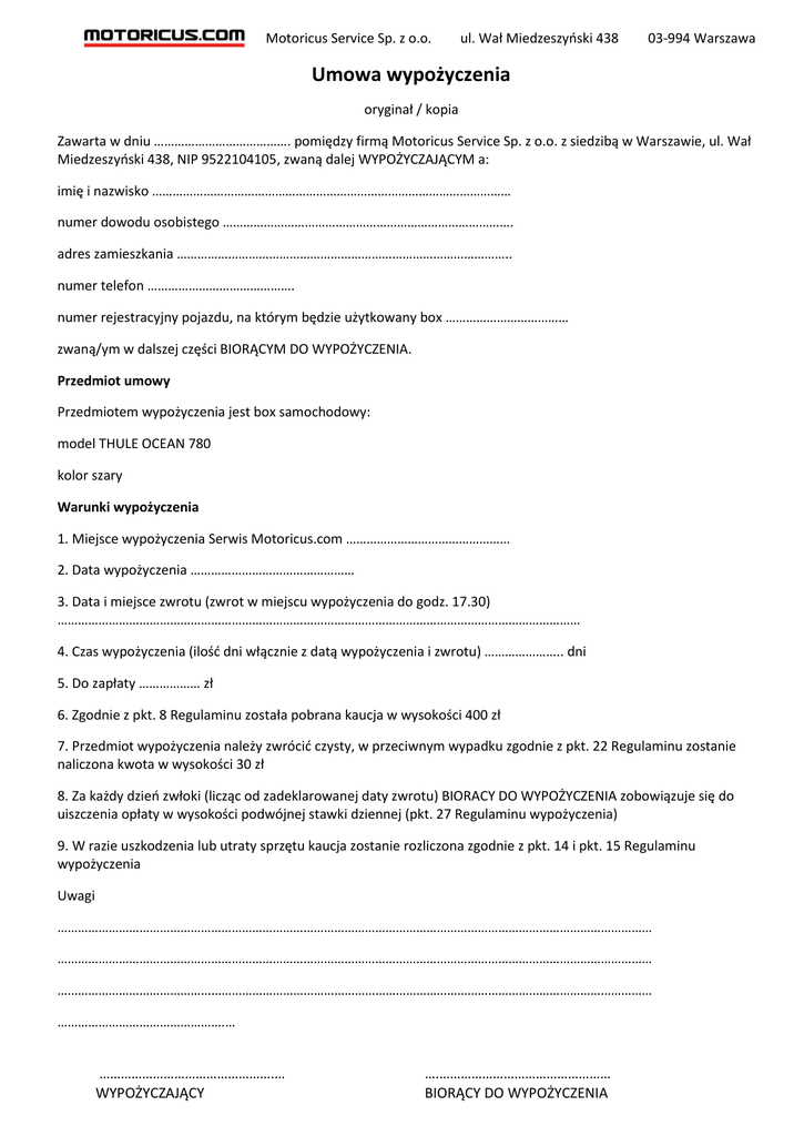 Motoricus Service Sp. z o.o. ul. Wał Miedzeszyński 438 03-994 Warszawa Umowa wypożyczenia oryginał / kopia Zawarta w dniu …………………………………. pomiędzy firmą Motoricus Service Sp. z o.o. z siedzibą w Warszawie, ul. Wał Miedzeszyński 438, NIP 9522104105, zwaną dalej WYPOŻYCZAJĄCYM a: imię i nazwisko …………………………………………………………………………………………… numer dowodu osobistego …………………………………………………………………………. adres zamieszkania …………………………………………………………………………………….. numer telefon ……………………………………. numer rejestracyjny pojazdu, na którym będzie użytkowany box ……………………………… zwaną/ym w dalszej części BIORĄCYM DO WYPOŻYCZENIA. Przedmiot umowy Przedmiotem wypożyczenia jest box samochodowy: model THULE OCEAN 780 kolor szary Warunki wypożyczenia 1. Miejsce wypożyczenia Serwis Motoricus.com ………………………………………… 2. Data wypożyczenia ………………………………………… 3. Data i miejsce zwrotu (zwrot w miejscu wypożyczenia do godz. 17.30) ……………………………………………………………………………………………………………………………………… 4. Czas wypożyczenia (ilość dni włącznie z datą wypożyczenia i zwrotu) ………………….. dni 5. Do zapłaty ……………… zł 6. Zgodnie z pkt. 8 Regulaminu została pobrana kaucja w wysokości 400 zł 7. Przedmiot wypożyczenia należy zwrócić czysty, w przeciwnym wypadku zgodnie z pkt. 22 Regulaminu zostanie naliczona kwota w wysokości 30 zł 8. Za każdy dzień zwłoki (licząc od zadeklarowanej daty zwrotu) BIORACY DO WYPOŻYCZENIA zobowiązuje się do uiszczenia opłaty w wysokości podwójnej stawki dziennej (pkt. 27 Regulaminu wypożyczenia) 9. W razie uszkodzenia lub utraty sprzętu kaucja zostanie rozliczona zgodnie z pkt. 14 i pkt. 15 Regulaminu wypożyczenia Uwagi ………………………………………………………………………………………………………………………………………………………… ………………………………………………………………………………………………………………………………………………………… ………………………………………………………………………………………………………………………………………………………… ………………………………………….… ………………………………………….… WYPOŻYCZAJĄCY ….………………………………………… BIORĄCY DO WYPOŻYCZENIA