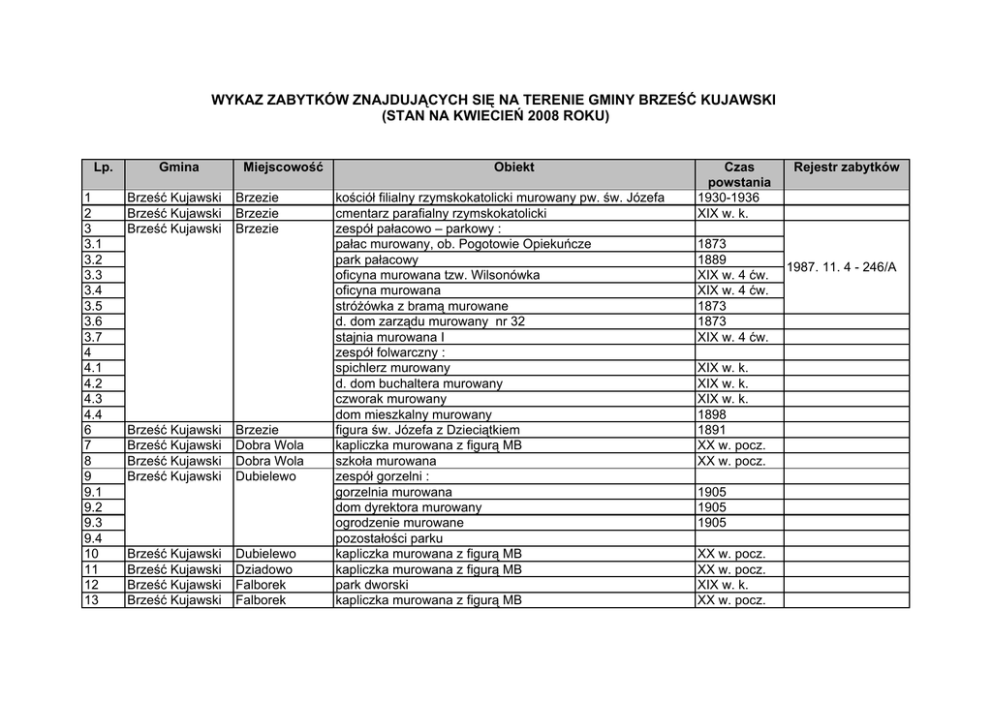 wykaz zabytków znajdujących się na terenie gminy brześć kujawsk