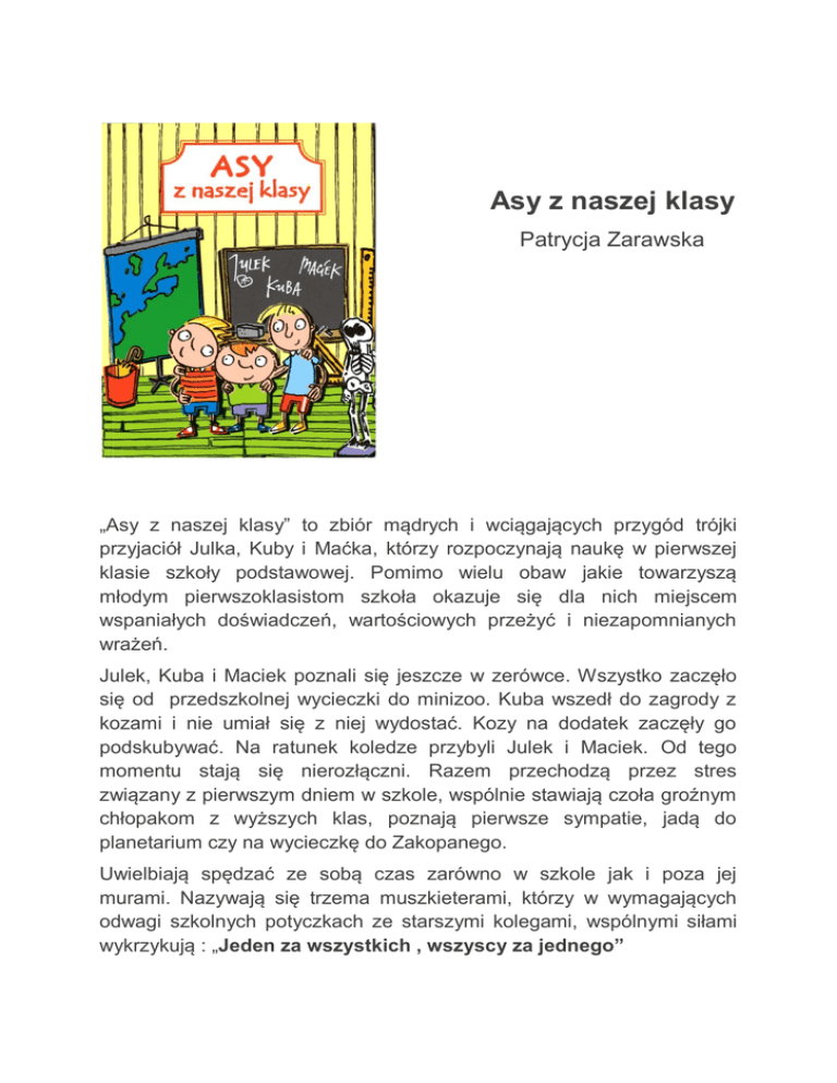 Asy z naszej klasy Patrycja Zarawska „Asy z naszej klasy” to zbiór mądrych i wciągających przygód trójki przyjaciół Julka, Kuby i Maćka, którzy rozpoczynają naukę w pierwszej klasie szkoły podstawowej. Pomimo wielu obaw jakie towarzyszą młodym pierwszoklasistom szkoła okazuje się dla nich miejscem wspaniałych doświadczeń, wartościowych przeżyć i niezapomnianych wrażeń. Julek, Kuba i Maciek poznali się jeszcze w zerówce. Wszystko zaczęło się od przedszkolnej wycieczki do minizoo. Kuba wszedł do zagrody z kozami i nie umiał się z niej wydostać. Kozy na dodatek zaczęły go podskubywać. Na ratunek koledze przybyli Julek i Maciek. Od tego momentu stają się nierozłączni. Razem przechodzą przez stres związany z pierwszym dniem w szkole, wspólnie stawiają czoła groźnym chłopakom z wyższych klas, poznają pierwsze sympatie, jadą do planetarium czy na wycieczkę do Zakopanego. Uwielbiają spędzać ze sobą czas zarówno w szkole jak i poza jej murami. Nazywają się trzema muszkieterami, którzy w wymagających odwagi szkolnych potyczkach ze starszymi kolegami, wspólnymi siłami wykrzykują : „Jeden za wszystkich , wszyscy za jednego” „Asy z naszej klasy” to doskonała lektura zarówno dla przedszkolaków przygotowujących się do pójścia do szkoły, obecnych pierwszoklasistów, oraz starszych uczniów szkoły podstawowej. Świat widzimy oczami Julka, który w charakterystyczny dla siebie sposób opisuje rzeczywistość jaka go otacza, a robi to w sposób nie pozbawiony humoru oraz uroczych spostrzeżeń. „Asy z naszej klasy” mogą pomóc w oswojeniu się z myślą o pierwszym dniu w szkole. Odczarowuje pierwszy stres, lęk przed nieznanym oraz pokazuje jak ważne i trwałe mogą stać się przyjaźnie zawierane w tym okresie życia. Książka dodatkowo zachwyca doskonałymi rysunkami, które przypominają komiksowe ilustracje idealnie oddające niezwykle zabawną treść. Wybrane fragmenty książki: „No i co z tą szkołą-bać się czy nie bać? Pewnie szkołę trzeba po prostu sprawdzić. Ale cieszy się na zapas na pewno nie będę. Nie ma mowy!” „To było w zerówce. Znaliśmy się z Kubą i Maćkiem już wcześniej, ale właśnie wtedy staliśmy się trzema muszkieterami- nierozłącznymi, nieustraszonymi i niezwyciężonymi dzieciakami.” „Widzicie? W naszej szkole jest bardzo fajnie. Byłem zły na Tomka, że naopowiadał mi tyle bzdur o srogich nauczycielach, pytonach i innych andronach. Jarek (mój starszy brat) wytłumaczy mi, że Tomkowi pewnie coś w szkole nie wyszło i dlatego próbował obrzydzić mi życie.” „Mówię wam Tatry są bardzo wysokie. Trzeba mocno zadziera głowę, żeby się im przyjrzeć, aż szyja może zaboleć.” „Smocza Jama okazała się taka sobie. Wobec tego rodzice Kuby orzekli, że zabiorą nas do porządnej jaskini. Niestety szło się do niej ścieżką pod górę . Uf, gdybym był z własnymi rodzicami, na pewno bym ich poinformował, że mnie bolą nogi.” „A ja oglądałem z mamą program o japońskich potrawach- wyjaśnił Maciek-Szef kuchni miał takie wielki nóż jak miecz samurajski. Wymiatał nim, aż miło. Robił sasimi, to taka potrawa z plasterków.”