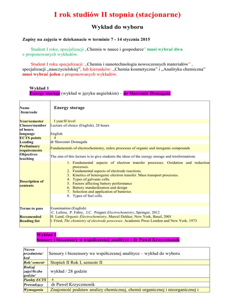 I rok studiów II stopnia (stacjonarne) Wykład do wyboru Zapisy na zajęcia w dziekanacie w terminie 7 - 14 stycznia 2015 Student I roku, specjalizacji „Chemia w nauce i gospodarce” musi wybrać dwa z proponowanych wykładów. Student I roku specjalizacji: „Chemia i nanotechnologia nowoczesnych materiałów” , specjalizacji „nauczycielskiej”, lub kierunków: „Chemia kosmetyczna” i „Analityka chemiczna” musi wybrać jeden z proponowanych wykładów. Wykład 1 Energy storage (wykład w języku angielskim) – dr Sławomir Domagała Energy storage Name Item/code Year/semester Classes/number of hours language ECTS points Leading Preliminary requirements Objectives teaching I year/II level Lecture of choice (English), 28 hours English 4 dr Sławomir Domagała Fundamentals of electrochemistry, redox processes of organic and inorganic compounds The aim of this lecture is to give students the ideas of the energy storage and trnsformations 1. Fundamental aspects of electron transfer processes. Oxidation and reduction processes. 2. Fundamental aspects of electrode reactions. 3. Kinetics of heterogenic electron transfer. Mass transport processes. 4. Types of galvanic cells. 5. Factors affecting battery performance 6. Battery standardization and design 7. Selection and application of batteries 8. Types of fuel cells. Description of contents Terms to pass Recomended Reading list Examination (English) C. Lefrou, P. Fabry, J.C. Poignet Electrochemistry, Springer, 2012 H. Lund, Organic Electrochemistry, Marcel Dekker, New York, Basel, 2001 I. Fried, The chemistry of electrode processes. Academic Press London and New York, 1973 Wykład 2 Sensory i biosensory w współczesnej analityce - dr Paweł Krzyczmonik Nazwa przedmiotu/ kod Rok/ semestr Rodzaj zajęć/liczba godzin/ Punkty ECTS Prowadzący Wymagania Sensory i biosensory we współczesnej analityce – wykład do wyboru Stopień II Rok I, semestr II wykład / 28 godzin 4 dr Paweł Krzyczmonik Znajomość podstaw analizy chemicznej, chemii organicznej i nieorganicznej i wstępne Cele dydaktyczne Opis treści zajęć Metody Nauczania Warunki zaliczenia elektrochemii. Zapoznanie studentów z budową i działaniem sensorów i biosensorów oraz z ich zastosowaniami w analizie. Przedstawienie zasad projektowania sensorów i technik ich wytwarzania. Rozpoznawanie chemiczne, selektywność, specyficzność, czułość, precyzja. Metody chemicznej modyfikacji powierzchni: polimery przewodzące, silanizacja, samoorganizacja (self- asemmbly), metody zol-żel. Membrany półprzepuszczalne i jonoselektywne Sensory elektrochemiczne : równowagi międzyfazowe: granica faz elektroda/roztwór, potencjał ciekłego złącza, potencjał dyfuzyjne, potencjał Donnana, potencjał membrany jonoselektywnej. elektrody modyfikowane, nanostruktury, modyfikacje nanostruktur, mikroelektrody, wdrukowywanie molekularne, screen printed electrodes. Metody detekcji stosowane w sensorach elektrochemicznych. Sensory optyczne: podstawowe wiadomości z optyki światłowodów, budowa i działanie jonowych i gazowych sensorów optycznych. Sensory elektryczne Sensory masowe: zjawiska piezo- i piroelektryczne. Sensory termiczne: sensory piroelektryczne i gazowe sensory katalityczne. Biosensory: metody immobilizacji enzymów i białek, materiały biokatalityczne, systemy detekcji w biosensorach. Analiza przepływowa Miniaturyazcjia w analityce Matryce sensorów, Micro Total Chemical Analysis Systems (μ-TAS) układy LAB-on -CHIP Przykłady komercyjnych zastosowań sensorów i biosensorów w analizie chemicznej, środowiska, biochemicznej i medycznej. Wykład informacyjny i problemowy z prezentacją multimedialną. na podstawie obecności i na podstawie pisemnego opracowania wybranych zagadnienień z tematyki wykładu. 1. Z. Brzózka, W. Wróblewski, „Sensory chemiczne”, Oficyna Wydawnicza Politechniki Warszawskiej,W-wa 1999. 2. Pr. zbiorowa pod red Z.Brzózki „Miniaruryzacjia w analityce”, Oficyna Wydawnicza Politechniki Warszawskiej, W-wa 2005 3. J. Janata, „Principles of Chemical Sensors”, Springer, wyd. 2, 2009 4. P. Gründler, “Chemical Sensors, An Introduction for Scientists and Engineers”, Springer, 2007 5. P. N. Bartlett (ed.), “Bioelectrochemietry, fundamentals, experimental Zalecana lista techniques and applications”, Willey & Sons, 2008. lektur 6. W. Szczepaniak, „Metody Instrumentalne w analizie chemicznej”, PWN, Wwa 2010. 7. O.Hammerich, J.Ulstrup „Bioinorganic electrochemistry” Springer, 2008 8. A.J.Bard, G.Inzelt, F.Scholz, Electrochemical Dictionary Springer,2008 9. M. Orłowska, Praca doktorska, Uniwersytet Gdański, Wydział Chemii, Gdańsk 2010 10. M. Łoś, „Biosensory jako nowoczesne narzędzie w diagnostyce i detekcji.” IChF UG Wykład 3 Podstawy biotechnologii i inżynierii genetycznej – prof. UŁ dr hab. Bartłomiej Pałecz Podstawy biotechnologii i inżynierii genetycznej. Cele przedmiotu Przekazanie i przyswojenie naukowych podstaw oraz zastosowań biotechnologii. Krótkie zapoznanie słuchaczy z historią biotechnologii. Krótkie wprowadzenie Zrozumienie i nauczenie zasad metod oraz technik stosowanych w procesach współczesnej biotechnologicznych i inżynierii genetycznej. Poznanie operacji i procesów zachodzących podczas produkcji bioproduktów, z zachowaniem wszelkich procedur związanych z ochroną środowiska. Wymagania wstępne - student posiada podstawową wiedzę z chemii bioorganicznej, chemii fizycznej oraz genetyki - słuchacz potrafi opisać procesy biochemiczne zachodzące w organizmach żywych oraz przeanalizować podstawowe szlaki metaboliczne Efekty kształcenia - ma wiedzę z zakresu podstaw biotechnologii - rozumie i analizuje procesy biotechnologiczne stosowane w produkcji żywności - ma podstawową wiedzę o metodyce, technikach, urządzeniach i materiałach stosowanych w procesach biotechnologicznych. - uzyskuje podstawową wiedzę z zakresu zastosowania metod biotechnologicznych w prze