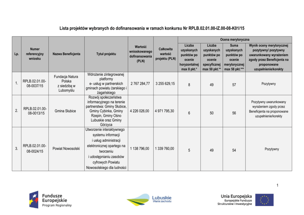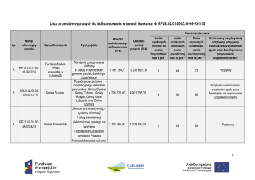 Lista projektów wybranych do dofinansowania w ramach konkursu Nr RPLB.02.01.00-IZ.00-08-K01/15 Ocena merytoryczna Lp. 1. Numer referencyjny wniosku Nazwa Beneficjenta RPLB.02.01.0008-0037/15 Fundacja Natura Polska z siedzibą w Lubomyślu 2. RPLB.02.01.0008-0013/15 Gmina Słubice 3. RPLB.02.01.0008-0024/15 Powiat Nowosolski Tytuł projektu Wartość Całkowita wnioskowanego wartość dofinansowania projektu (PLN) (PLN) Wdrożenie zintegrowanej platformy e- usług w partnerskich 2 767 284,77 gminach powiatu żarskiego i żagańskiego Rozwój społeczeństwa informacyjnego na terenie partnerstwa: Gminy Słubice, Gminy Cybinka, Gminy 4 226 026,00 Rzepin, Gminy Ośno Lubuskie oraz Gminy Górzyca Utworzenie interaktywnego systemu informacji i usług administracji elektronicznej opartego na 1 138 796,00 tworzeniu i udostępnianiu zasobów cyfrowych Powiatu Nowosolskiego dla ludności 3 255 629,15 4 971 795,30 1 339 760,00 Liczba uzyskanych punktów po ocenie horyzontalnej max 8 pkt.* 8 Liczba Suma uzyskanych uzyskanych punktów po punktów po ocenie ocenie specyficznej merytorycznej max 50 pkt.** max 58 pkt.*** 49 57 6 50 56 5 49 54 Wynik oceny merytorycznej pozytywny/ pozytywny uwarunkowany wyrażeniem zgody przez Beneficjenta na proponowane uzupełnienie/korekty Pozytywny Pozytywny uwarunkowany wyrażeniem zgody przez Beneficjenta na proponowane uzupełnienie/korekty Pozytywny 1 Miejski Zakład Gospodarki Komunalnej Sp. z o.o. w Nowej Soli 4. RPLB.02.01.0008-0011/15 4. Wojewódzka i Miejska Biblioteka Publiczna RPLB.02.01.00im. Zbigniewa 08-0018/15 Herberta w Gorzowie Wlkp. 6. RPLB.02.01.0008-0004/15 Miasto Zielona Góra 6. RPLB.02.01.0008-0027/15 Przedsiębiorstwo Usług Komunalnych USKOM Sp. z o.o. w Kożuchowie 6. RPLB.02.01.0008-0038/15 Regionalne Centrum Animacji Kultury 9. RPLB.02.01.0008-0007/15 Powiat Zielonogórski 10. RPLB.02.01.0008-0040/15 Miasto Gorzów Wielkopolski Budowa systemu informacji przestrzennej (GIS) oraz platformy e-usług dla 2 029 630,00 Miejskiego Zakładu Gospodarki Komunalnej Sp. z o.o. w Nowej Soli Rozbudowa usług elektronicznych Wojewódzkiej i Miejskiej 1 197 259,00 Biblioteki Publicznej im. Zbigniewa Herberta w Gorzowie Wlkp. Wdrożenie innowacyjnych eusług o wysokim poziomie dojrzałości 6 209 532,92 w Urzędzie Miasta Zielona Góra Budowa systemu e-usług dla mieszkańców w Przedsiębiorstwie Usług 1 604 126,80 Komunalnych "USKOM" Sp. z o.o. Rozbudowa zintegrowanego sytemu e-usług 599 907,90 Regionalnego Centrum Animacji Kultury 2 939 700,00 8 44 52 Pozytywny 1 433 140,00 8 44 52 Pozytywny Pozytywny 7 305 332,85 8 43 51 Pozytywny 2 321 265,84 8 43 51 705 774,00 8 43 51 Pozytywny 2 567 765,00 3 020 900,00 6 44 50 Pozytywny Rozwój elektronicznych usług świadczonych przez Urząd 7 588 239,00 Miasta Gorzowa Wlkp. oraz udostępniania danych 8 927 340,00 8 41 49 Pozytywny e-Geodezja Powiatu Zielonogórskiego 2 publicznych 10. RPLB.02.01.0008-0005/15 Gmina Iłowa 12. RPLB.02.01.0008-0010/15 Gmina Czerwieńsk 12. RPLB.02.01.0008-0026/15 Rozwój elektronicznych usług dla ludności tworzenie i wdrożenie interaktywnych usług administracji elektronicznej w Gminie Iłowa Wdrożenie kompleksowego pakietu IT dla mieszkańców Gminy Czerwieńsk poprzez budowę zintegrowanego systemu informatycznego Miejskie Zakłady Wdrożenie e –usług dla MZK Komunalne Sp. z o.o. SP. z o.o. w Kostrzynie nad Odrą 383 175,75 450 795,00 8 41 49 Pozytywny 649 255,50 763 830,00 8 40,5 48,5 Pozytywny 843 200,00 1 220 160,00 7 41,5 48,5 Pozytywny Budowa Systemu Informacji Przestrzennej (GIS) w Przedsiębiorstwie Wodociągów i Kanalizacji Sp. z o.o. w Gorzowie Wlkp. 1 099 900,00 1 591 620,00 8 40 48 Pozytywny 14. RPLB.02.01.0008-0020/15 Przedsiębiorstwo Wodociągów i Kanalizacji Sp. z o.o. w Gorzowie Wlkp. 15. RPLB.02.01.0008-0002/15 Gmina Lubiszyn Rozwój e-usług w Gminie Lubiszyn 1 060 167,63 1 285 706,03 8 39,5 47,5 Pozytywny 15. RPLB.02.01.0008-0023/15 Gmina Sulęcin Cyfrowy krok w nowoczesne społeczeństwo 1 375 436,00 1 990 336,80 6 41,5 47,5 Pozytywny 3 17. RPLB.02.01.0008-0003/15 Gmina Nowa Sól Miasto Nowa era informatyczna w Nowej Soli pakiet info-usług dla mieszkańców 848 736,90 Wdrożenie ZSI oraz elektronicznych usług dla Sulechowskie ludności przez RPLB.02.01.00Przedsiębiorstwo 17. Sulechowskie 2 661 021,90 08-0017/15 Komunalne Przedsiębiorstwo „SuPeKom” Komunalne „SuPeKom” Sp. z o.o w Sulechowie Budowa i wdrożenie publicznego, RPLB.02.01.00interaktywnego systemu 19. Gmina Łagów 274 966,50 08-0025/15 usług administracji samorządowej w Gminie Łagów Budowa Centrum Zarządzania siecią Gminy Gmina Krosno 20. RPLB.02.01.00Krosno Odrzańskie wraz 2 365 105,02 08-0032/15 Odrzańskie z pakietem e-Usług dla mieszkańców Budowa systemu informacji Zakład Wodociągów przestrzennej (GIS) w ZWiK 21. RPLB.02.01.00- i Kanalizacji Sp. z o. o. Sp. z o.o. w Żarach wraz 1 031 900,00 08-0009/15 w Żarach z uruchomieniem e-usług dla mieszkańców Rozwój technologii informacyjnoRPLB.02.01.00komunikacyjnych oraz e22. Gmina Sulechów 2 216 575,60 08-0006/15 usług i aplikacji dla mieszkańców gminy Sulechów i gminy Kargowa 998 514,00 Pozytywny 8 39 47 6 41 47 Pozytywny 323 490,00 6 40 46 Pozytywny 2 782 476,50 8 36,5 44,5 Pozytywny 1 493 220,00 8 36 44 Pozytywny 2 607 736,00 5 38 43 Pozytywny 3 850 655,22 4 23. RPLB.02.01.0008-0022/15 24. RPLB.02.01.0008-0042/15 Gmina Świebodzin Rozwój e-usług dla mieszkańców gminy Świebodzin 875 386,69 1 029 866,70 8 33,5 41,5 Pozytywny Muzeum Ziemi Lubuskiej w Zielonej Górze Stworzenie portalu e-usług w Muzeum Ziemi Lubuskiej 413 992,50 599 071,50 5,5 35,5 41 Pozytywny 25. RPLB.02.01.0008-0019/15 Gmina Słońsk Rozwój elektronicznych usług publicznych w Gminie Słońsk 528 581,00 624 620,00 7 33,5 40,5 Pozytywny 26. RPLB.02.01.0008-0033/15 Powiat Słubicki Rozwój e-usług w Powiecie Słubickim 1 233 951,37 1 451 707,50 4,5 35,5 40 Pozytywny Powiat Krośnieński e-Powiat Krośnieński 509 754,43 599 711,10 5