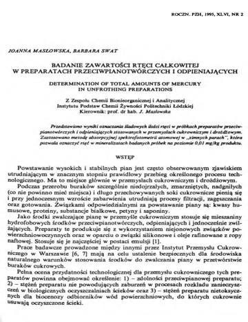 ROCZN. PZH, 1995, XLVI, NR 2 146 J. M asłowska, В. Swat Nr 2 Celem pracy było określenie poziomu zanieczyszczeń rtęcią preparatów szeroko stosowanych w Polsce w cukrownictwie, głównie w procesach dyfuzji soku, saturacji, nawapniania, zatężania i gotowania cukrzycy oraz do wód spławiakowych. Zarządzenie Ministra Zdrowia i Opieki Społecznej z dnia 31 marca 1993 r. w sprawie wykazu substancji dodatkowych dozwolonych i zanieczyszczeń technicz nych w środkach spożywczych i używkach przewiduje, że dopuszczalne zanieczysz czenie rtęcią nie powinno przekraczać 0,03 mg/kg produktu, jeżeli zawartość substan cji dodatkowej w środku spożywczym nie przekracza 1 g/kg lub 0,01 mg/kg, jeżeli zawartość dodatku w środku spożywczym przekracza 1 g/kg [8]. Rtęć i jej związki są bardzo silnie toksyczne. Wprowadzone do ustroju są bardzo powoli wydalane z organizmu i dlatego łatwo kumulują się, powodując przewlekłe zatrucia. Żywność jest głównym źródłem rtęci dla człowieka, wyłączając narażenie zawodowe. Jak wykazały badania [5] poważnym źródłem rtęci są także wody stu dzienne. Najwięcej rtęci zawierają ryby, które wybiórczo kumulują rtęć, przede wszystkim w formie związków metylortęciowych, pomimo że do rzek, jezior i mórz dostaje się ona głównie w postaci związków nieorganicznych i rtęci metalicznej. Zarówno nieorganiczne związki rtęci, jak i jej połączenia organiczne ulegają przemia nom w środowisku. Związki organiczne mogą być w środowisku łatwo rozkładane do rtęci nieorganicznej. Ta z kolei może podlegać procesowi metylacji, co ma szczególne znaczenie toksykologiczne. Doświadczalnie potwierdzono metylowanie rtęci w środo wisku wodnym przy udziale bakterii beztienowych osadów dennych, a także w śluzie na powierzchni ryb, na skutek zjawiska naturalnej metylacji, zachodzącej pod wpły wem enzymów niektórych bakterii w obecności metylokobalaminy (jednej z prostych pochodnych witaminy B 12) jako donora grup metylowych. Proces metylaqi może zachodzić również w glebie oraz w przewodzie pokarmowym ssaków. Reakcja metylacji rtęci (II) przebiega według następującego schematu [5]: Powstały chlorek metylortęci CH 3HgCl reaguje z grupami dołowymi białek, stąd też prawie wszystkie białka mogą w pewnym stopniu wiązać rtęć (II), przyczyniając się do tej kumulacji. Toksyczne działanie rtęci na organizm zależy od postaci, w jakiej ona występuje (od rodzaju i budowy związku), ponieważ decyduje to o jej wchłanianiu z przewodu pokarmowego. Wiadomo, że kation metylortęci (CH 3 — H g+) wchłania się w żywności prawie w 100%, podczas gdy jej związki nieorganiczne (np. HgCl2) tylko w około 10%, a wchłanianie rtęci metalicznej (Hg°) jest bardzo małe, mniej niż 0,01% w stosunku do wprowadzonej dawki. Na ogół przy jednorazowym podaniu toksyczność związków nieorganicznych jest większa niż organicznych. Inaczej jednak przedstawia się działanie toksyczne tych związków przy długotrwałym narażeniu (np. poprzez codzienne spożywa nie wody zanieczyszczonej rtęcią). Najbardziej niebezpieczne są związki alkilortęciowe, a w szczególności metylortęciowe, które trudno i bardzo powoli ulegają biodegradacji. Największe stężenia tych związków stwierdzono w nerkach, wątrobie, błonie śluzowej jelit, co prowadzi do ich uszkodzenia. Kumulacja i przemiany związków alkilortęciowych w mózgu i mięśniach szkieletowych wywołują zmiany neurologiczne, co w efekcie powoduje nieodwracalne uszkodzenie ośrodkowego układu nerwowego. Nr 2 R tęć w preparatach przeciwpiennych 147 Głównym źródłem rtęci dla człowieka jest żywność, dlatego zachodzi konieczność szczególnej kontroli zawartości tego pierwiastka w wodzie do picia, w środkach spożywczych, w surowcach i w substancjach dodatkowych stosowanych w produkcji żywności. Ze względu na to, że preparaty przedwpianotwórcze i odpieniające, stosowane są jako środki pomocnicze w różnych etapach produkcji cukru i drożdży i produkowane są one głównie na bazie olejów pochodzących z przerobu ropy naftowej, celowym były badania tych preparatów na zawartość toksycznych zanieczyszczeń technicz nych. Bezpośredni kontakt stosowanych preparatów z produkowanym wyrobem mo że być przyczyną przenikania substancji toksycznych do środka spożywczego. Jednak szczególne zagrożenie stanowiłoby usuwanie użytych preparatów, zanieczyszczanych rtęcią, ścieków z cukrowni, ze względu na opisane powyżej przemiany rtęci w środo wisku, a szczególnie w wodzie. Zespół nasz od wielu lat zajmuje się problemami oznaczania śladowych ilości metali ciężkich, w tym także rtęci w różnego rodzaju próbkach spożywczych [4]. Ilościowe oznaczanie śladowych zawartości rtęci wymaga coraz to bardziej efek tywnych i nowoczesnych metod analitycznych. M E T O D Y K A BADAŃ D o oznaczania śladowych ilości rtęci w próbkach preparatów przedw pianotwórczych i odpieniających zastosowano metodę spektrofotom etrii absorpcji atomowej (AAS) w „zimnych parach” . O pie ra się ona na właściwościach rtęci, która w tem peraturze pokojowej wykazuje dostateczną prężność par i względnie trudno utlenia się tlenem z powietrza. Oznaczenie polega na pom iarze absorbancji prom ieniowania m onochromatycznego o długości fali A = 253,7 nm przez pary rtęci. Rtęć (II) i rtęć (I) znajdująca się w próbce redukuje się d o postaci elementarnej (H g°) za pom ocą roztw oru chlorku cyny (II) S n G 2 i wydmuchuje z roztworu strum ie niem gazu obojętnego (He lub Ar). Pary rtęci przechodzą przez kiuwetę pom iarow ą spektrofotom etru atomowego, przez którą przepuszcza się m onochromatyczne promieniowanie. W artość absorbancji (A) prom ieniowania jest proporcjonalna do stężenia (C) rtęci w próbce. Zaw artość rtęci całkowitej oznaczano w próbkach siedmiu preparatów przedw pianotwór