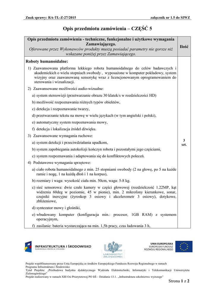 Znak sprawy: RA-TL-Z-27/2015 załącznik nr 1.5 do SIWZ Opis przedmiotu zamówienia – CZĘŚĆ 5 Opis przedmiotu zamówienia - techniczne, funkcjonalne i użytkowe wymagania Zamawiającego. Oferowane przez Wykonawców produkty muszą posiadać parametry nie gorsze niż wskazane poniżej przez Zamawiającego. Ilość Roboty humanoidalne: 1) Zaawansowana platforma lekkiego robota humanoidalnego do celów badawczych i akademickich o wielu stopniach swobody , wyposażone w komputer pokładowy, system wizyjny oraz zaawanowaną sensorykę wraz z licencjonowanym oprogramowaniem do sterowania i wizualizacji. 2) Zaawansowane możliwości audio-wizualne: a) system stereowizji (przetwarzanie obrazu 30 klatek/s w rozdzielczości HD) b) możliwość rozpoznawania różnych typów obiektów, c) detekcja i rozpoznawanie twarzy, d) przetwarzanie tekstu na mowę w wielu językach (w tym angielski i polski), e) automatyczny system rozpoznawania mowy, f) detekcja i lokalizacja źródeł dźwięku. 3) Zaawansowane wymagania ruchowe: 3 szt. a) system detekcji i przeciwdziałania upadkom, b) system zapobiegania autokolizji kończyn robota i pozostałymi jego częściami, c) system rozpoznawania i adaptowania się do konfliktowych poleceń. 4) Podstawowe wymagania sprzętowe: a) ciało robota humanoidalnego z min. 25 stopniami swobody (2 na głowę, po 5 na każde ramie i nogę, 1 na każdą dłoń i 1 na korpus), b) rozmiary i waga: wysokość ciała min. 50cm, waga: 5-8 kg. c) sieć sensorowa: dwie czułe kamery w części głowowej (rozdzielczość 1.22MP, kąt widzenia 60deg w poziomie, 45 w pionie), min. 2 mikrofony kierunkowe, sonar, czujniki inercyjne (żyroskop 3 osiowy i akcelerometr 3 osiowy), dotykowe, zbliżeniowe, d) syntezator mowy i głośniki, e) wbudowany komputer (konfiguracja min.: procesor, 1GB RAM) z systemem operacyjnym, f) zasilanie: bateria wystarczająca na min. 1,5h pracy, czas ładowania 3 h, Projekt współfinansowany przez Unię Europejską ze środków Europejskiego Funduszu Rozwoju Regionalnego w ramach Programu Infrastruktura i Środowisko Tytuł Projektu: „Przebudowa budynku dydaktycznego Wydziału Elektrotechniki, Informatyki i Telekomunikacji Uniwersytetu Zielonogórskiego” Projekt realizowany w ramach XIII Osi Priorytetowej PO IiŚ – Działanie 13.1. ,,Infrastruktura szkolnictwa wyższego” Strona 1 z 2 Znak sprawy: RA-TL-Z-27/2015 załącznik nr 1.5 do SIWZ g) dodatkowa bateria rezerwowa, h) interfejs Wi-Fi oraz Ethernet. 5) Podstawowe wymagania programowe: a) SDK do programowania sterowania ruchem robota i jego systemami sensorowymi (platforma C++, Python, Matlab (oprogramowanie posiadane przez Zamawiającego)), b) oprogramowanie do generowania i programowania sekwencji ruchów robota z interfejsem graficznym typu przeciągnij i upuść oraz możliwością monitorowania pracy robota, c) wirtualny symulator pracy humanoida, d) oprogramowanie do syntezy i analizy mowy. Projekt współfinansowany przez Unię Europejską ze środków Europejskiego Funduszu Rozwoju Regionalnego w ramach Programu Infrastruktura i Środowisko Tytuł Projektu: „Przebudowa budynku dydaktycznego Wydziału Elektrotechniki, Informatyki i Telekomunikacji Uniwersytetu Zielonogórskiego” Projekt realizowany w ramach XIII Osi Priorytetowej PO IiŚ – Działanie 13.1. ,,Infrastruktura szkolnictwa wyższego” Strona 2 z 2