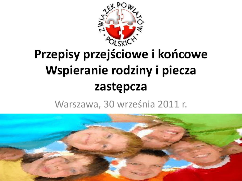 Przepisy przejściowe i końcowe Wspieranie rodziny i piecza zastępcza Warszawa, 30 września 2011 r. Umowy i decyzje Działające na podstawie dotychczasowych przepisów: 1) spokrewnione z dzieckiem rodziny zastępcze: a) tworzone przez wstępnych lub rodzeństwo, stają się rodzinami zastępczymi spokrewnionymi, w rozumieniu niniejszej ustawy, b) tworzone przez osoby inne niż wymienione w lit. a, stają się rodzinami zastępczymi niezawodowymi, w rozumieniu niniejszej ustawy; 2) niespokrewnione z dzieckiem rodziny zastępcze, stają się rodzinami zastępczymi niezawodowymi, w rozumieniu niniejszej ustawy; 3) zawodowe niespokrewnione z dzieckiem specjalistyczne rodziny zastępcze stają się rodzinami zastępczymi zawodowymi specjalistycznymi, w rozumieniu niniejszej ustawy; 4) zawodowe niespokrewnione z dzieckiem rodziny zastępcze o charakterze pogotowia rodzinnego stają się rodzinami zastępczymi zawodowymi pełniącymi funkcję pogotowia rodzinnego, w rozumieniu niniejszej ustawy. Umowy i decyzje Umowy o pełnienie funkcji zawodowej niespokrewnionej z dzieckiem rodziny zastępczej lub zawodowej niespokrewnionej z dzieckiem rodziny zastępczej o charakterze pogotowia rodzinnego, zawarte na podstawie przepisów dotychczasowych, zachowują ważność do czasu ich wygaśnięcia lub rozwiązania lub do czasu zawarcia umowy na podstawie przepisów niniejszej ustawy, nie dłużej jednak niż przez okres 3 miesięcy od dnia wejścia w życie ustawy. Przed upływem terminu 3 miesięcznego starosta na wniosek rodziny zastępczej zawiera umowę o pełnienie funkcji rodziny zastępczej zawodowej (art. 54 ustawy). Skutki finansowe o 1 stycznia 2012 r.: Wysokość otrzymywanych po dniu wejścia w życie ustawy, przysługujących na podstawie umowy wynagrodzeń, dodatków oraz świadczeń na pokrycie kosztów utrzymania dziecka lub osoby przebywającej w rodzinie zastępczej nie może być niższa od wynagrodzenia, dodatków i świadczeń otrzymywanych dotychczas i od kwot wynagrodzenia, dodatków i świadczeń określonych w niniejszej ustawie. Umowy i decyzje • Wydane na podstawie przepisów dotychczasowych decyzje w sprawie: • 1) pomocy pieniężnej na częściowe pokrycie kosztów utrzymania dziecka umieszczonego w rodzinie zastępczej, 2) opłaty za pobyt w rodzinie zastępczej dziecka lub osoby pełnoletniej, przebywającej w rodzinie zastępczej do czasu ukończenia szkoły, w której rozpoczęła naukę przed osiągnięciem pełnoletności, ponoszonej przez rodziców, 3) opłaty za pobyt w całodobowej placówce opiekuńczo-wychowawczej dziecka lub osoby pełnoletniej, przebywającej w całodobowej placówce opiekuńczowychowawczej do czasu ukończenia szkoły, w której rozpoczęła naukę przed osiągnięciem pełnoletności, ponoszonej przez rodziców zachowują moc do dnia wygaśnięcia, nie dłużej jednak niż przez okres 3 miesięcy od dnia wejścia w życie niniejszej ustawy. • • - Skutki finansowe o 1 stycznia 2012 r.: wysokość otrzymywanych po dniu wejścia w życie ustawy, przysługujących na podstawie decyzji, wynagrodzeń, dodatków oraz świadczeń na pokrycie kosztów utrzymania dziecka lub osoby przebywającej w rodzinie zastępczej lub placówce opiekuńczo-wychowawczej typu rodzinnego, nie może być niższa od wynagrodzenia, dodatków i świadczeń otrzymywanych dotychczas i od kwot wynagrodzenia, dodatków i świadczeń określonych w niniejszej ustawie. Szkolenia dla kandydatów na rodziny zastępcze • Programy szkoleń dla kandydatów do pełnienia funkcji rodziny zastępczej lub prowadzenia placówek rodzinnych zatwierdzone na podstawie przepisów dotychczasowych, obowiązują do dnia zatwierdzenia odpowiedniego programu na podstawie niniejszej ustawy, nie dłużej jednak niż przez okres 2 lat od dnia wejścia w życie niniejszej ustawy. • Do osób, które uzyskały świadectwo ukończenia szkolenia dla kandydatów do pełnienia funkcji rodziny zastępczej lub prowadzenia placówek rodzinnych, prowadzonych na podstawie przepisów dotychczasowych nie stosuje się przepisu art. 44 ust. 1. (obowiązek posiadania świadectwa ukończenia szkolenia organizowanego przez organizatora rodzinnej pieczy zastępczej). Placówki wsparcia dziennego • Publiczne placówki opiekuńczo-wychowawcze wsparcia dziennego działające na podstawie przepisów dotychczasowych, z dniem wejścia w życie niniejszej ustawy stają się placówkami wsparcia dziennego, w rozumieniu niniejszej ustawy. • Termin na dostosowanie: 12 miesięcy • Niepubliczne placówki opiekuńczo-wychowawcze wsparcia dziennego, działające na podstawie przepisów dotychczasowych, funkcjonują nie dłużej niż przez okres 12 miesięcy od dnia wejścia w życie ustawy. • Po upływie terminu placówki opiekuńczo-wychowawcze wsparcia dziennego mogą prowadzić działalność, jeżeli spełniają warunki określone w ustawie. Podmiot prowadzący placówkę niepubliczną przekazuje wójtowi dokumentację dotyczącą sprawowanej opieki nad dziećmi niezwłocznie po zaprzestaniu działalności, nie później jednak niż w terminie 14 dni. Placówki całodobowe • • • • • • Całodobowe placówki opiekuńczo-wychowawcze typu interwencyjnego/socjalizacyjnego/rodzinnego, działające na podstawie przepisów dotychczasowych, z dniem wejścia w życie ustawy, stają się placówkami opiekuńczowychowawczymi typu interwencyjnego/socjalizacyjnego/rodzinnego, w rozumieniu niniejszej ustawy. Wielofunkcyjne całodobowe placówki opiekuńczo-wychowawcze, działające na podstawie przepisów dotychczasowych, z dniem wejścia w życie niniejszej ustawy, stają się placówkami opiekuńczo-wychowawczymi typu socjalizacyjnego, interwencyjnego oraz specjalistyczno-terapeutycznego, w rozumieniu ustawy. Regionalne placówki opiekuńczo-wychowawcze, działające na podstawie przepisów dotychczasowych, z dniem wejścia w życie niniejszej ustawy, stają się regionalnymi placówkami opiekuńczo-terapeut