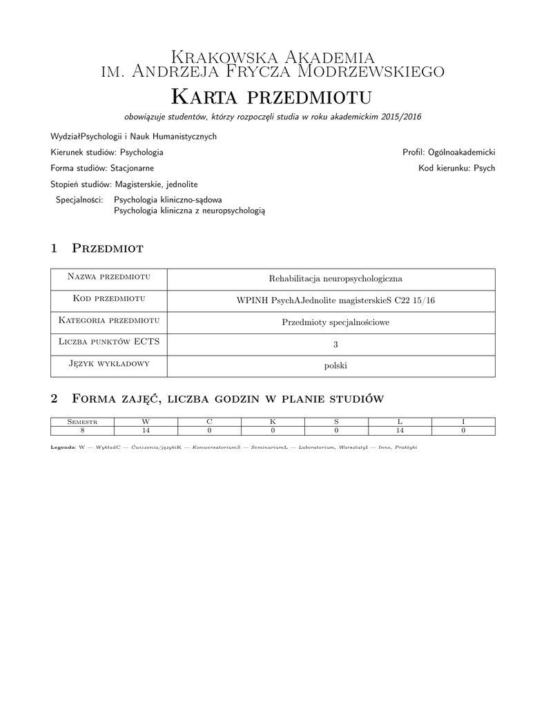 Krakowska Akademia im. Andrzeja Frycza Modrzewskiego Karta przedmiotu obowiązuje studentów, którzy rozpoczęli studia w roku akademickim 2015/2016 WydziałPsychologii i Nauk Humanistycznych Kierunek studiów: Psychologia Profil: Ogólnoakademicki Forma studiów: Stacjonarne Kod kierunku: Psych Stopień studiów: Magisterskie, jednolite Specjalności: 1 2 Psychologia kliniczno-sądowa Psychologia kliniczna z neuropsychologią Przedmiot Nazwa przedmiotu Rehabilitacja neuropsychologiczna Kod przedmiotu WPINH PsychAJednolite magisterskieS C22 15/16 Kategoria przedmiotu Przedmioty specjalnościowe Liczba punktów ECTS 3 Język wykładowy polski Forma zajęć, liczba godzin w planie studiów Semestr 8 W 14 C 0 K 0 S 0 L 14 Legenda: W — WykładC — Ćwiczenia/językiK — KonwersatoriumS — SeminariumL — Laboratorium, WarsztatyI — Inne, Praktyki I 0 Krakowska Akademia im. Andrzeja Frycza Modrzewskiego 3 Cele przedmiotu Cel 1 Zaznajomienie studentów z podstawowymi pojęciami, modelami teoretycznymi oraz programami, technikami i metodami rehabilitacji neuropsychologicznej. Przedstawione zostaną stosowane na całym świecie podejścia diagnostyczne i terapeutyczne w rehabilitacji neuropsychologicznej. Zaprezentowane zostaną problemy diagnostyki różnicowej osób ze zróżnicowanymi uszkodzeniami mózgu (o różnej etiologii). Cel 2 Omówione zostaną również najnowsze metody neuroterapii stosowane w rehabilitacji neuropsychologicznej (neurofeedback, przezczaszkowa stymulacja). 4 Wymagania wstępne 1 Uzyskanie pozytywnej oceny z przedmiotu "Neuropsychologia". 2 Uzyskanie pozytywnej oceny z przedmiotu "Psychologia kliniczna". 5 Modułowe efekty kształcenia MW1 Student, który zaliczył przedmiot zna podstawowe terminy z zakresu rehabilitacji neuropsychologicznej, modele funkcji mózgu oraz zasady rehabilitacji neuropsychologicznej. Posiada ugruntowaną wiedzę dotyczącą klasyfikacji podstawowych jednostek klinicznych oraz procesu diagnostycznego i terapeutycznego w tych przypadkach. Wie jak należy ocenić wynik tego procesu. MU2 Student, który zaliczył przedmiot potrafi wykorzystać wiedzę teoretyczną z zakresu rehabilitacji neuropsychologicznej do procesu diagnozy i terapii omawianych zaburzeń. Potrafi napisać program rehabilitacji w przypadku podstawowych klas zaburzeń (np. dla chorych z afazją, z zaburzeniami pamięci i uwagi, z zaburzeniami emocjonalnymi i z zaburzeniami zachowania) oraz zasugerować wybór podstawowych strategii rehabilitacyjnych. MK3 Student, który zaliczył przedmiot wyraża postawę, że dla efektywności podejmowanych działań konieczne jest stałe pogłębianie oraz uaktualnianie swojej wiedzy z zakresu badań nad mózgiem oraz rehabilitacji neuropsychologicznej. MK4 W relacji z osobami badanymi postępuje zgodnie z zasadami etyki zawodowej. Student jest także uwrażliwiony na specyfikę relacji z pacjentami ze zróżnicowanymi uszkodzeniami mózgu. 6 Treści programowe Lp W1 W2 W3 W4 W5 W6 W7 W8 Wykład Tematyka zajęć Opis szczegółowy bloków tematycznych 1. Przedmiot i zakres terapii neuropsychologicznej 1.1. zasady rehabilitacji 1.2. plastyczność mózgu. 2. Mózg a umysł: funkcja-proces, system-proces, układ funkcjonalny 2.1. podstawowe terminy i pojęcia 2.2. podstawowe modele funkcji mózgu w relacji do umysłu. 3. Jak rozwija się objaw [ujęcie mikrogenetyczne] 3.1. przedchorobowe zmienne poznawcze i osobowościowe 3.2. parcelacja, heterochronia, neotenia. 4. Proces rehabilitacji neuropsychologicznej i jego wynik 4.1. założenia teoretyczne i modele rehabilitacji neuropsychologicznej 4.2. cele rehabilitacji neuropsychologicznej. 5. Model zaburzeń świadomości 5.1. metody terapii 5.2. ocena efektywności terapii 5.3. studium przypadku pacjenta z anosognozją. 6. Model zaburzeń percepcji 6.1. metody terapii 6.2. ocena efektywności terapii 6.3. studium przypadku pacjenta z zaburzeniami percepcji. 7. Model zaburzeń uwagi 7.1. metody terapii 7.2. ocena efektywności terapii 7.3. studium przypadku pacjenta z zaburzeniami uwagi. 8. Model zaburzeń pamięci 8.1. metody terapii 8.2. ocena efektywności terapii 8.3. studium przypadku pacjenta z zaburzeniami pamięci. Strona 2/7 Liczba godzin 1 1 1 1 1 1 1 1 Krakowska Akademia im. Andrzeja Frycza Modrzewskiego Lp W9 W10 W11 W12 W13 W14 Lp L1 Wykład Tematyka zajęć Opis szczegółowy bloków tematycznych 9. Model zaburzeń funkcji wykonawczych 9.1. metody terapii 9.2. ocena efektywności terapii 9.3. studium przypadku pacjenta z zaburzeniami funkcji wykonawczych. 10. Model zaburzeń emocji 10.1. metody terapii zaburzeń emocjonalnych u osób ze zróżnicowanymi uszkodzeniami mózgu 10.2. ocena efektywności terapii 10.3. studium przypadku pacjenta z pseudodepresją po urazie mózgu. 11. Specyfika rehabilitacji neuropsychologicznej w patologii lewej versus prawej półkuli mózgu: 11.1. afazja, apraksja, agnozja 11.2. aprozodia i dyspragmatyka. 12. Specyfika zaburzeń neuropsychologicznych w uogólnionej patologii mózgowia pochodzenia naczyniowego i neurodegeneracyjnego (w tym mitochondrialnego) 12.1. programy i metody rehabilitacji 12.2. ocena efektywności terapii. 13. Praca w zespołach terapeutycznych 13.1. współpraca z innymi członkami zespołu terapeutycznego 13.2. opór pacjenta i jego rodziny. 14. Poznanie chorego 14.1. metody heurystyczne 14.2. studia przypadków 14.3. neuropsychoterapia. Razem Laboratorium, Warsztaty Tematyka zajęć Opis szczegółowy bloków tematycznych Treningi sensoryczne: 1.Wprowadzenie: definicja systemów sensorycznych. 2.Teledysk terapeutyczny: Multimodalne treningi sensoryczne. 3.Ćwiczenie praktyczne: udział studentów w multimodalnych treningach sensorycznych ukierunkowanych na (1) analizator wzrokowy, (2) analizator słuchowy, (3) dostosowanie się do zmieniających się warunków. 4.Uwagi kliniczne: studium przypadku pacjenta z zaburzeniami uwagi. 5.Film: Ocena zaburzeń zmysłu węchu. 6. Krótki test: napisanie krytycznych uwag do zas
