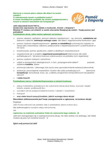 Konkurs „PomóŜ z Emperią” 2011 Marzycie o nowym placu zabaw dla dzieci na swoim osiedlu? O odmalowaniu ławek w pobliskimi parku? A moŜe chcielibyście podzielić się swoimi umiejętnościami z innymi w ramach warsztatów lub korepetycji? Jeśli odpowiedź brzmi TAK to… Serdecznie zapraszamy do udziału w konkursie „PomóŜ z Emperią”! Właśnie TY moŜesz coś zmienić w swoim otoczeniu! Rozejrzyj się wokół – Twoja pomoc jest potrzebna! Przykładowe akcje, jakie moŜna zgłaszać na konkurs: • pomoc szkołom, szpitalom, domom dziecka, bezdomnym - np. remonty, ozdabianie sal, zabawa z dziećmi, animacja wolnego czasu dla dzieci, organizowanie konkursów i gier • pomoc osobom niepełnosprawnym - pomoc w rehabilitacji ruchowej lub wyjazdy na obozy jako wolontariusz, zabawa, przebywanie z niepełnosprawnymi i uczestniczenie w ich Ŝyciu • kwestowanie, pomoc społeczna, udział w zbiórkach charytatywnych • angaŜowanie się w projekty organizacji pozarządowych skierowane dla osób potrzebujących, teŜ praca biurowa wykonywana na potrzeby tych organizacji • pomoc osobom starszym i samotnym • udział w kampaniach ekologicznych, w tym „propagowanie zieleni” sadzenie kwiatów, drzew • promocja zdrowia – zdrowego stylu Ŝycia oraz upowszechnianie edukacji zdrowotnej • edukacja: prowadzenie warsztatów i kursów dla osób potrzebujących, darmowe korepetycje, konsultacje, kursy, np. z zakresu programów komputerowych lub języków obcych • i wiele innych! poprzez Przykładowe rzeczy i działania finansowane w ramach konkursu: • zakup materiałów potrzebnych do wykonania danej akcji (farby, Ŝywność, ksiąŜki, krzesła, papier, podkoszulki itp.) • wynajem sali do przeprowadzenia kursów / szkoleń / warsztatów • transport • oraz wiele innych pozycji budŜetu, jakich wymaga dana akcja! Warunkiem dofinansowania jest Twoje zaangaŜowanie w zgłoszoną na konkurs akcję! Przykład: Jeśli chcesz odnowić lub ozdobić salę w przedszkolu (domu kultury itp.): Nie dofinansujemy wynajmu ekipy remontowej ale zapłacimy za materiały potrzebne Tobie do wykonania tego zadania. ☺ Jeśli sam zaangaŜujesz się w zaproponowaną akcję, nie tylko zrobisz coś dobrego, ale takŜe moŜesz się przy tym świetnie bawić! ☺ Zgłoś swój pomysł juŜ dziś! Oprac. Dział Komunikacji Wewnętrznej i Szkoleń Emperia Holding S.A.