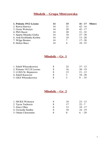 Młodzik – Grupa Mistrzowska 1. Polonia 1912 Leszno 2. Rawia Rawicz 3. Grom Wolsztyn 4. PKS Racot 5. Sparta Miejska Górka 6. Ardi Krobianka Krobia 7. Wilga Brenno 8. Helios Bucz 14 14 14 14 14 14 14 14 33 31 29 20 18 18 7 4 41 - 17 42 - 16 42 - 17 31 - 32 27 - 30 13 - 20 17 - 38 10 - 53 Mistrz Młodzik – Gr. 1 1. Sokół Włoszakowice 2. Polonia 1912 II Leszno 3. LUKS St. Bojanowo 4. Sokół Kaszczor 5. GKS Włoszakowice 8 8 8 8 8 22 16 15 3 3 37 - 12 30 - 19 21 - 13 10 - 28 9 - 35 Młodzik – Gr. 2 1. MUKS Wolsztyn 2. Tęcza Tuchorza 3. Znicz Obra 4. Gwiazda Siedlec 5. Orkan Chorzemin 8 8 8 8 8 18 17 13 10 0 23 - 13 22 - 7 18 - 17 16 - 19 6 - 29 1 Młodzik – Gr. 3 1. Kania II Gostyń 2. Korona Piaski 3. Piast Poniec 4. Wielkopolanka Szelejewo 5. Junior Drobnin 6. RAP Rydzyna 7. Tecza-Osa Osieczna 12 12 12 12 12 12 12 30 27 25 22 18 6 0 56 - 20 41 - 23 40 - 15 20 - 23 28 - 25 18 - 42 7 - 62 Młodzik – Gr. 4 1. AS Czempiń 2. Obra 1912 Kościan 3. LZS Głuchowo 4. Promień Krzywiń 5. Juna-Trans St. Oborzyska 8 8 8 8 8 20 14 11 11 0 32 - 7 19 - 21 26 - 24 34 - 22 9 - 46 Młodzik – Gr. 5 1. Orla Jutrosin 2. Dąbroczanka Pępowo 3. Kania Gostyń 4. Sarnowianka Sarnowa 5. Awdaniec Pakosław 6. Pelikan Dębno Pl. 10 10 10 10 10 10 27 27 18 12 9 0 38 - 9 37 - 16 25 - 18 40 - 33 18 - 47 4 - 39 2