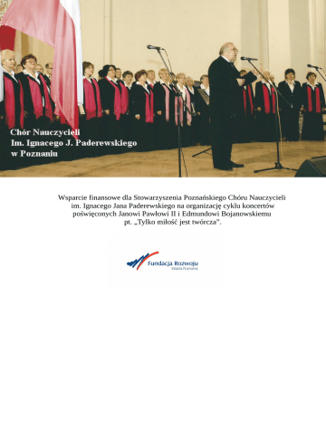 Wsparcie finansowe dla Stowarzyszenia Poznańskiego Chóru Nauczycieli im. Ignacego Jana Paderewskiego na organizację cyklu koncertów poświęconych Janowi Pawłowi II i Edmundowi Bojanowskiemu pt. „Tylko miłość jest twórcza”.