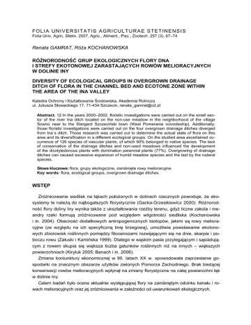 FOLIA UNIVERSITATIS AGRICULTURAE STETINENSIS Folia Univ. Agric. Stetin. 2007, Agric., Aliment., Pisc., Zootech. 257 (3), 67–74 Renata GAMRAT, Róża KOCHANOWSKA RÓŻNORODNOŚĆ GRUP EKOLOGICZNYCH FLORY DNA I STREFY EKOTONOWEJ ZARASTAJĄCYCH ROWÓW MELIORACYJNYCH W DOLINIE INY DIVERSITY OF ECOLOGICAL GROUPS IN OVERGROWN DRAINAGE DITCH OF FLORA IN THE CHANNEL BED AND ECOTONE ZONE WITHIN THE AREA OF THE INA VALLEY Katedra Ochrony i Kształtowania Środowiska, Akademia Rolnicza ul. Juliusza Słowackiego 17, 71-434 Szczecin, [email protected] Abstract. 12 In the years 2000–2002, floristic investigations were carried out on the small sector of the river Ina ditch located on the non-use meadow in the neighborhood of the village Sowno near to the Stargard Szczeciński town (West Pomerania voivodeship). Additionally, those floristic investigations were carried out on the four overgrown drainage ditches diverged from Ina`s ditch. Those research was carried out to determine the actual state of flora on this area and its diversification in a different ecological groups. On the studied area ascertained occurrence of 126 species of vascular plants, of which 90% belonged to native species. The lack of conservation of the drainage ditches and non-used meadows influenced the development of the dicotyledonous plants with domination perennial plants (77%). Overgrowing of drainage ditches can caused excessive expansion of humid meadow species and the last by the ruderal species. Słowa kluczowe: flora, grupy ekologiczne, zarośnięte rowy melioracyjne. Key words: flora, ecological groups, overgrown drainage ditches. WSTĘP Zróżnicowanie siedlisk na łąkach położonych w dolinach rzecznych powoduje, że ekosystemy te należą do najbogatszych florystycznie (Gacka-Grzesikiewicz 2000). Różnorodność flory doliny Iny wynika także z ukształtowania rzeźby terenu, gdyż liczne zakola i meandry rzeki formują zróżnicowane pod względem wilgotności siedliska (Kochanowska i in. 2004). Obecność dodatkowych antropogenicznych biotopów, jakimi są rowy melioracyjne (ze względu na ich specyficzną linię brzegową), umożliwia powstawanie ekotonowych zbiorowisk roślinnych pomiędzy fitocenozami rozwijającymi się na dnie, skarpie i poboczu rowu (Załuski i Kamińska 1999). Dlatego w wąskim pasie przylegającym i sąsiadującym z rowem skupia się większa liczba gatunków roślinnych niż na innych – większych powierzchniach (Kiryluk 2005; Banach i in. 2006). Zmiana koniunktury ekonomicznej w 90. latach XX w. spowodowała zaprzestanie gospodarki na znacznym obszarze użytków zielonych Pomorza Zachodniego. Brak bieżącej konserwacji rowów melioracyjnych wpłynął na zmiany florystyczne na całej powierzchni łąk w dolinie Iny. Celem badań było ocena aktualnie występującej flory na zarośniętym odcinku kanału i rowach melioracyjnych oraz jej zróżnicowania w zależności od uwarunkowań ekologicznych. 68 R. Gamrat i R. Kochanowska MATERIAŁ I METODY W latach 2000–2002 przeprowadzono analizę florystyczną kanału Sowno – około 2 km od jego ujścia do rzeki Ina (rys. 1). Badaniami objęto zarośnięty odcinek kanału oraz odchodzące od niego cztery, także zarośnięte rowy melioracyjne wraz z ich prawo- i lewobrzeżną strefą ekotonową z łąką, tj. ze skarpami i z poboczami rowów. Średnia głębokość wody w rowach w okresie badań (w sezonie wegetacyjnym) wahała się od 0,1 do 0,3 m. Długość rowów wynosiła 840 m (w tym odcinka kanału „a” – 220 m oraz rowu „b” – 185 m, „c” – 180 m, „d” – 145 m i „e” – 110 m). 2 Skala – Scale 1 1: 1000 –1 –2 Rys. 1. Lokalizacja obszaru badań 1 – Puszcza Goleniowska, 2 – zbiorowiska łąkowe, a – odcinek kanału Sowno, b–e – rowy melioracyjne. Fig. 1. Location of the studied area 1 – Goleniowska Forest, 2 – meadow communities, a – section of the canal Sowno, b–e – drainage ditches. Szerokość badanej strefy roślinnej wahała się od dwu do czterech metrów. Łączna powierzchnia obszaru badań wynosiła około 2,5 ha. Analizę flory występującej w rowach oraz w strefie ekotonowej na danym obszarze, pod kątem przynależności poszczególnych gatunków do grup ekologicznych, tj. form życiowych, historyczno-geograficznych, synantropodynamicznych, socjologiczno-ekologicznych i frekwencji, wykonano według Chmiela (1993). Do oceny częstości występowania gatunków zastosowano pięciostopniową skalę, w której liczba pięć wskazuje gatunek obecny na pięciu odcinkach, cztery – na czterech, trzy – na trzech, dwa – na dwóch odcinkach, a jeden – na jednym odcinku. Nazewnictwo gatunków oraz rodzin podano za Rutkowskim (2004). Różnorodność grup ekologicznych flory dna... 69 WYNIKI Na powierzchni ok. 2,5 ha dna oraz strefy ekotonowej zarastającego odcinka kanału Sowno oraz czterech także zarastających rowów melioracyjnych stwierdzono występowanie 126 gatunków roślin naczyniowych, spośród których 25 występowało na wszystkich (pięciu) odcinkach badanego obiektu (tab. 1). Przeważały liczebnie rośliny występujące tylko na jednym lub na dwóch odcinkach badanego obiektu – 81 gatunków. Tabela 1. Częstotliwość występowania gatunków według skali 5-stopniowej Table 1. Frequency of occurrence species according to proposed scale Nazwa gatunku Name of species Bluszczyk kurdybanek Glechoma hederacea, jaskier ostry Ranunculus acris, jasnota purpurowa Lamium purpureum, karbieniec pospolity Lycopus europaeus, kłosówka wełnista Holcus lanatus, knieć błotna Caltha palustris, komonica błotna Lotus uliginosus, konyza kanadyjska Conyza canadensis, krwawnik pospolity Achillea millefolium, manna mielec Glyceria maxima, mozga trzcinowata Phalaris arundinacea, ostrożeń polny Cirsium arvense, o. warzywny C. oleraceum, perz właściwy Elymus repens, pięciornik gęsi Potentilla anserina, pokrzywa zwyczajna Urtica dioica, przytulia czepna Galium aparine, si