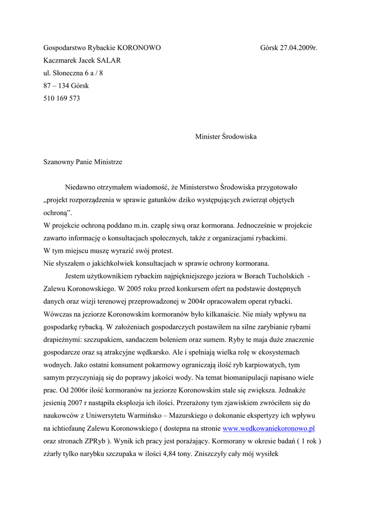 Górsk 27.04.2009r. Gospodarstwo Rybackie KORONOWO Kaczmarek Jacek SALAR ul. Słoneczna 6 a / 8 87 – 134 Górsk 510 169 573 Minister Środowiska Szanowny Panie Ministrze Niedawno otrzymałem wiadomość, że Ministerstwo Środowiska przygotowało „projekt rozporządzenia w sprawie gatunków dziko występujących zwierząt objętych ochroną”. W projekcie ochroną poddano m.in. czaplę siwą oraz kormorana. Jednocześnie w projekcie zawarto informację o konsultacjach społecznych, także z organizacjami rybackimi. W tym miejscu muszę wyrazić swój protest. Nie słyszałem o jakichkolwiek konsultacjach w sprawie ochrony kormorana. Jestem użytkownikiem rybackim najpiękniejszego jeziora w Borach Tucholskich Zalewu Koronowskiego. W 2005 roku przed konkursem ofert na podstawie dostępnych danych oraz wizji terenowej przeprowadzonej w 2004r opracowałem operat rybacki. Wówczas na jeziorze Koronowskim kormoranów było kilkanaście. Nie miały wpływu na gospodarkę rybacką. W założeniach gospodarczych postawiłem na silne zarybianie rybami drapieżnymi: szczupakiem, sandaczem boleniem oraz sumem. Ryby te maja duże znaczenie gospodarcze oraz są atrakcyjne wędkarsko. Ale i spełniają wielka rolę w ekosystemach wodnych. Jako ostatni konsument pokarmowy ograniczają ilość ryb karpiowatych, tym samym przyczyniają się do poprawy jakości wody. Na temat biomanipulacji napisano wiele prac. Od 2006r ilość kormoranów na jeziorze Koronowskim stale się zwiększa. Jednakże jesienią 2007 r nastąpiła eksplozja ich ilości. Przerażony tym zjawiskiem zwróciłem się do naukowców z Uniwersytetu Warmińsko – Mazurskiego o dokonanie ekspertyzy ich wpływu na ichtiofaunę Zalewu Koronowskiego ( dostepna na stronie www.wedkowaniekoronowo.pl oraz stronach ZPRyb ). Wynik ich pracy jest porażający. Kormorany w okresie badań ( 1 rok ) zżarły tylko narybku szczupaka w ilości 4,84 tony. Zniszczyły cały mój wysiłek zarybieniowy. Jednakże wyjadając szczupaka niszczą także i Zalew Koronowski. Przyczyniają się do wzrostu jego eutrofizaji. Panie Ministrze, rybacy chcąc przeżyć będą zmuszeni do zmiany sposobu gospodarowania. Chroniąc kormorany, doprowadzimy do zagłady koregonidów oraz ryb drapieżnych. Wówczas oprzemy gospodarkę na rybach karpiowatych. Tylko one pozostają. Panie Ministrze, chroniąc kormorany zniszczycie koregonidy i ryby drapieżnie. Przepisami „chroniącymi” łatwo zniszczyć gatunki rodzime. Przykładem niech będzie nasz rodzimy Łosoś atlantycki. To przepisy jego chroniące całkowicie go w Polsce zniszczyły. Dzisiaj wydajemy kilka milionów na restytucję łososiowatych. Jednakże występujący w Polsce łosoś ma „zagraniczne” pochodzenie. Niech powyższe będzie przestrogą. Jeszcze parę lat a w rzekach i jeziorach pod wpływem ochrony kormoranów doprowadzimy do klęski ekologicznej. Wówczas naprawa szkód dokonanych przez kormorany będzie bardzo kosztowna. Apeluję, przed decyzji o ochronie kormorana, czapli oraz wydry, proszę o sporządzenie ekspertyzy określającej wielkość ich populacji, tempa rozwoju oraz wpływu na ichtiofaunę. Jacek Kaczmarek Użytkownik rybacki Do wiadomości 1. a/a 2. Ministerrswo Rolnictwa 3. Sekretarz Stanu K. Plocke 4. Andrzej Abramczyk – Prezes ZPRyb, oddział Iława